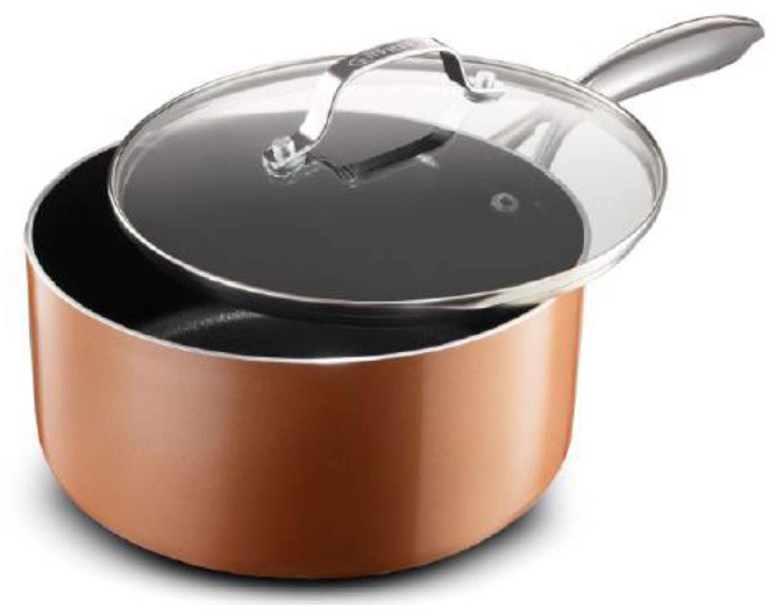 As Seen On TV Gotham Steel Diamond Cast Textured Sauce Pan with Lid has a coating that's infused with titanium and cast textured which makes it durable enough to withstand metal utensils