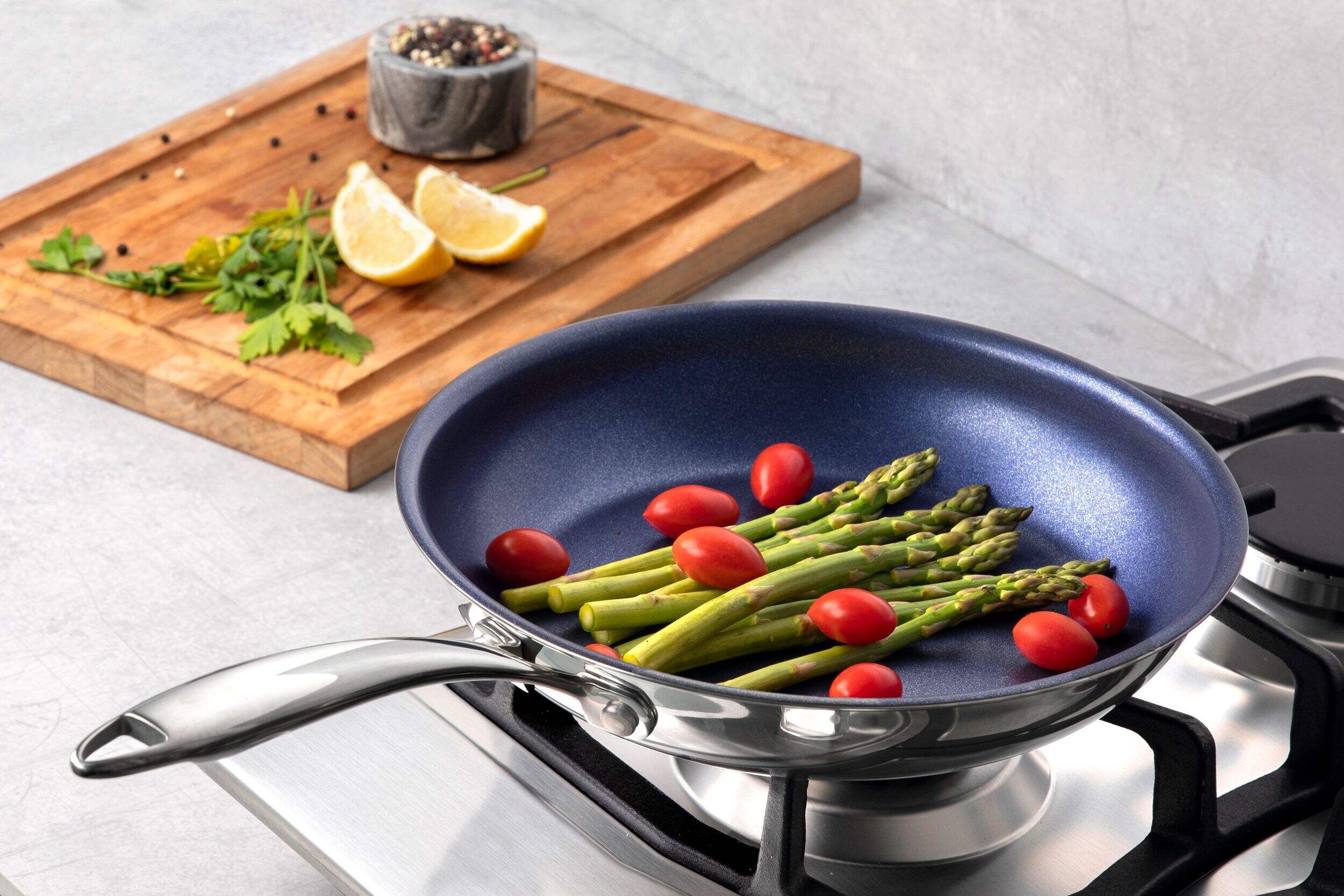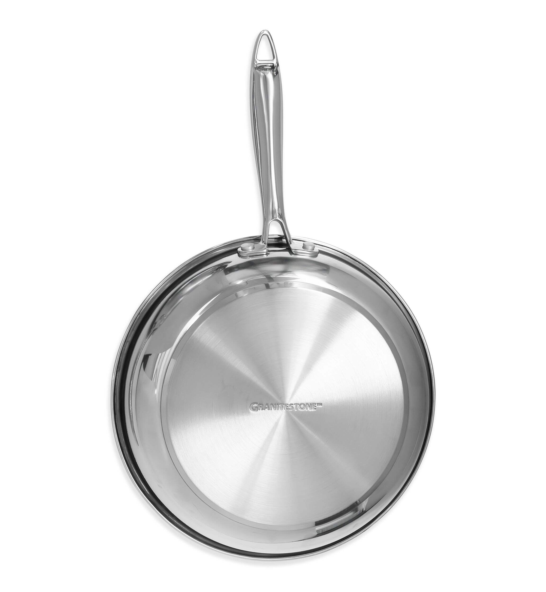 Ergonomic stainless steel handles remain cool during cooking for added safety