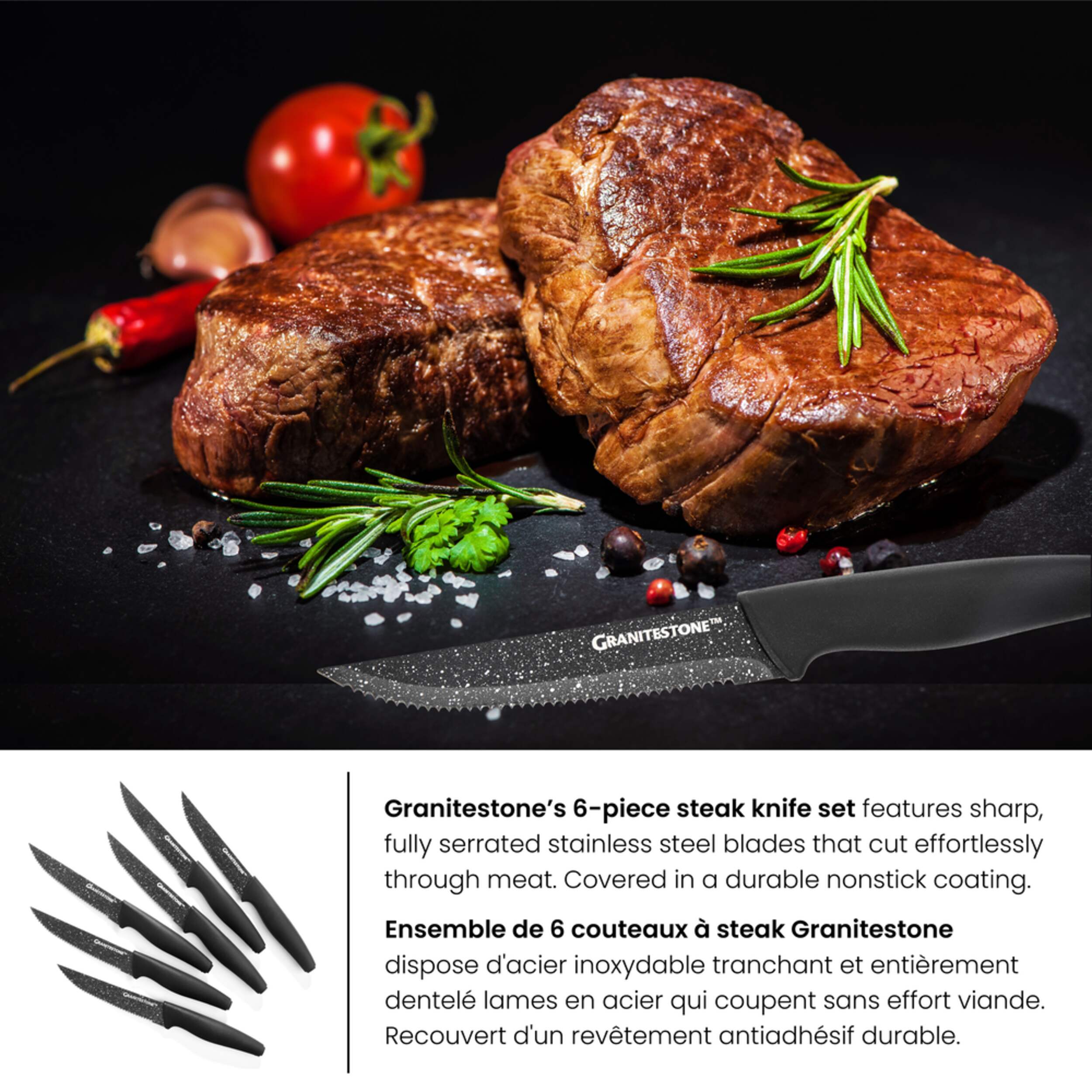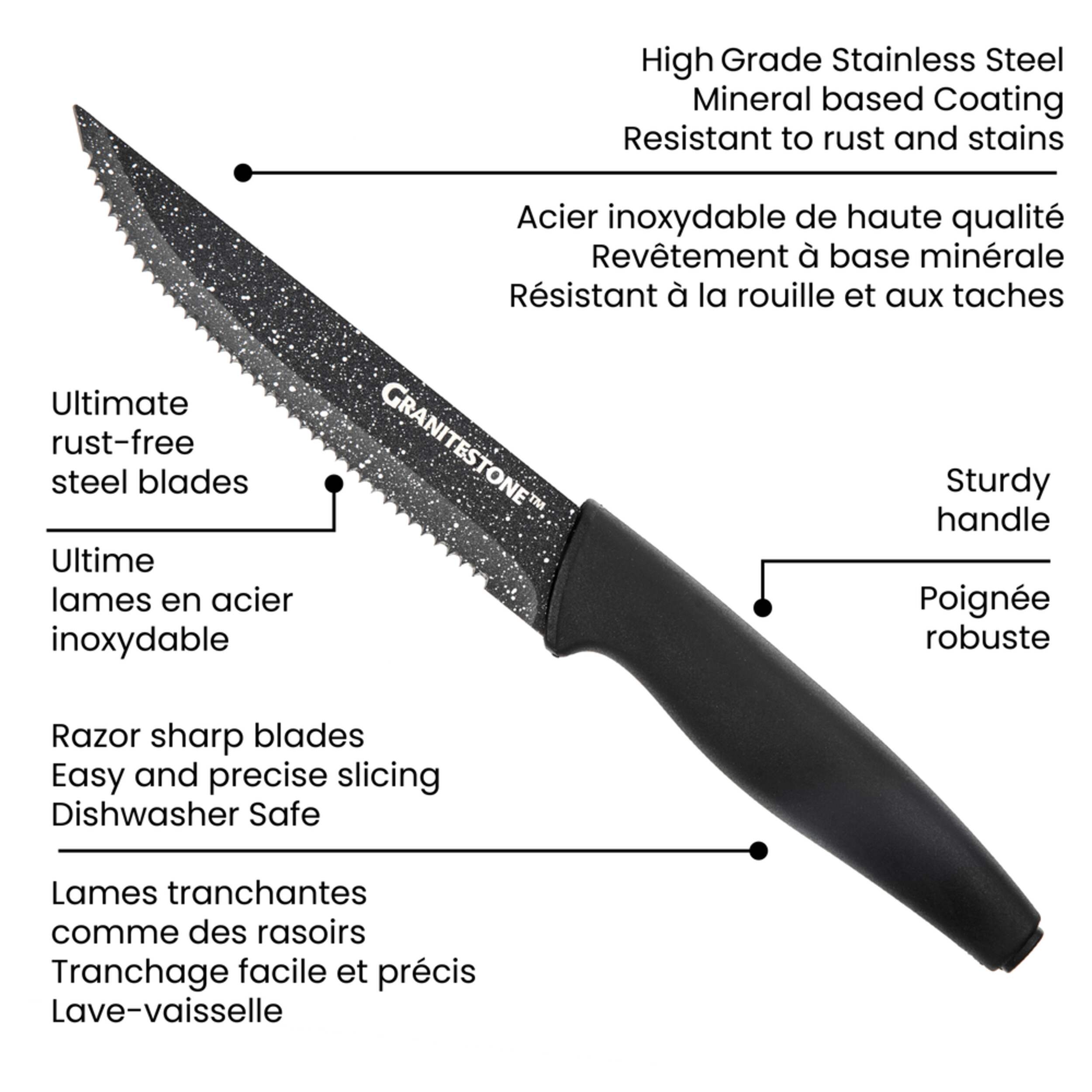 As Seen On TV Granitestone’s Steak Knife Set features sharp, fully serrated stainless steel blades that cut effortlessly through meat