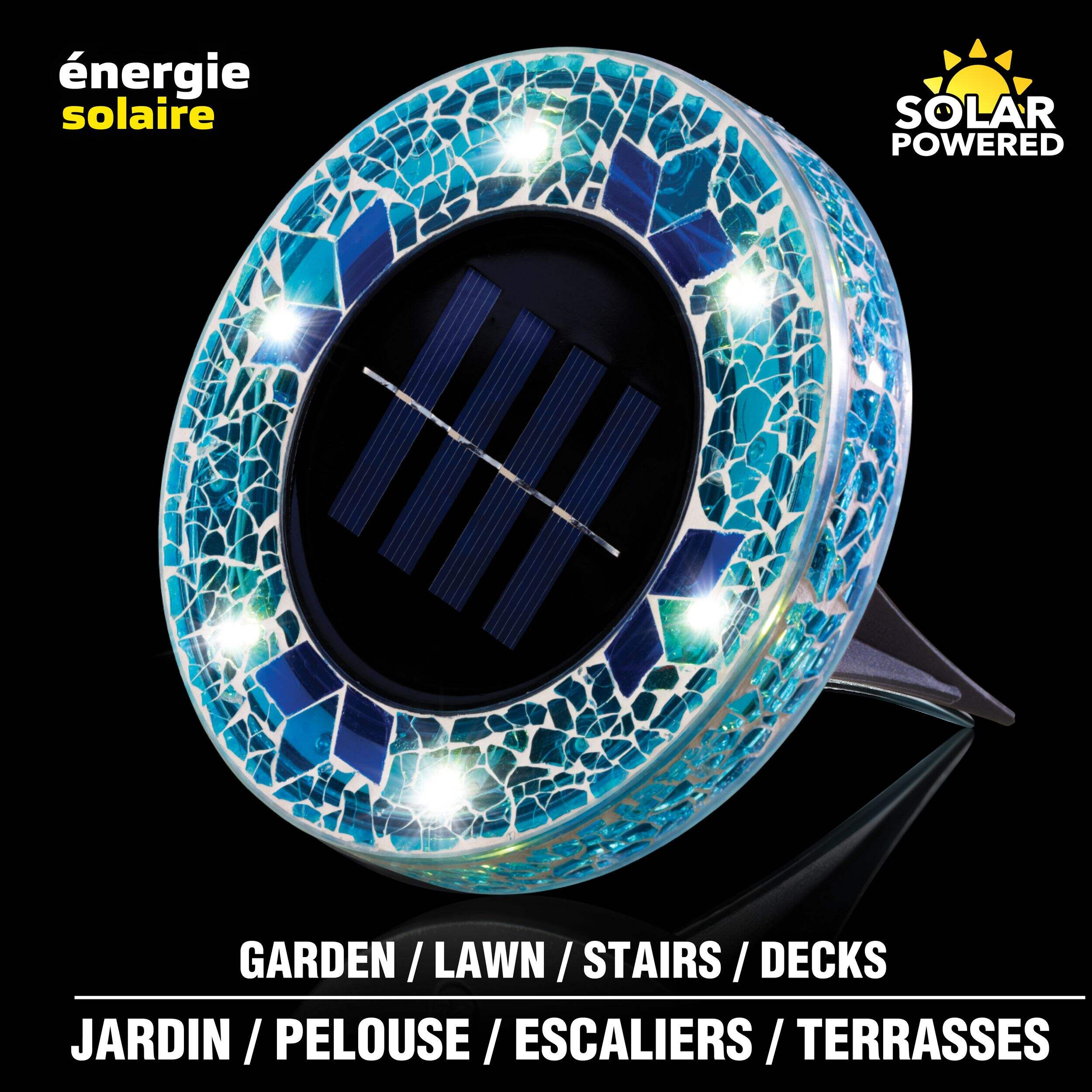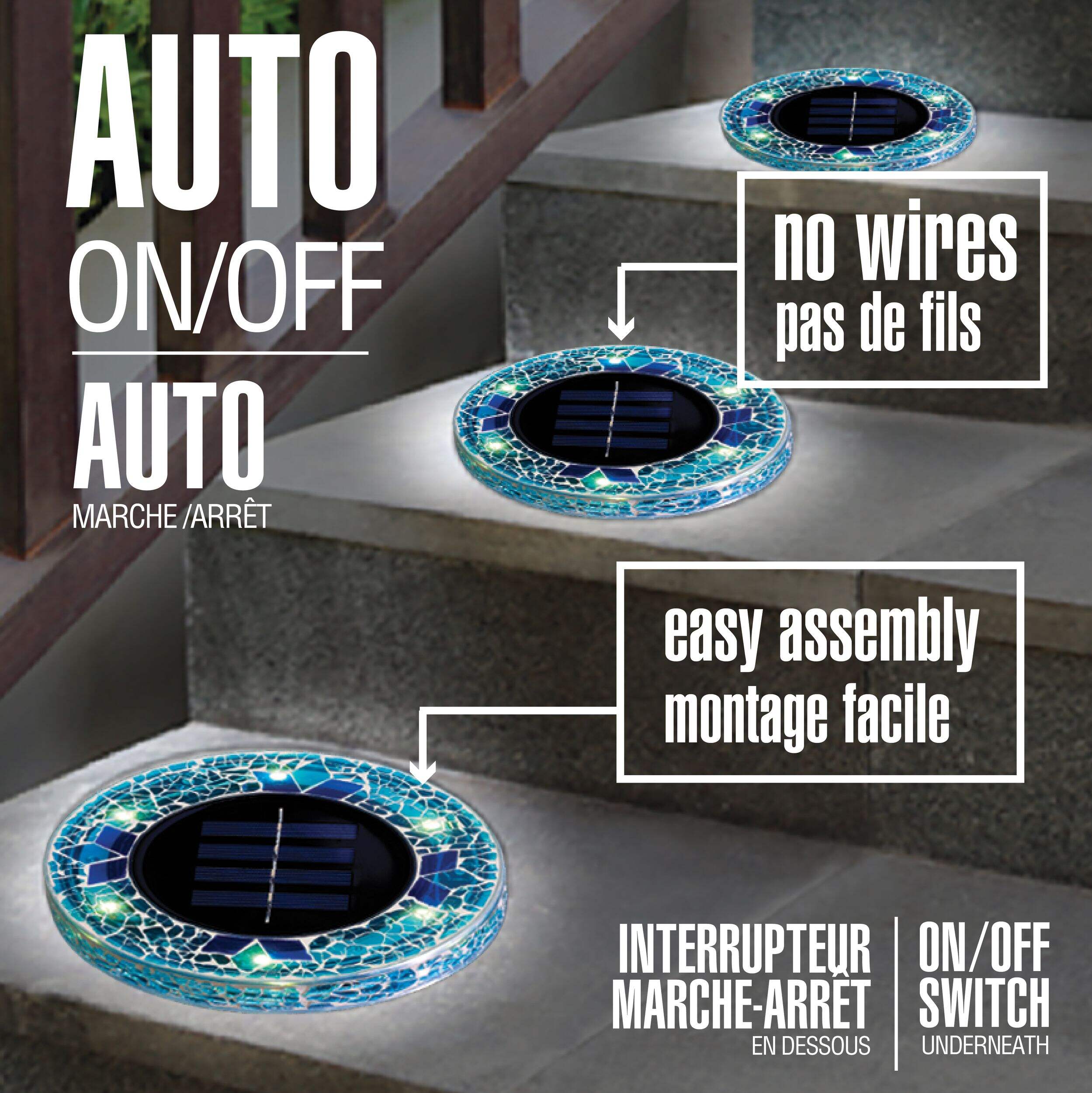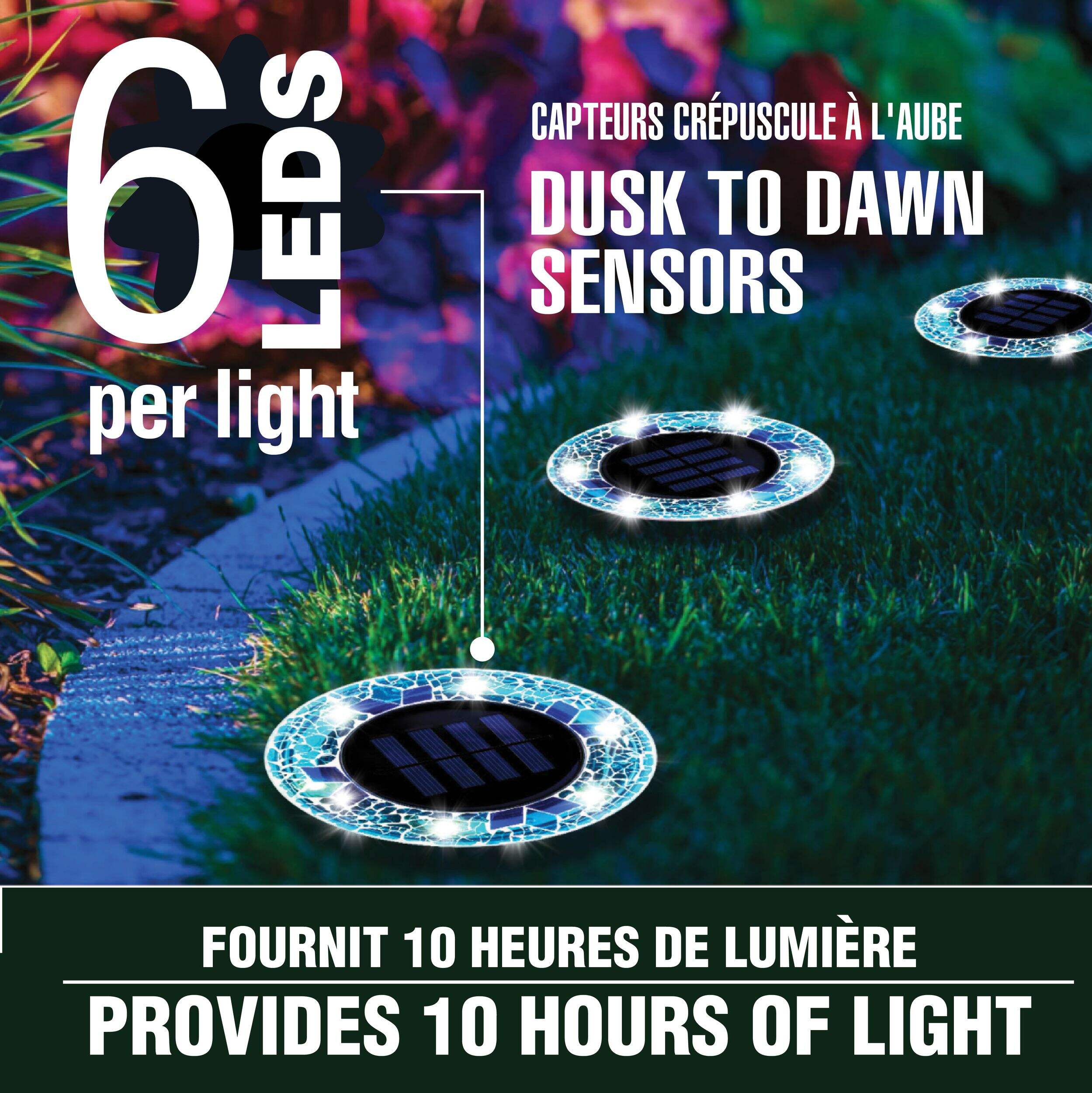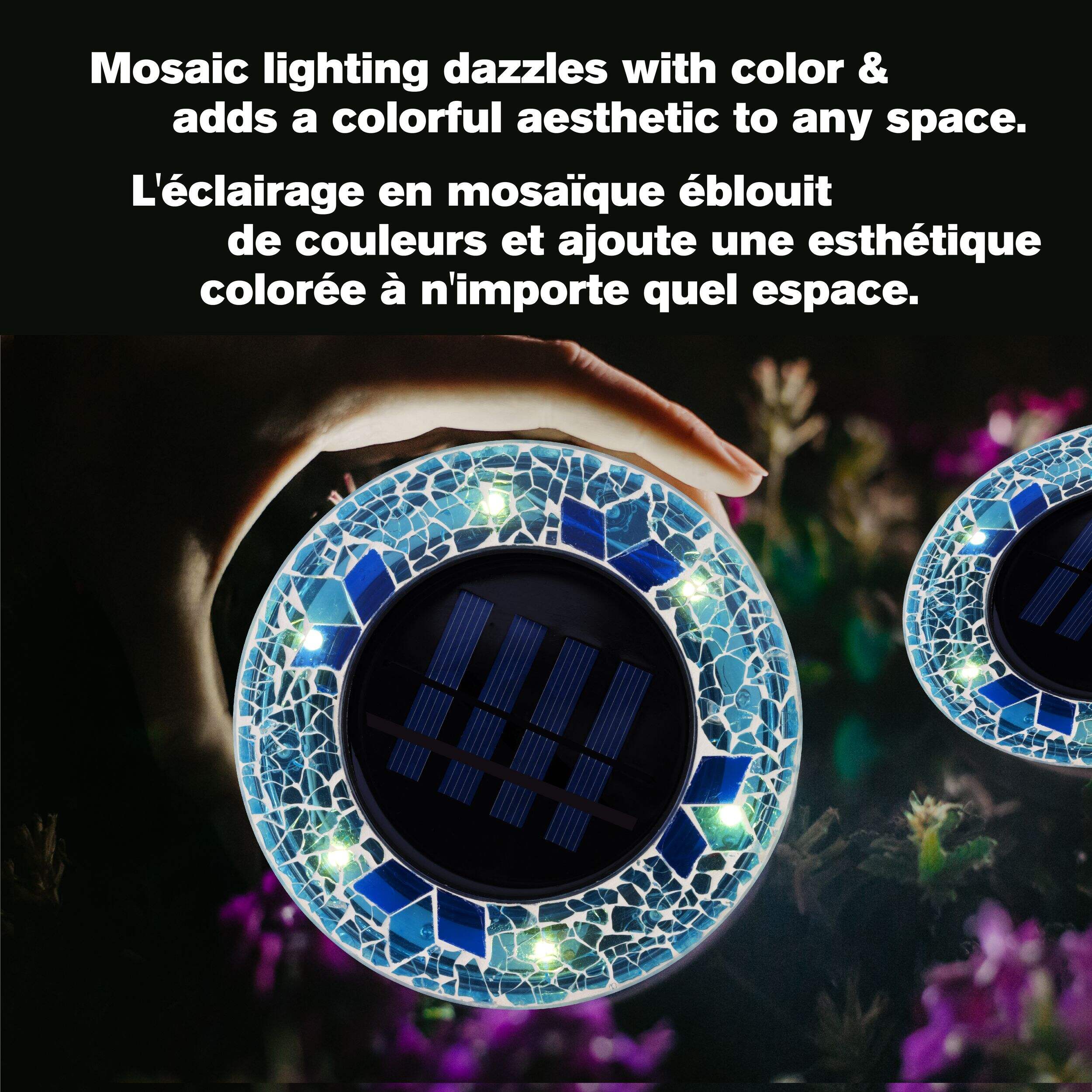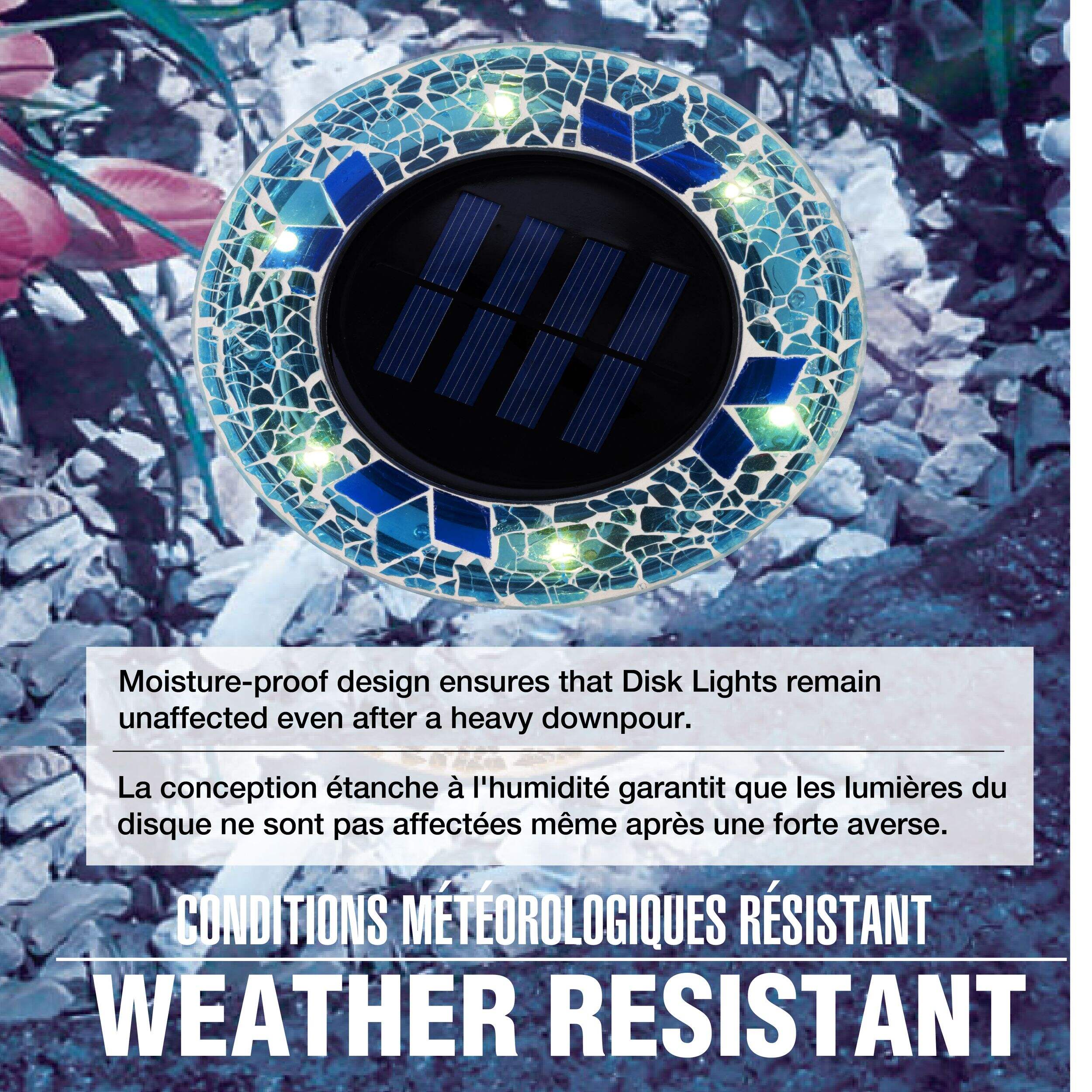 These solar-powered mosaic disk lights instantly upgrade any outdoor space. Each light features six super-bright LEDs inside a rust-proof, water-resistant housing shaped like mosaic stones. Simply remove from the box and place outside to illuminate pathways, gardens, stairs and more. During the day, the large solar panel accumulates power from the sun and at night the LEDs turn on automatically, providing around 10 hours of illumination. The automatic on/off function turns the lights on at dusk and off at dawn, or they can be manually switched off using the button on the bottom. Quick and easy to set up with included stakes, the disk lights maintain their position even in heavy weather due to the four-corner stakes. The durable glass casings are meant to last for years without needing replacements. Additional disk lights can be purchased and added to expand the configuration.