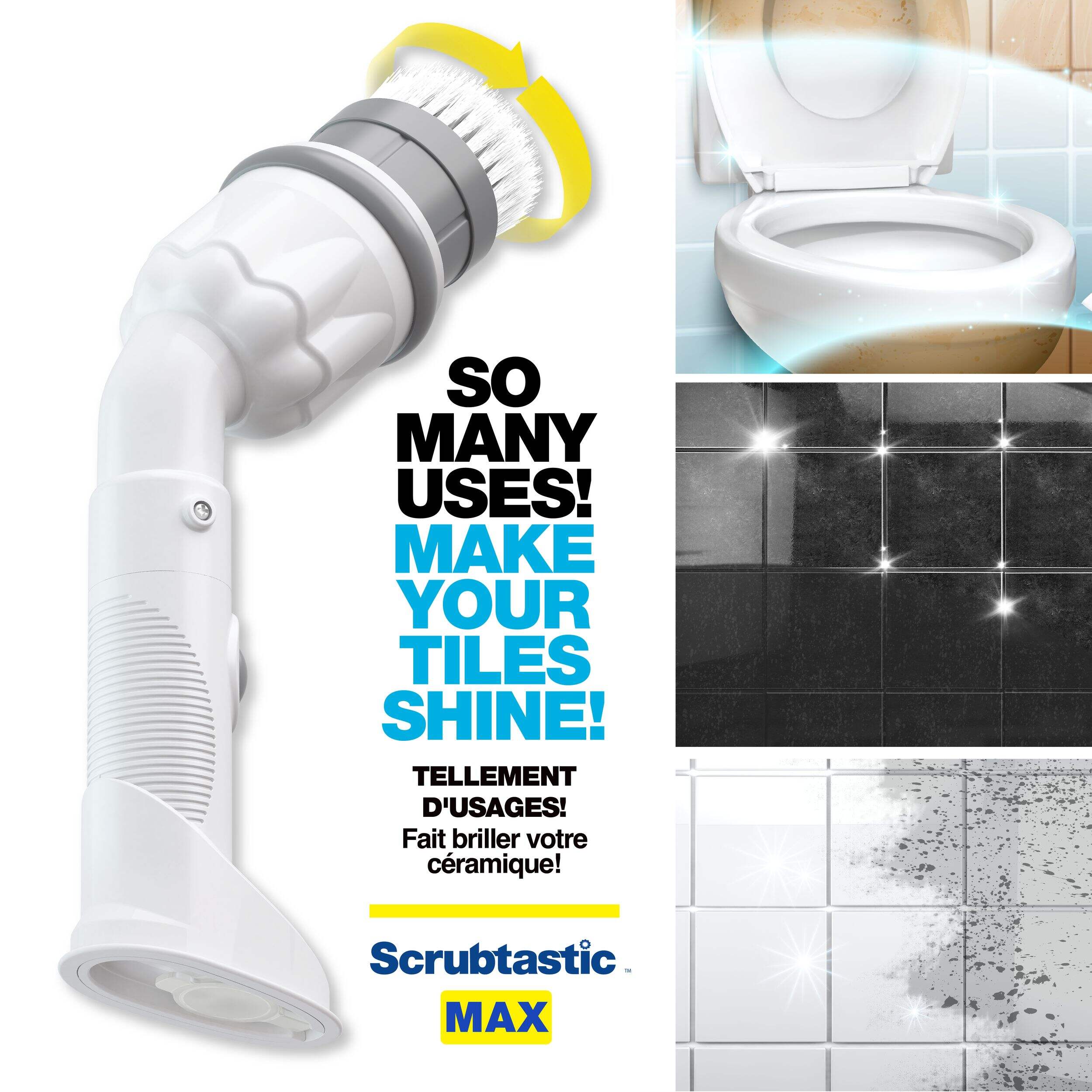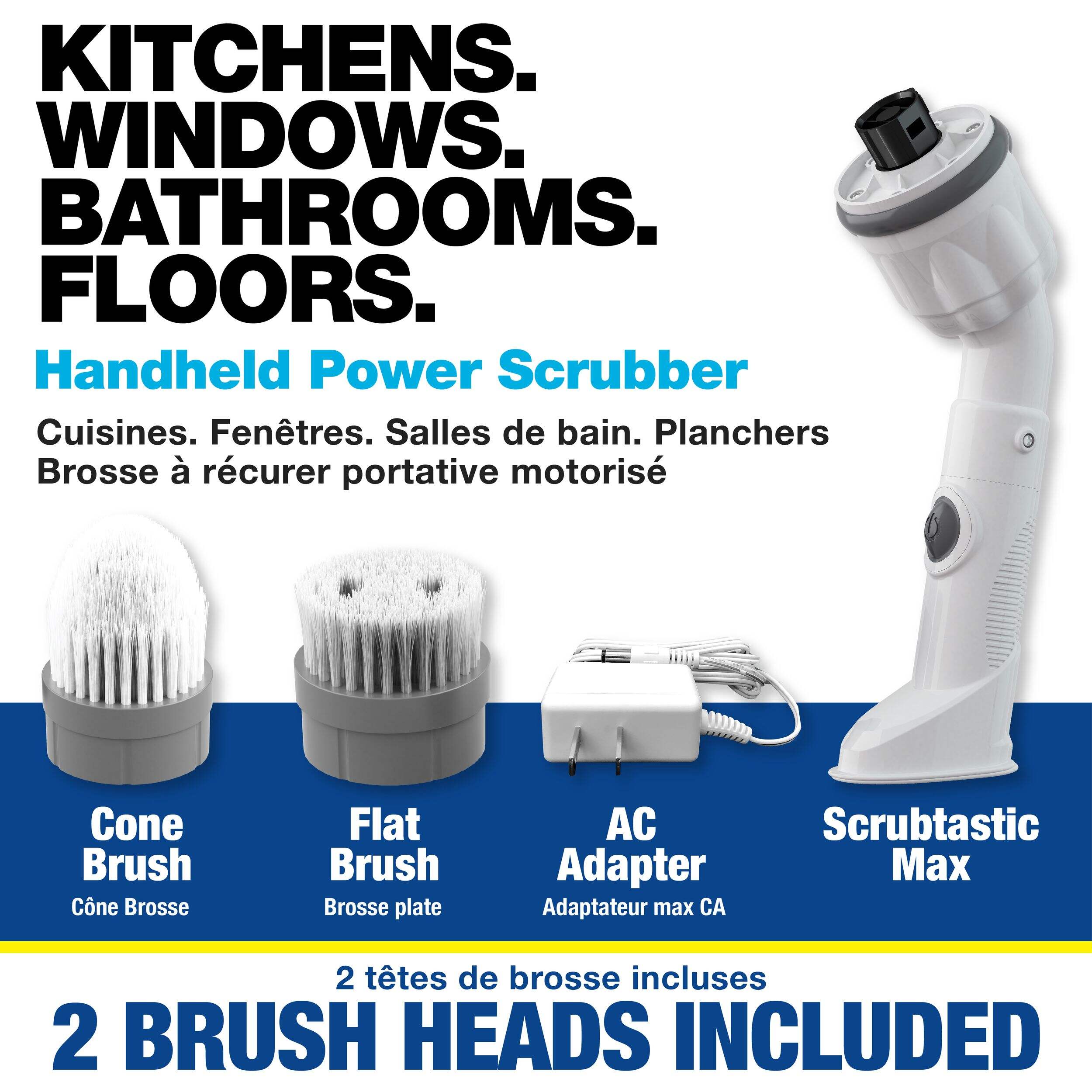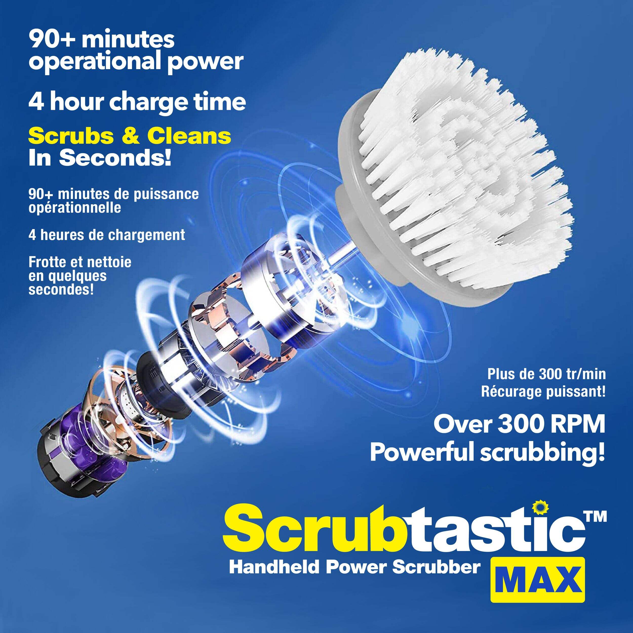 The As Seen on TV Scrubtastic Max Powerful Handheld Scrubber makes quick work of tough cleaning jobs. The rechargeable, cordless design lets you scrub counters, tiles, sinks and more with 300 revolutions per minute of scrubbing power. Its dual brush heads - a cone brush and flat brush - tackle everything from kitchen stoves to bathtub grout. No batteries required and charges in just 4 hours for up to 90 minutes of scrub time, making it perfect for a deep clean of the whole house in one go.