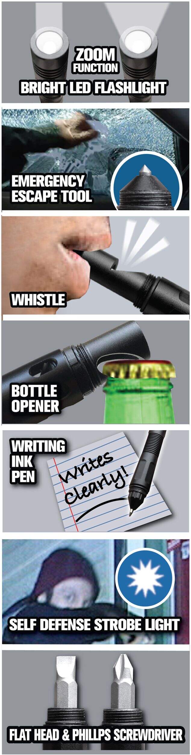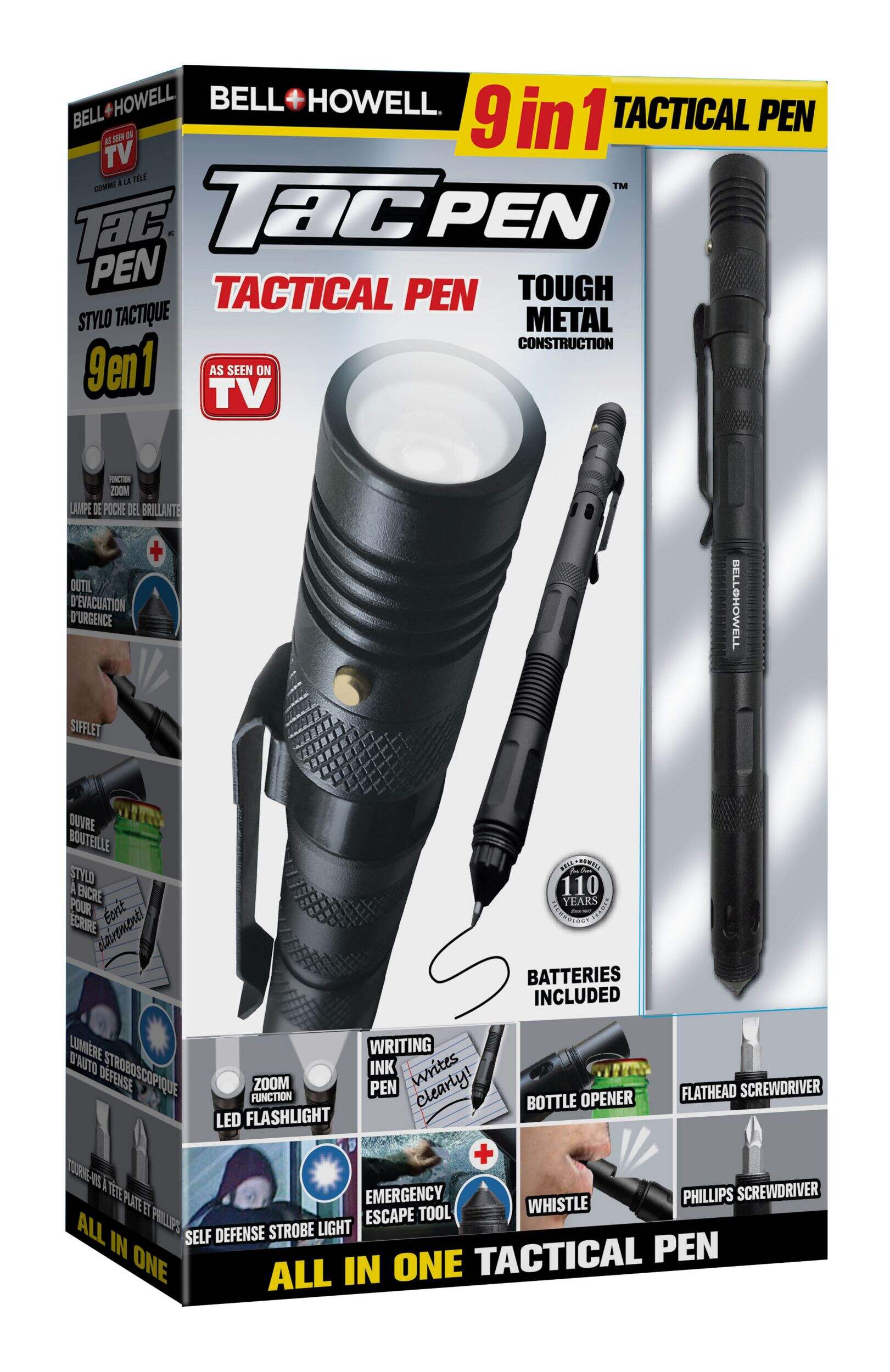 The As Seen On TV Tactical Pen packs a surprising amount of utility into a compact size. Constructed from durable high-grade aluminum, this tiny tool can serve multiple purposes. Keep one in your car, kitchen, or bedroom to take advantage of a mini flashlight, multi-tool, and working pen all at once. The military-inspired design allows it to work in extreme temperatures, while the pen's body allows it to double as an emergency escape tool - all while writing as a normal ballpoint pen.