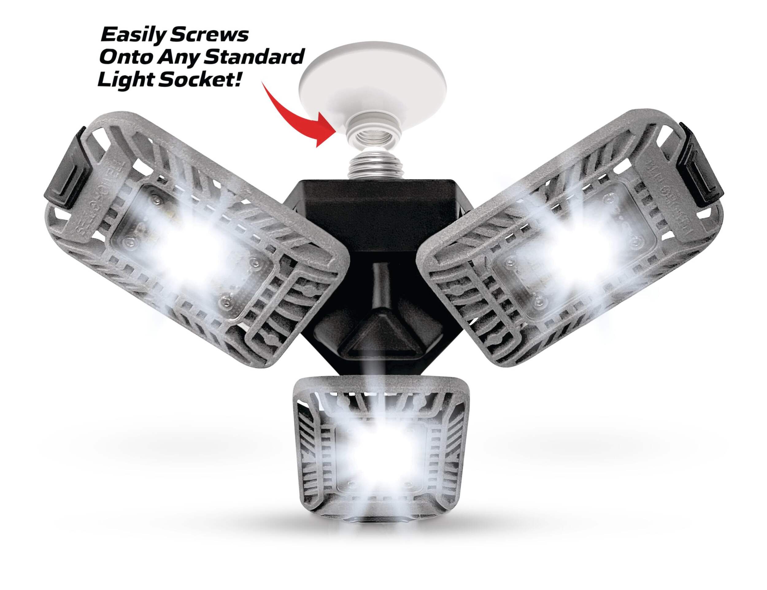 Brighten up dark spaces like basements, attics, and garages with the As Seen On TV Triburst LED Triple Panel Socket Light. Simply screw it into any standard light socket and enjoy powerful, ultra-bright illumination. With three adjustable LED panels featuring 144 high-intensity bulbs, you can direct light exactly where you need it. Perfect for hands-free tasks, repairs, or finding things in those hard-to-reach spots.