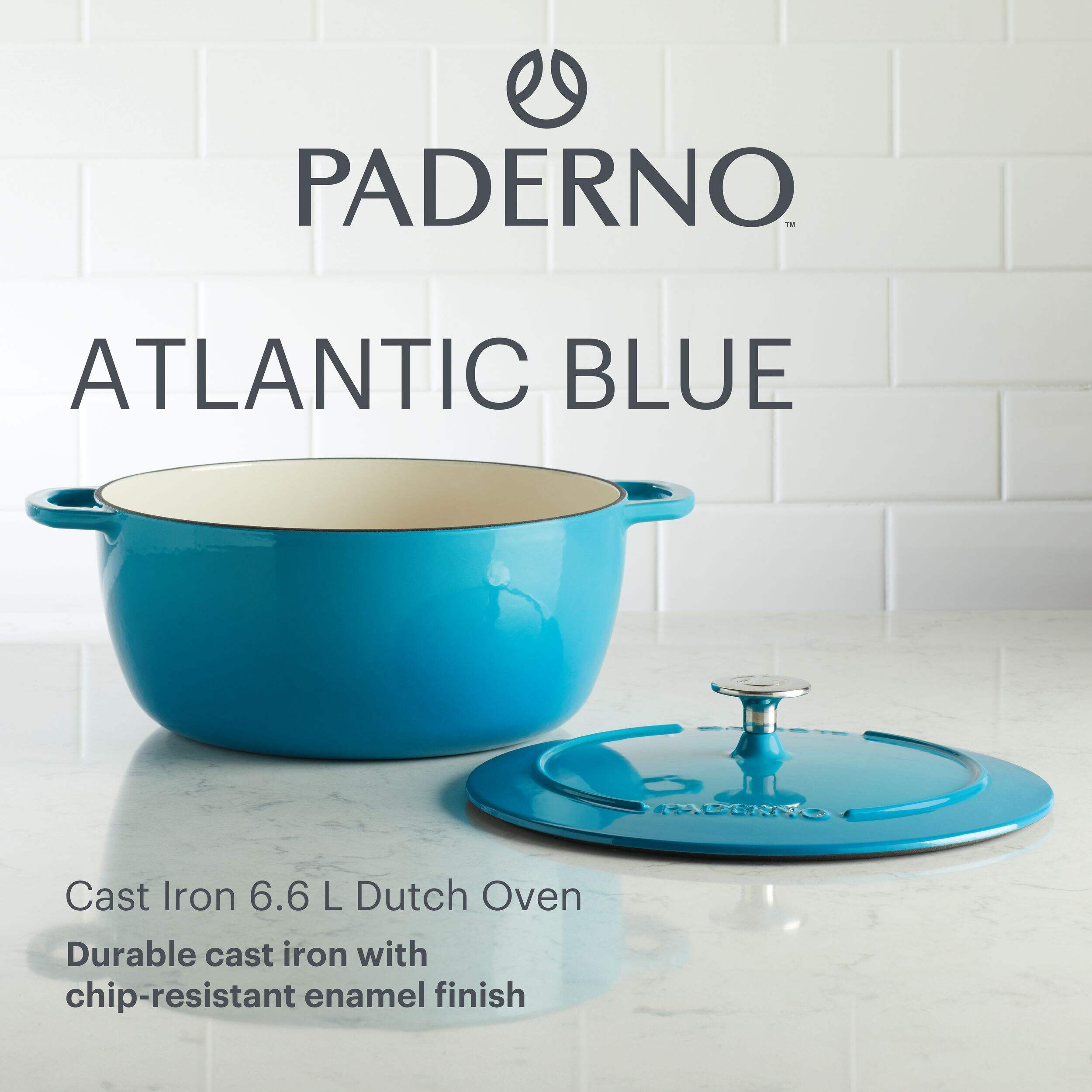 The PADERNO Cast Iron Dutch Oven, 6.6-L (7 qt) combines elegance and practicality, making it a must-have for any kitchen. Its droplet design concentrates moisture and returns it to the food, resulting in tender, flavorful meals. Raised rings direct moisture away from the edges to enhance the self-basting effect, ensuring perfect results every time. Ideal for braising, baking, frying, and more, this Dutch oven features an ergonomic handle for comfortable use. Its vibrant Atlantic Blue colour adds a stylish touch to your kitchen while making gourmet cooking easy and enjoyable.