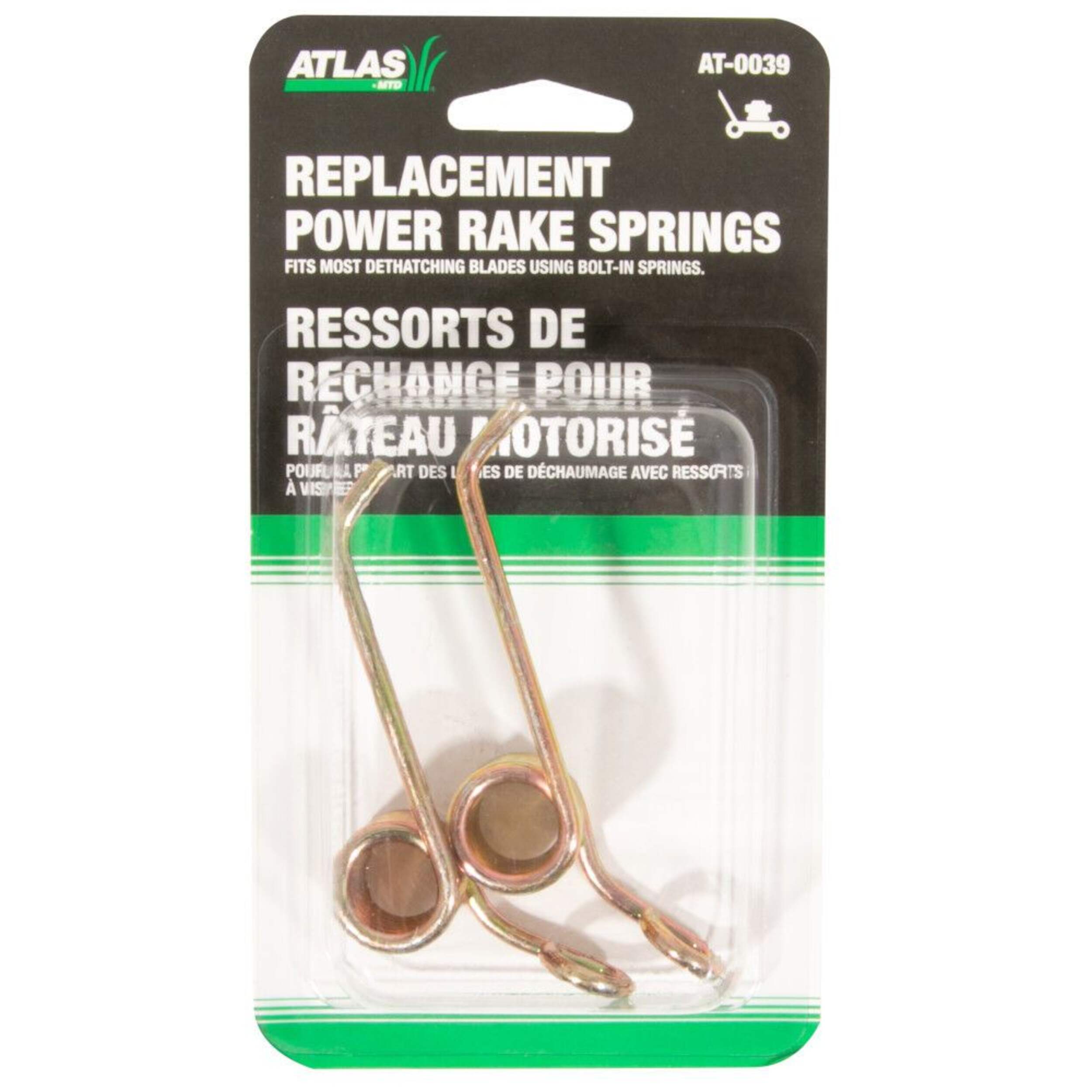 The Atlas Thatcher Steel Bolt-On RePlacement Springs includes two steel springs designed for older style lawn mower dethatching blades. These heavy-duty springs help keep mower blades firmly attached while detaching dead grass and weeds, helping you maintain a pristine looking lawn. Simply snap springs onto existing dethatching blades to give blades a new lease on life.