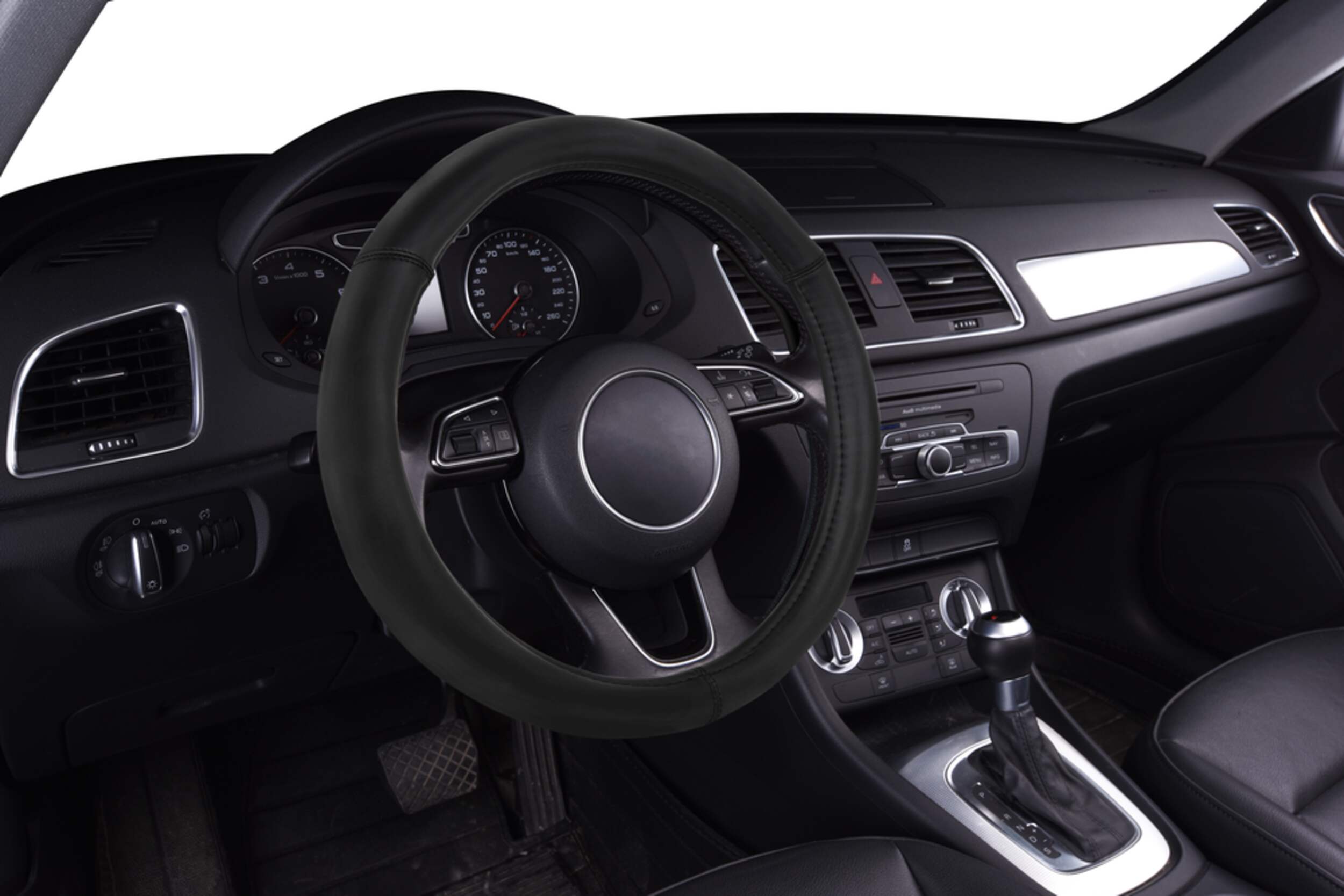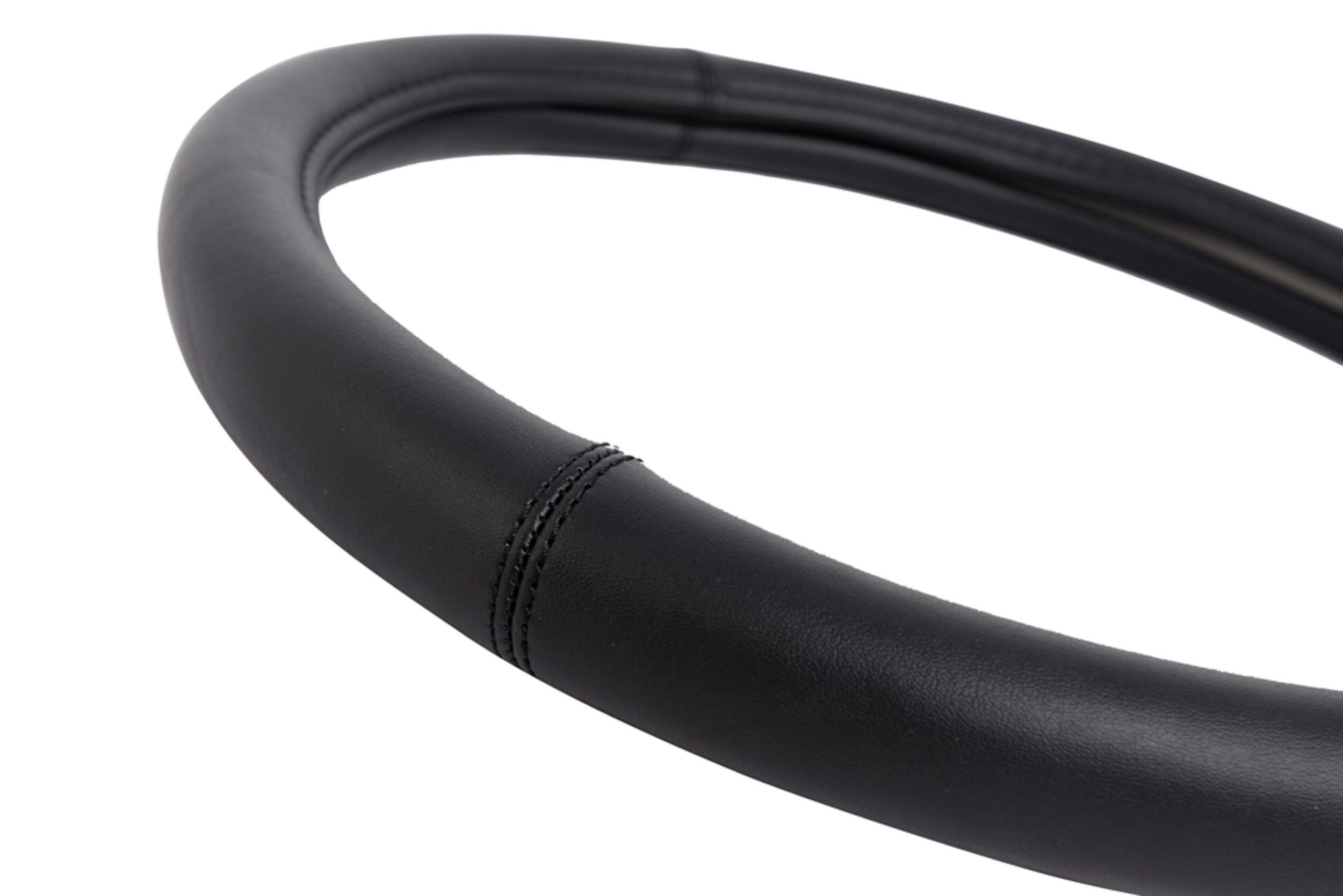 The AutoTrends Faux Leather Smooth Truck Steering Wheel Cover, Black, is made to keep your truck's steering wheel protected. The durable cover increases the life of the steering wheel. With this vehicle steering wheel cover, you can stay rest assured that the steering wheel remains clean and is protected against sun damage, wear and tear, scratches, and more. Besides, it also improves your comfort during driving and provides a better grip. This truck steering cover fits steering wheels with 15 3/4 inches (40 cm) diameter and is extremely easy to install.
