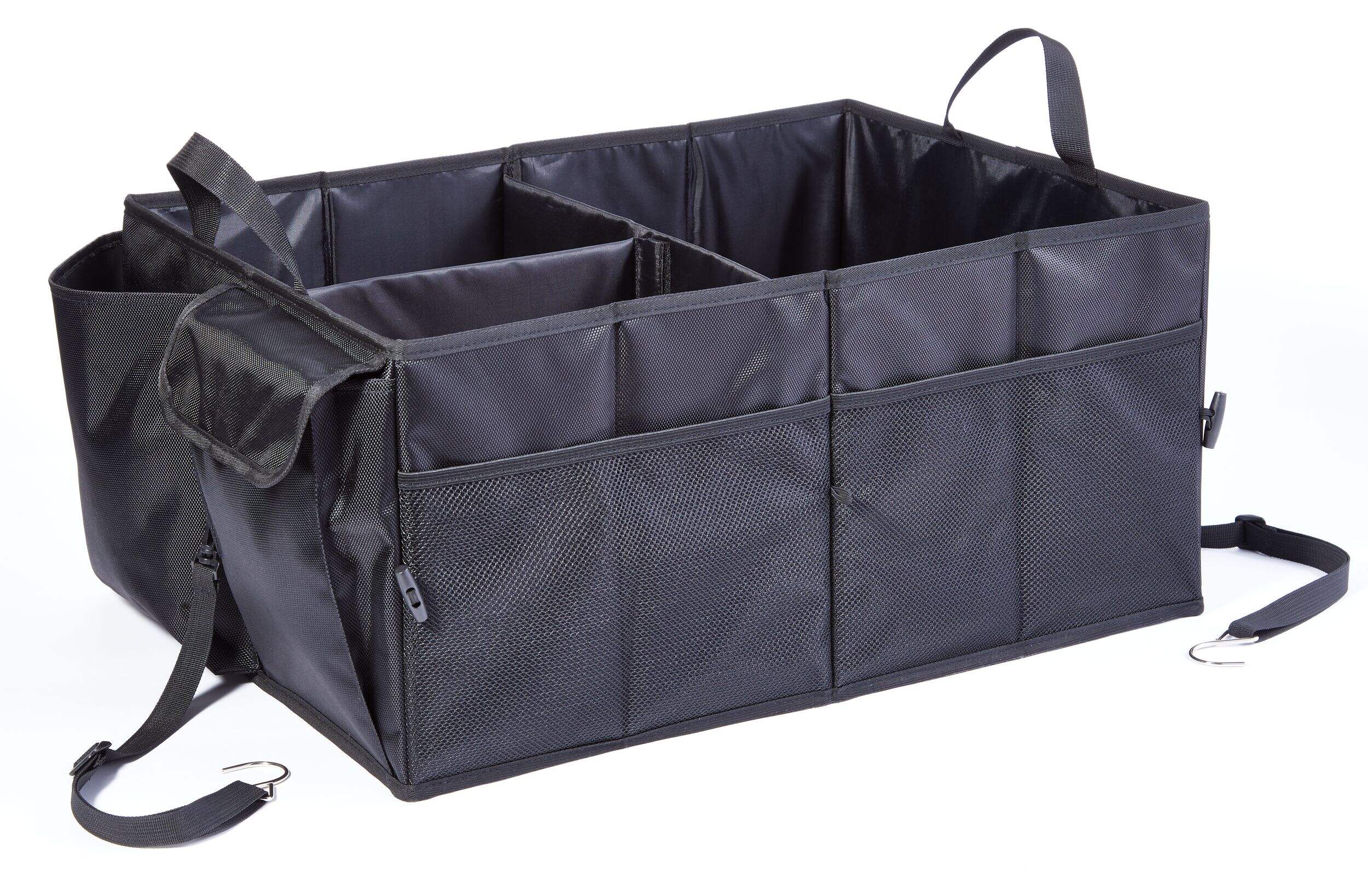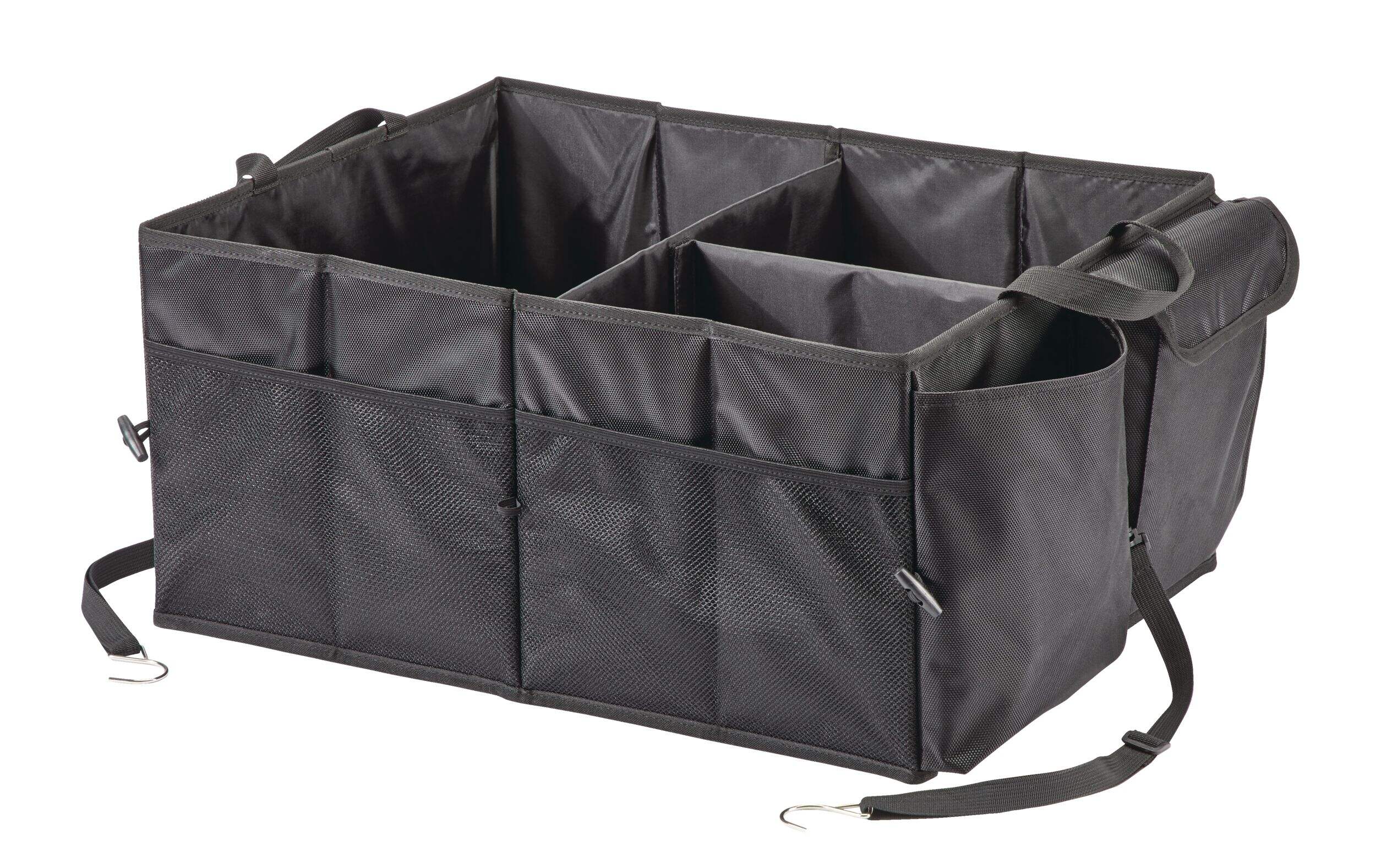 Keep your vehicle tidy with the AutoTrends Heavy-Duty Trunk Organizer. This convenient organizer features removable dividers, creating versatile and personal storage options. The organizer offers plenty of space to store auto supplies, emergency equipment and more. It's collapsible for effortless storage and transport. Hooks on each side ensure the organizer stays in place and webbed handles at either end make it easy to move. Its durable construction ensures longevity.