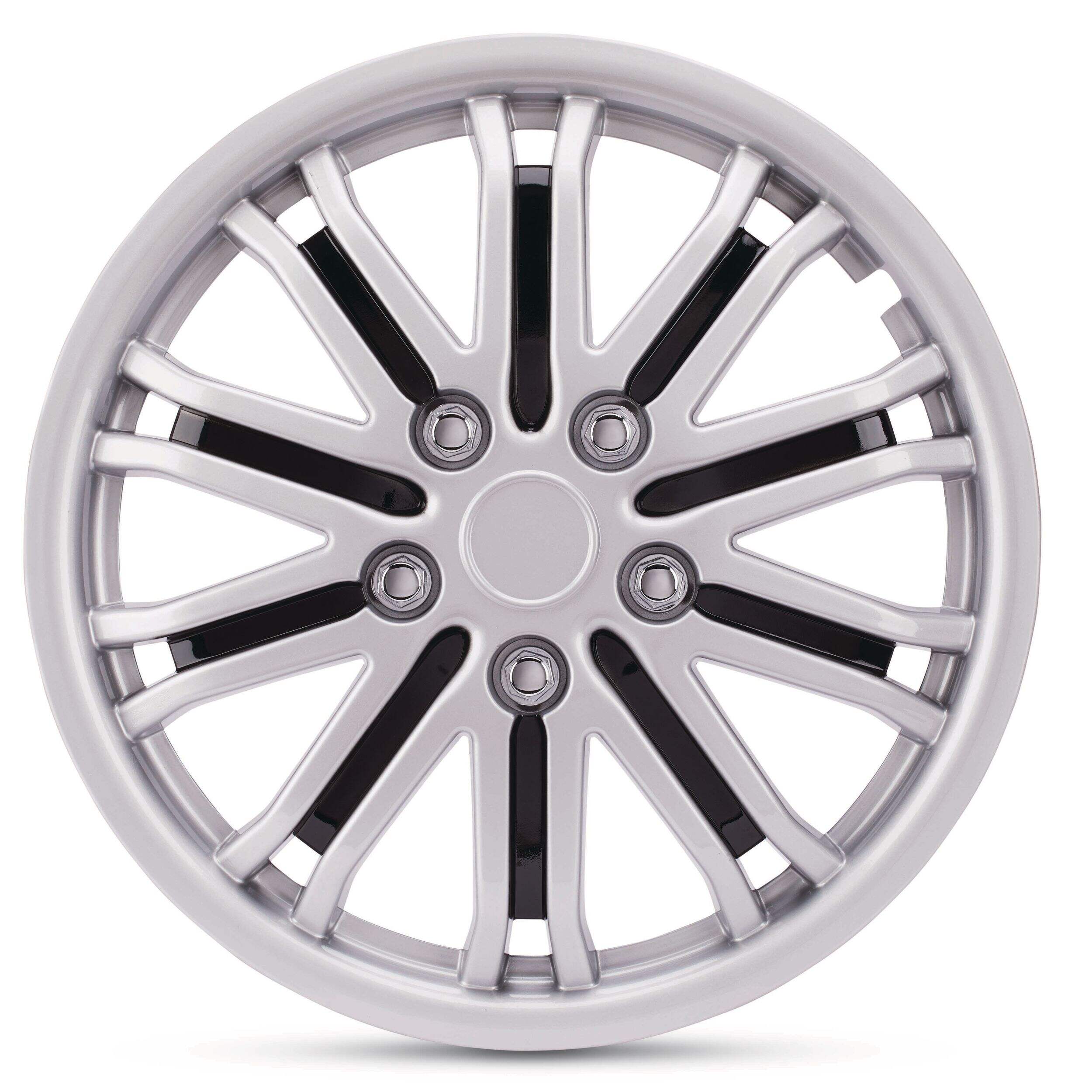 The AutoTrends Silver/Black 18-in Wheel Cover/Hub Cap set brings a stylish and modern look to your vehicle’s wheels. Made from high-quality ABS plastic, these covers provide a durable, protective layer that shields your wheels from dirt, debris, and minor damage. The snap-on design allows for quick and easy installation, ensuring a secure fit. Ideal for upgrading your vehicle's appearance, these covers deliver both style and function with their sleek silver and black design.