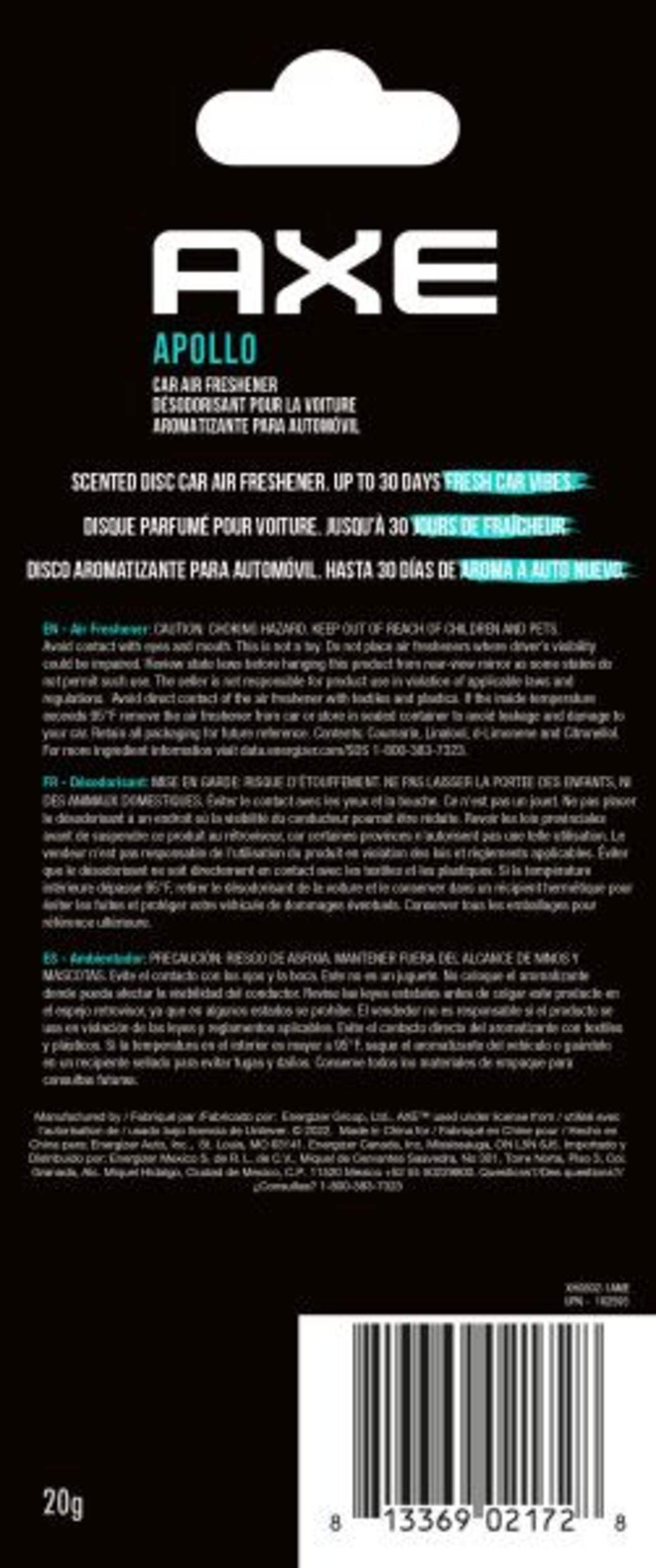 Made from black PP (Polypropylene), these car air fresheners release an authentic AXE fragrance for up to 30 days