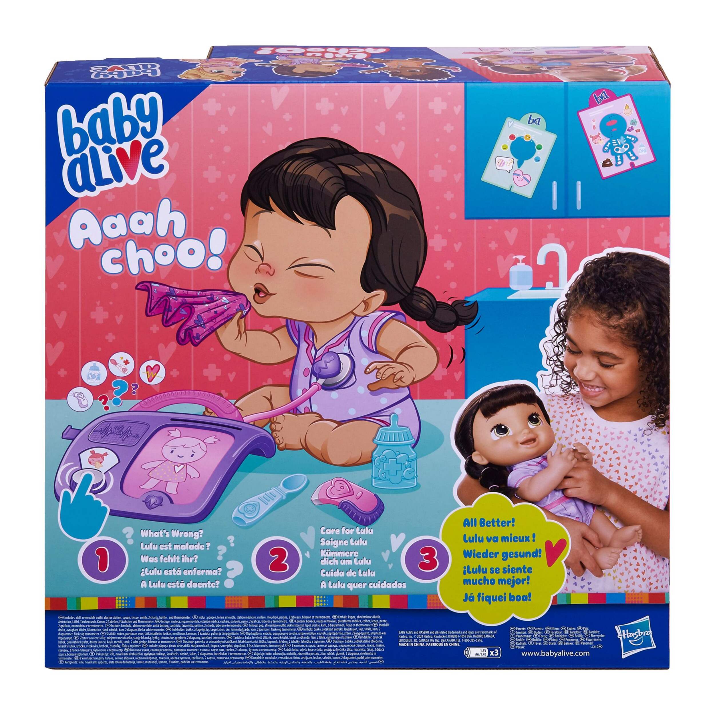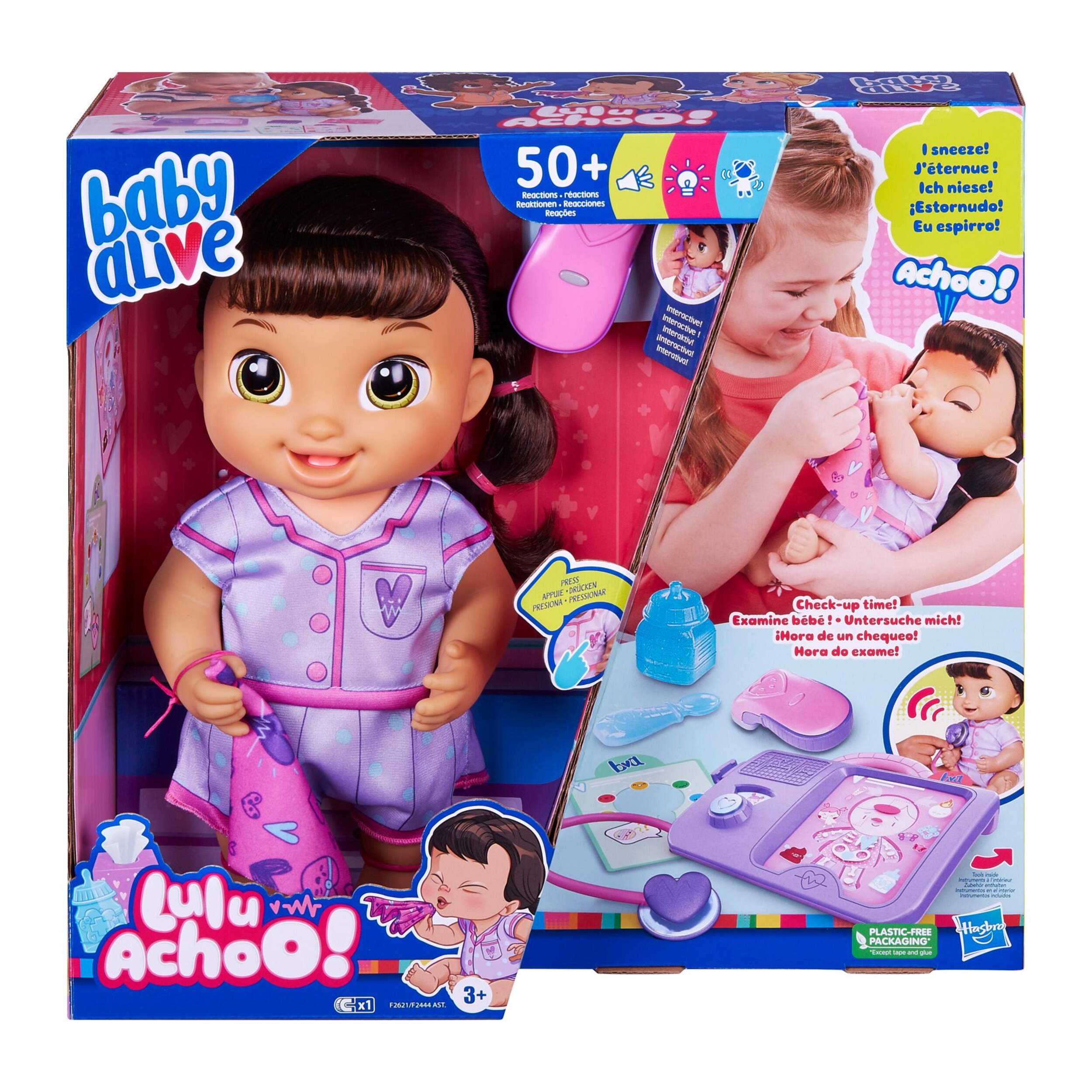 DOLL MAKES SNEEZING SOUND AND MOTION: “Achoo!” Baby Alive Lulu Achoo is one sniffly, sneezy baby doll! As she sneezes, she even moves her hands up towards her face!
