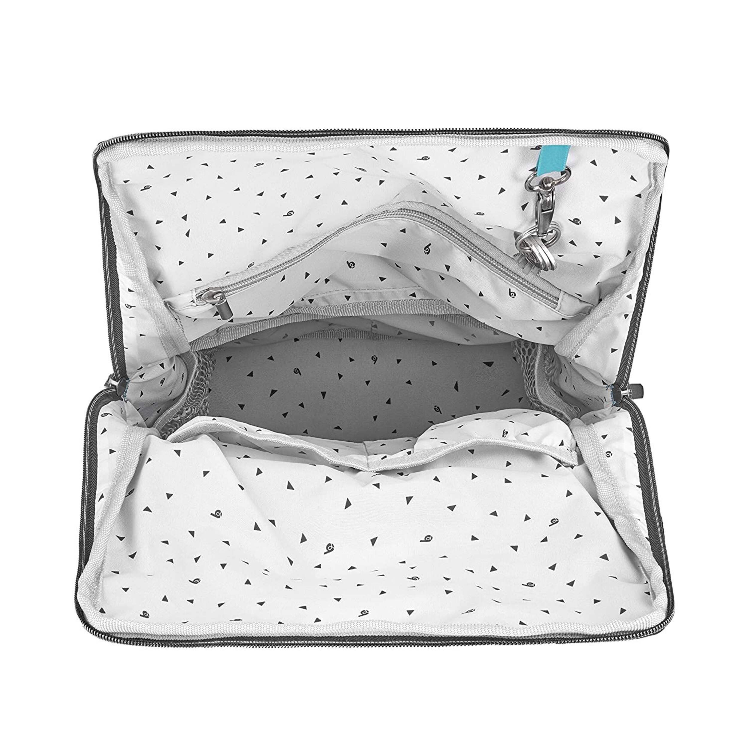 The Babymoov Sancy Smoky Diaper Changing Backpack keeps parents organized with built-in features for baby's needs on the go. Unzip the front pocket to access the removable padded changing pad. The spacious 36L interior includes an insulated food and drink compartment, terry cloth towel, pacifier pouch, and stroller hooks to keep essentials handy. A built-in keychain, multiple pockets, and the backpack’s neutral grey colour combine to provide an intelligent, practical style.