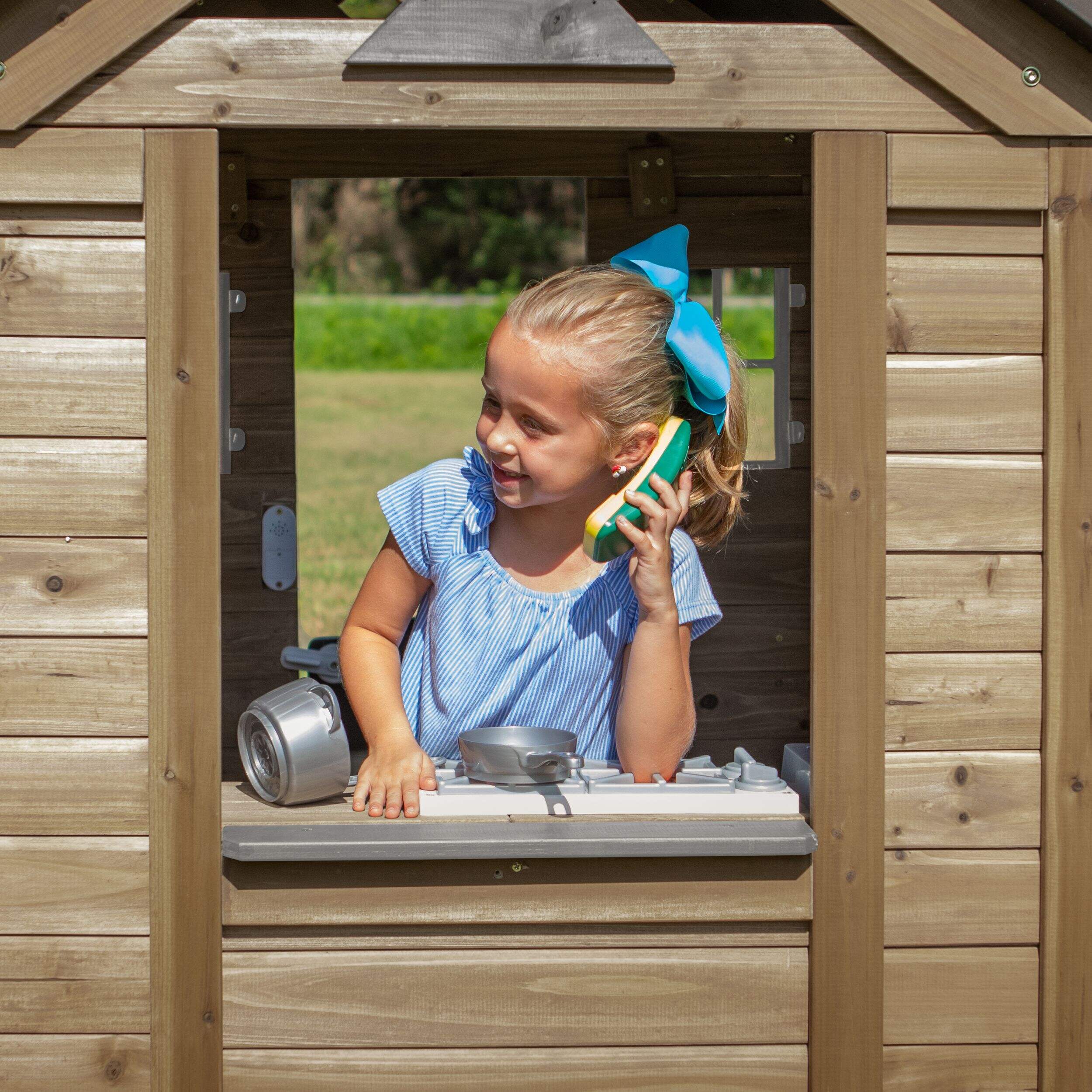The Backyard Discovery Sweetwater Playhouse inspires endless fun and creative activities for the whole family. This outdoor playhouse combines sturdy construction with thoughtful play features in a delightful design. Crafted from naturally durable cedar wood, it creates a beautiful addition to any play space. The large windows welcome natural light and gentle breezes, providing a welcoming retreat where children can let their imaginations soar. From decorative flowerpot holders for budding gardeners to a working half door that creates their special entrance, your little ones will love the charming details. The snack bar window adds another layer of fun, perfect for hosting delightful tea parties or running a café. Inside the clubhouse, children will discover a world of possibilities with the toy sink, stove, cordless phone, and engaging accessories that encourage play. The Sweetwater provides the perfect setting for creative moments and lively adventures with friends. Plus, this stylish outdoor playset is ready to assemble with pre-cut, pre-stained, and pre-drilled pieces for a quick and hassle-free setup.