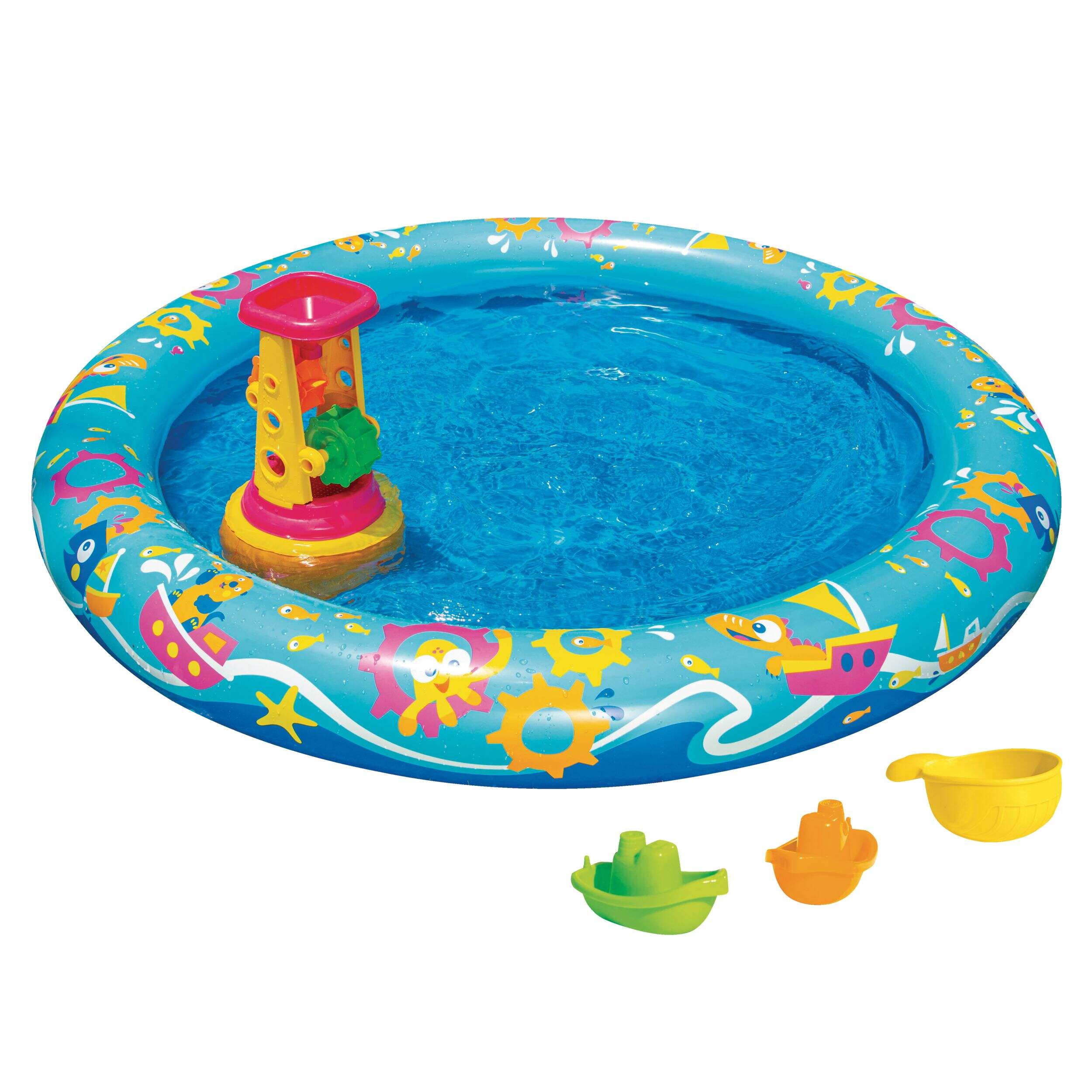 This refreshing 46 inch inflatable pool is a great way for little ones to explore the wonders of water play. Kids can fill up the included removable water tower then pour water over it to watch the wheels spin and splash, or race the 2 toy boats down the pools mini rapids. The pool helps develop hand-eye coordination and motor skills while encouraging creative play, all while cooling off on hot summer days.