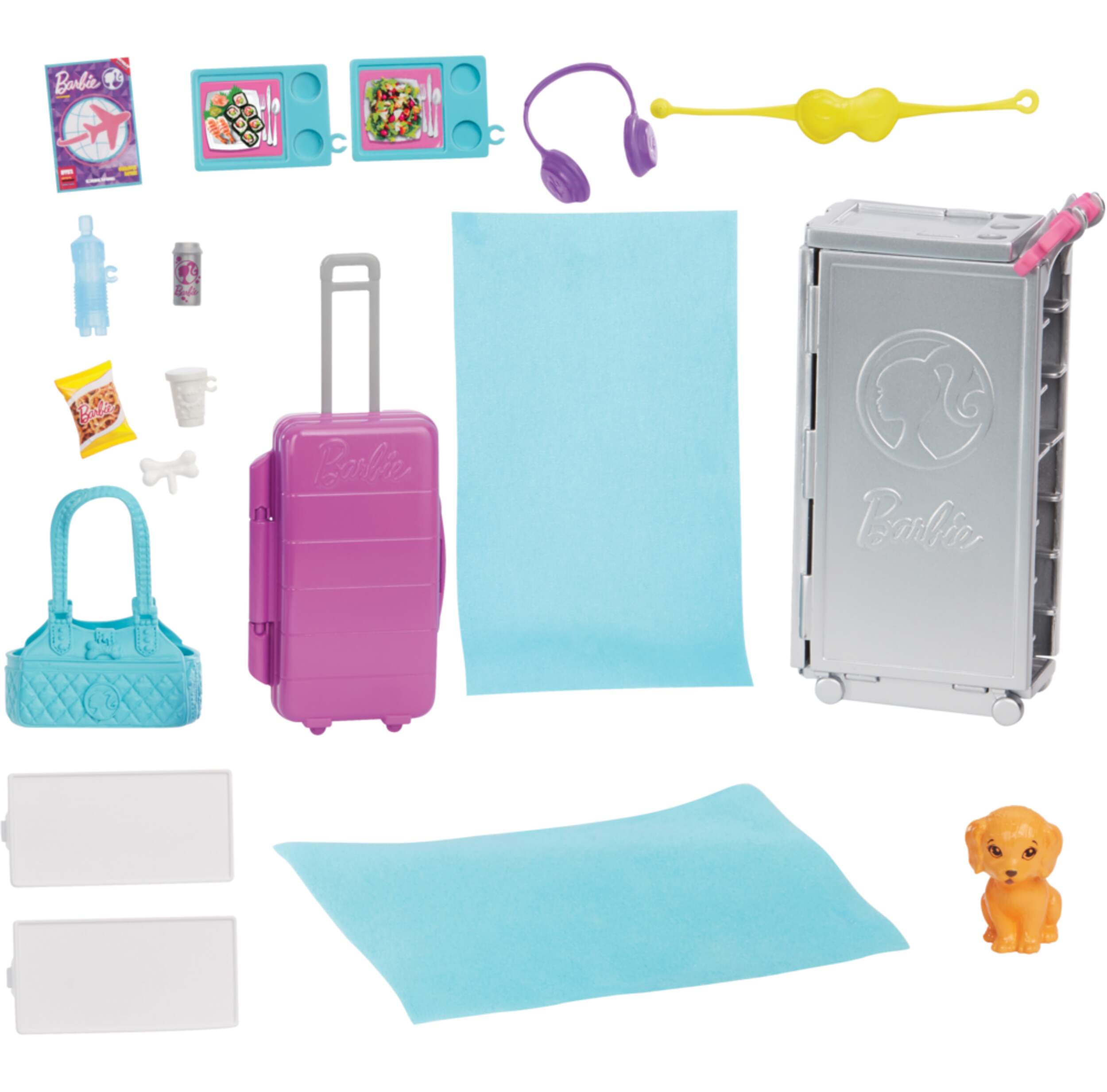 Imaginations take off with the Barbie® dreamplane -- it opens to let young explorers play out the journey! Simply lift the top and open the side to reveal space for three dolls (the seats recline!), storage for the suitcase (included) and more than 15 storytelling pieces. Serve up fun with a dining cart and food pieces or catch some zzz's with an eye mask, headset and blanket. Doll not included.