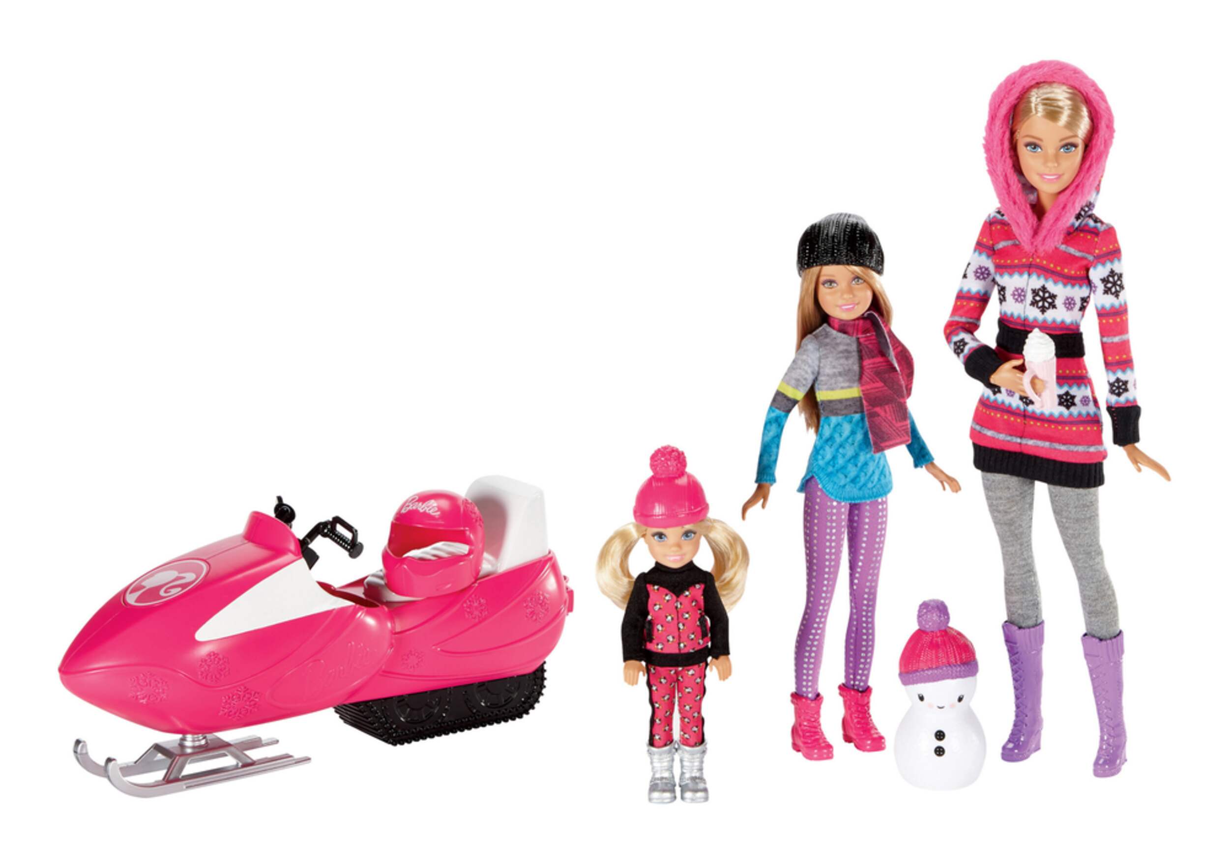 Accessories include: snowmobile for Barbie, a snowman for Stacie and Chelsea, and a hot cocoa to keep them warm