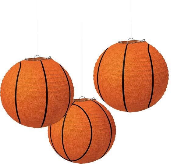 These faux lanterns are globes printed to look just like basketballs with sturdy wire frames