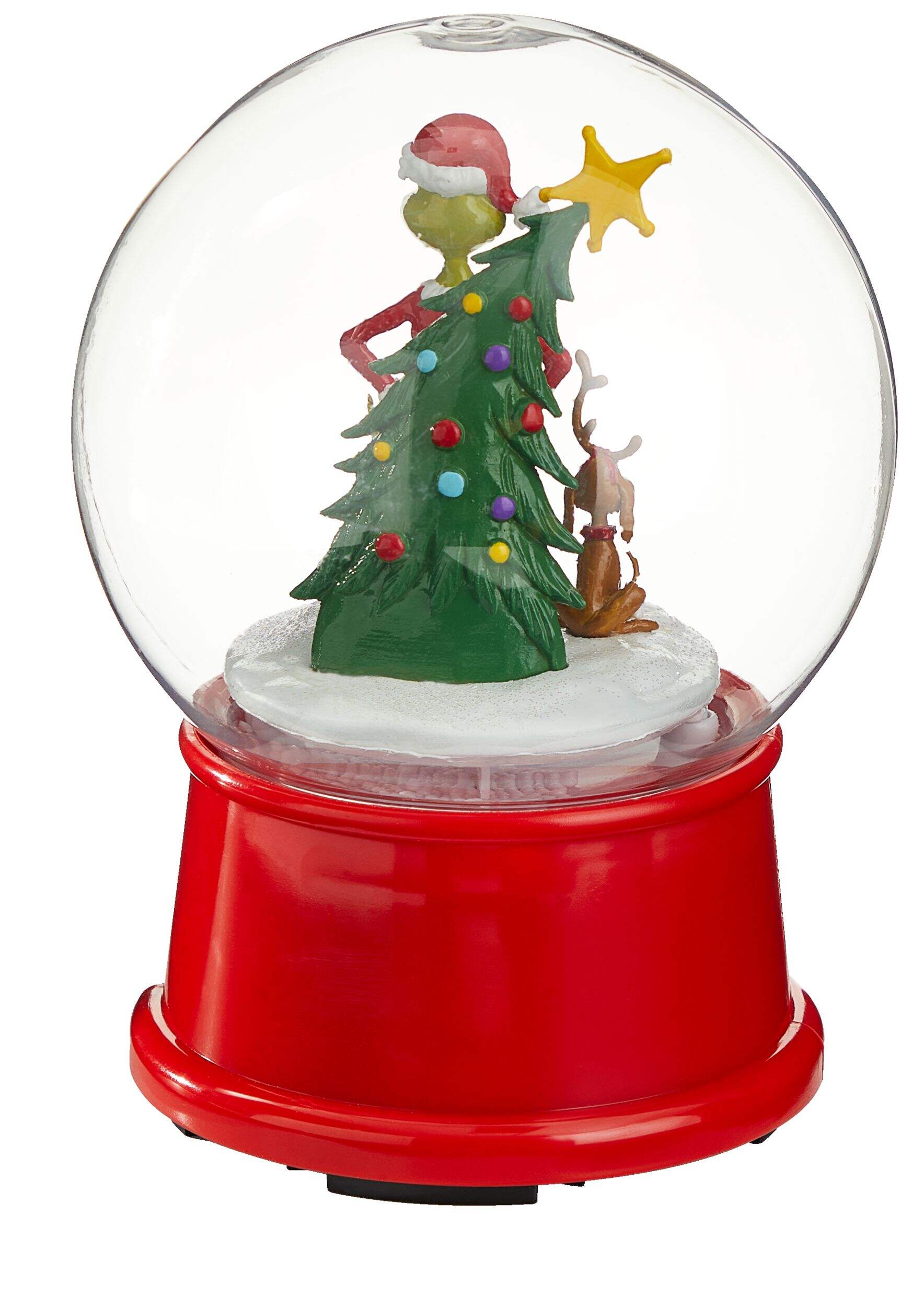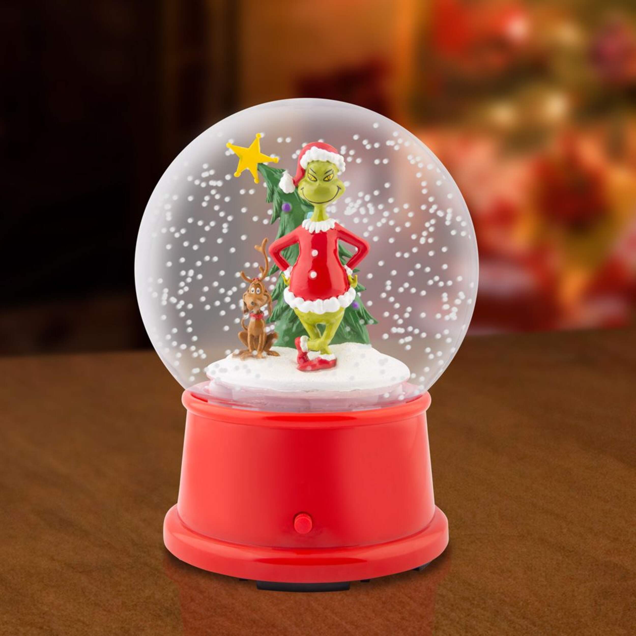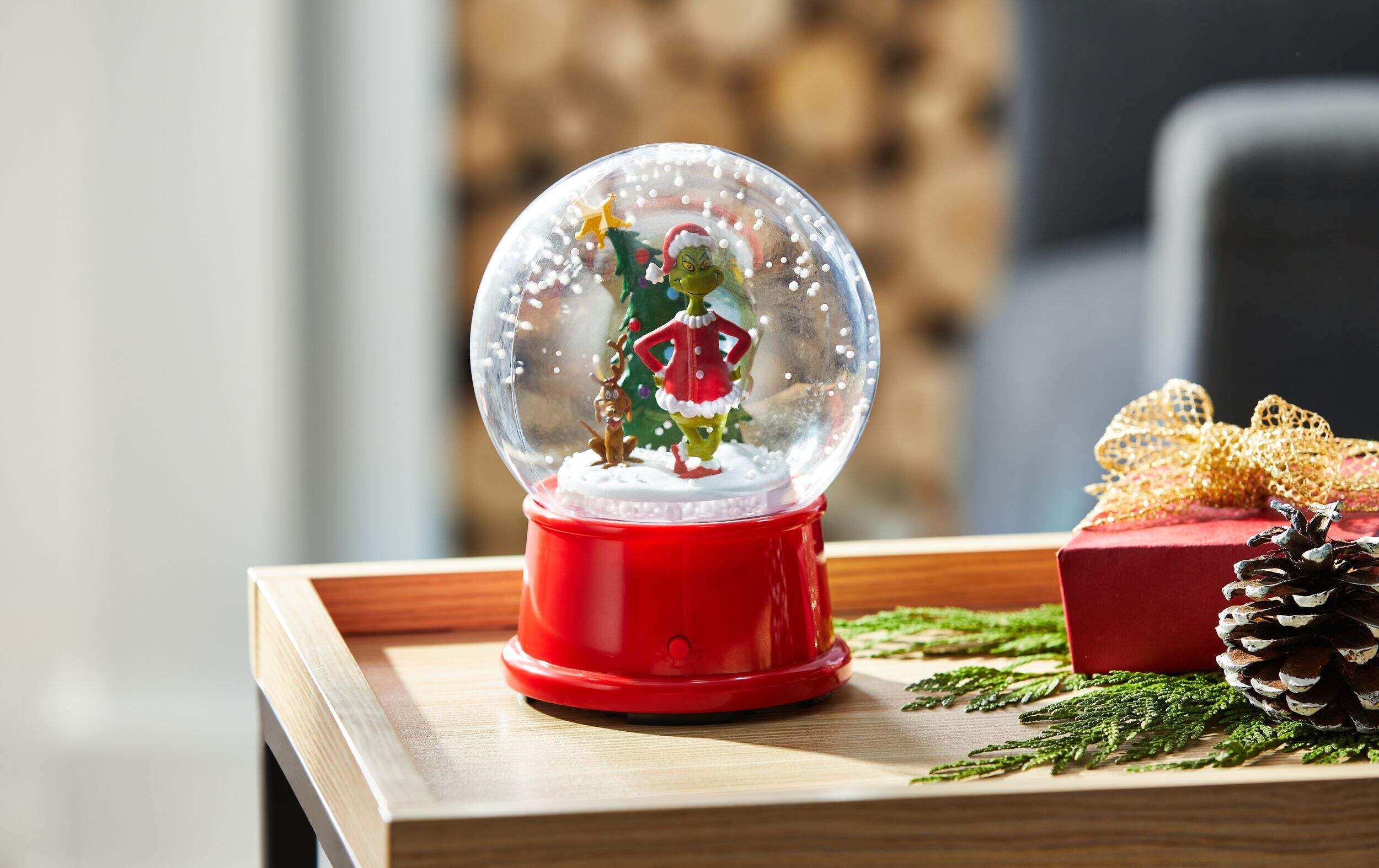 Bring home some whimsical winter magic with the Battery-Operated Grinch Snow Globe. This festive snow globe features the iconic holiday duo of Grinch and his dog Max, making it a perfect collector's item for Dr. Seuss fans. With the touch of a button, create a magical blizzard inside this snow globe. There's no shaking needed thanks to the battery-powered mechanism. As the snow swirls around the Grinch, this novelty snow globe plays classic holiday songs to complete the festive scene.