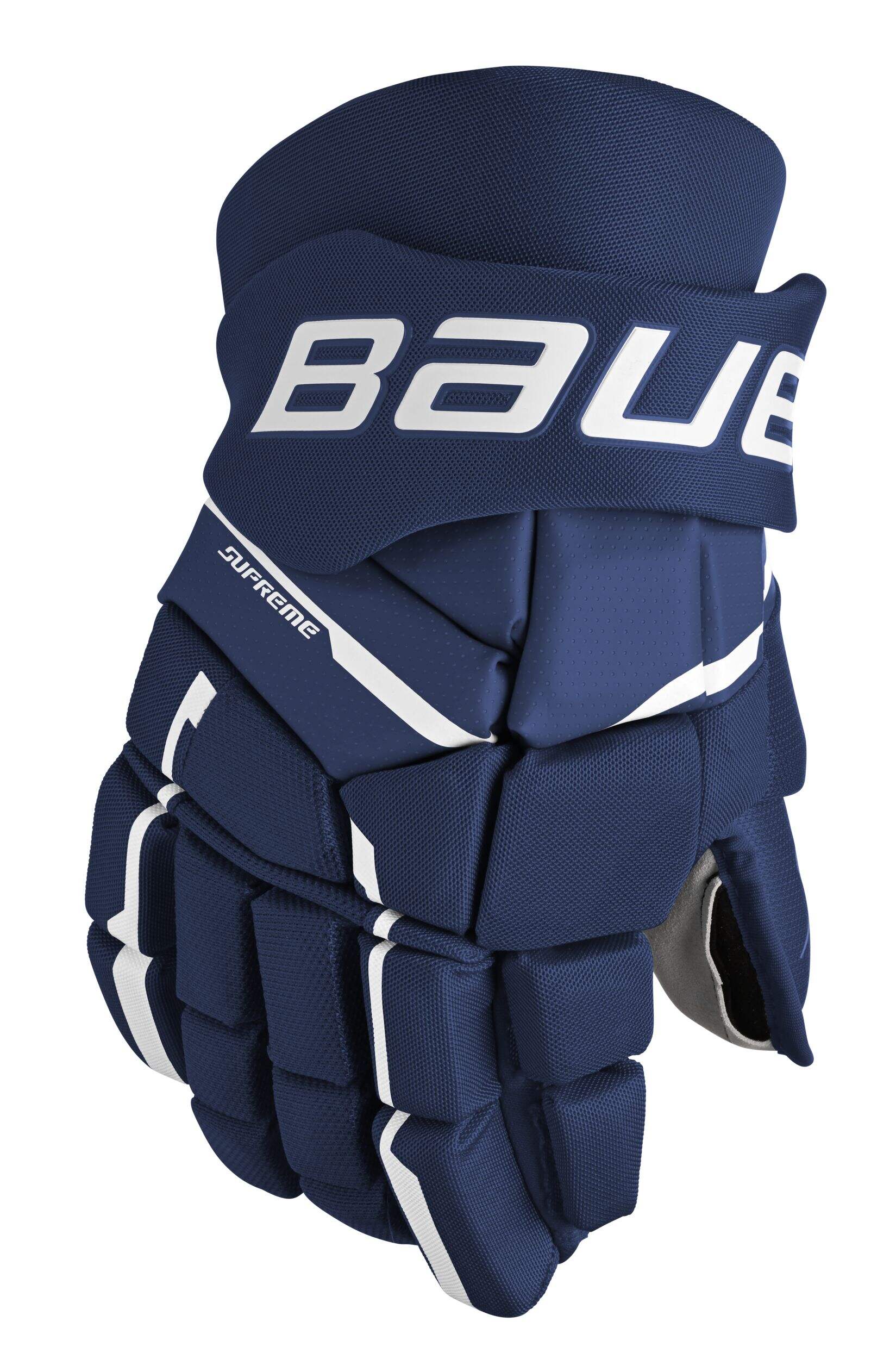 The Bauer Supreme M3 Hockey Gloves, Senior, Navy, Assorted Sizes, promise to take your game to the next level. Designed for competitive players, the Bauer Supreme M3 gloves provide an optimal blend of protection and performance. The Flex-Connekt palm technology delivers comfort, feel, and durability, while the pre-curved backhand with HD inserts shields your hands from hard shots. The 2-piece flex thumb allows for improved mobility and the SHOTBOOST fingers allow for better puck control on slap and wrist shots. Comfort stretch gussets and a contoured cuff roll with moulded logo add breathability, flexibility, and visual style. Whether you're a scoring star or a defensive dynamo, these affordable yet high-performing gloves will have you making saves and setting up plays with confidence and flair.