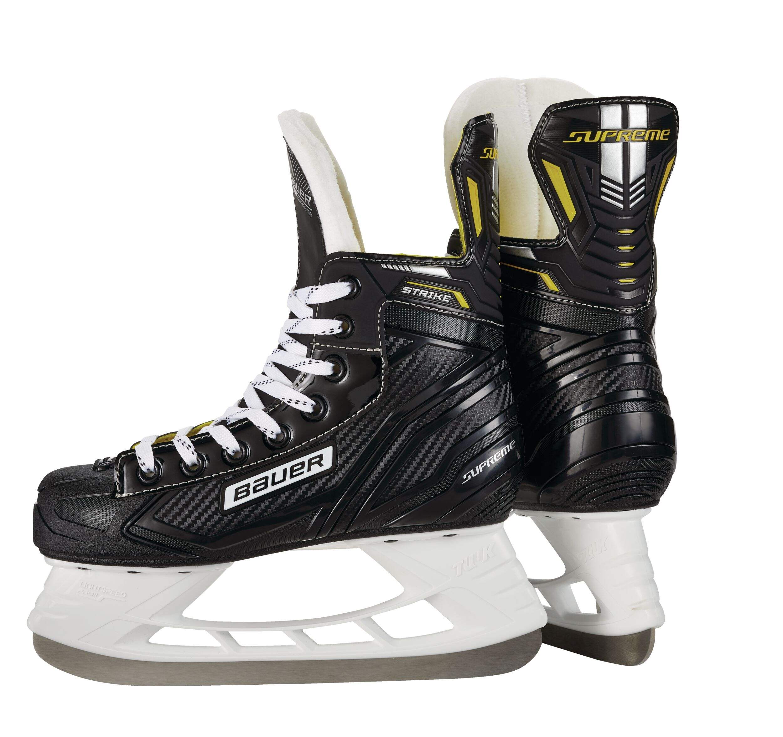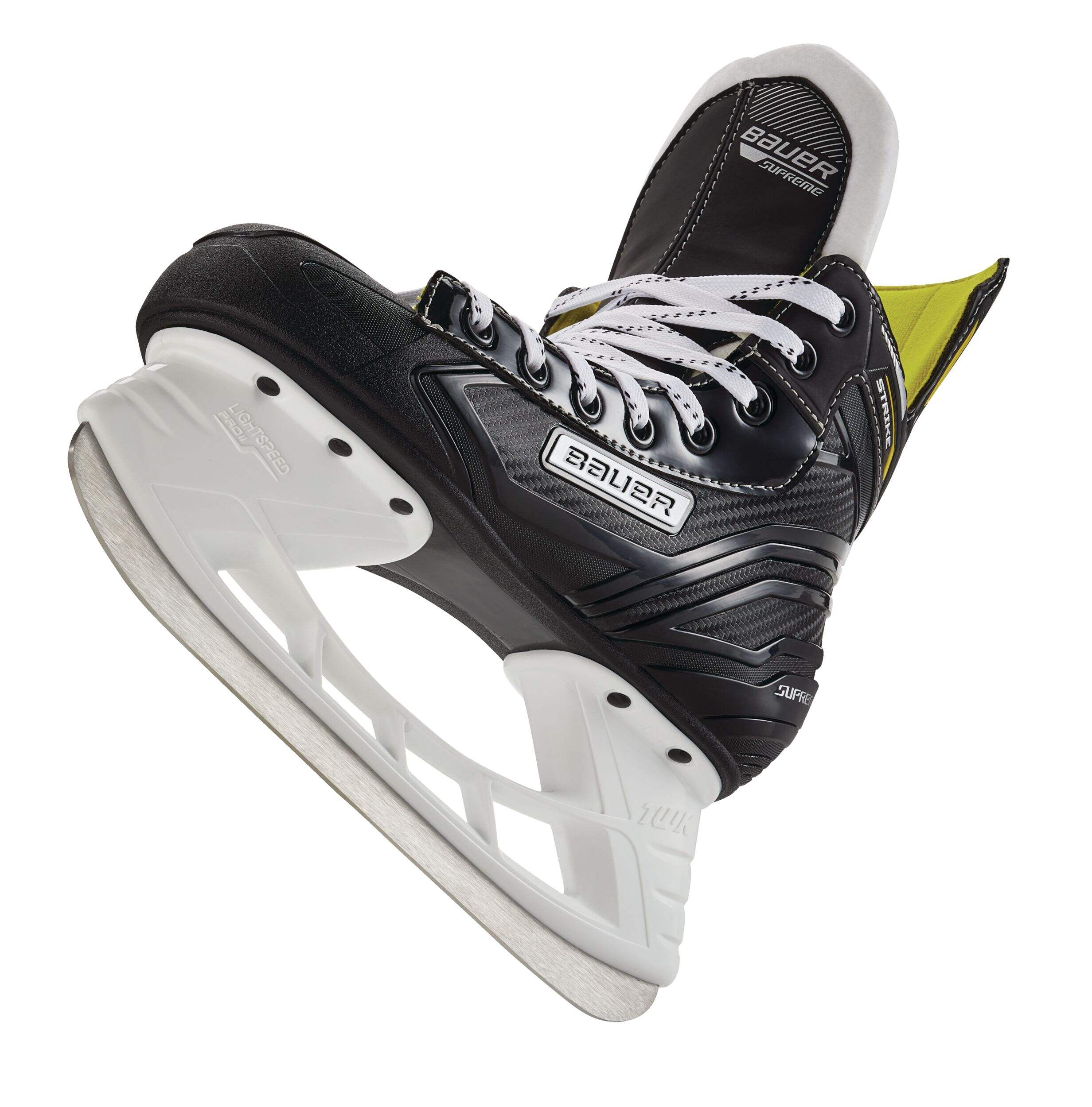 The Bauer Supreme Strike Hockey Skates for junior players are built for power and stability on the ice. Designed with an anatomical fit, these skates offer excellent foot support, enhancing energy transfer for stronger, more efficient strides. The hydrophobic liner keeps feet dry and comfortable during play, while the stainless steel blades ensure precise control and sharp edge performance. Ideal for young players looking to develop their skills, these skates provide the durability and performance needed to excel in the game.