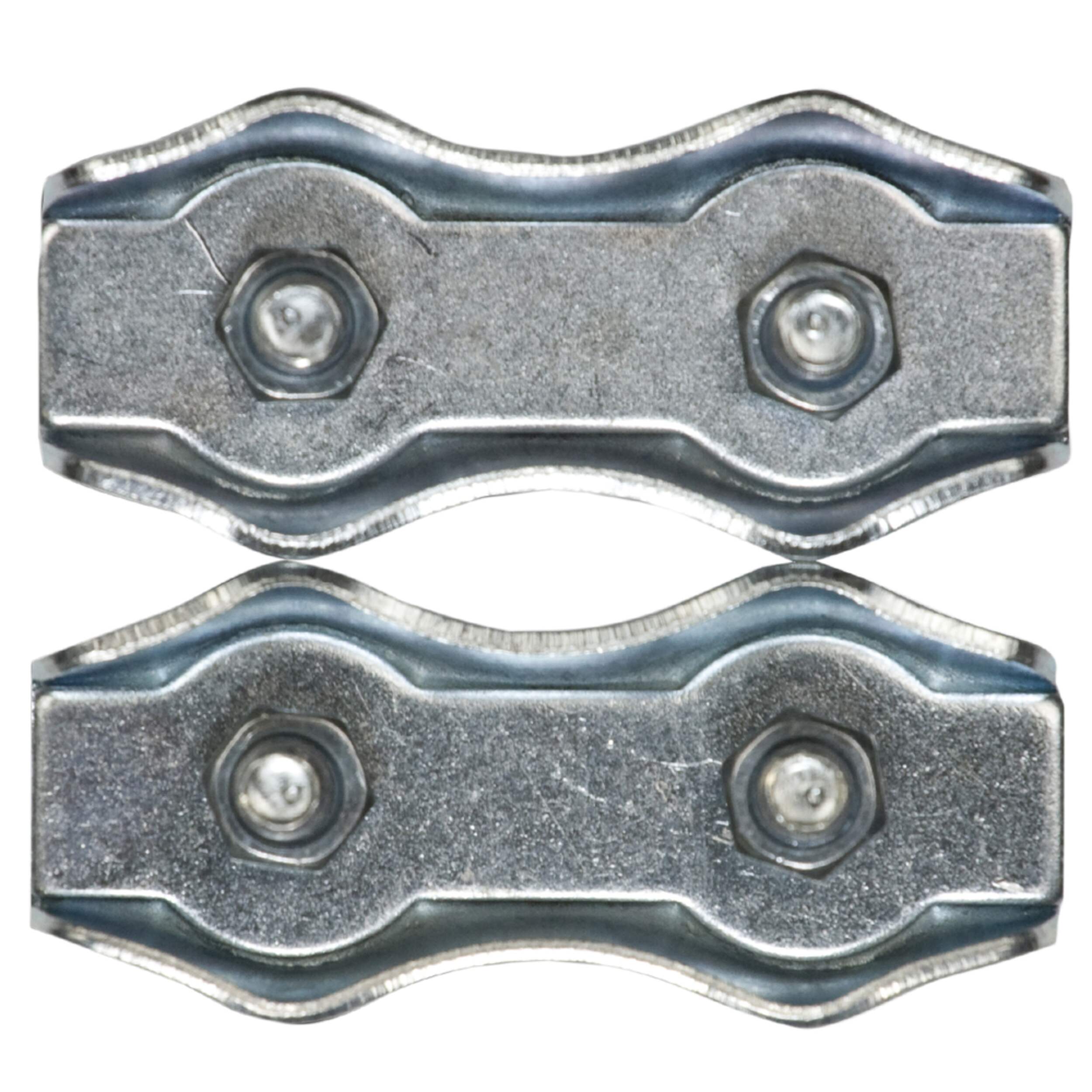These sturdy wire rope clamps mechanically form loops to secure chain links, matching the size and type of chain used. The pack contains two pieces designed for 1/4 inch diameter rope. Simply wrap the rope around the clamp's U-bolt, position the clevis around the rope, and tighten the nut to secure the link. Perfect for creating reliable, adjustable hanging systems in workshops, garages, warehouses and more where chains and ropes are part of the job.