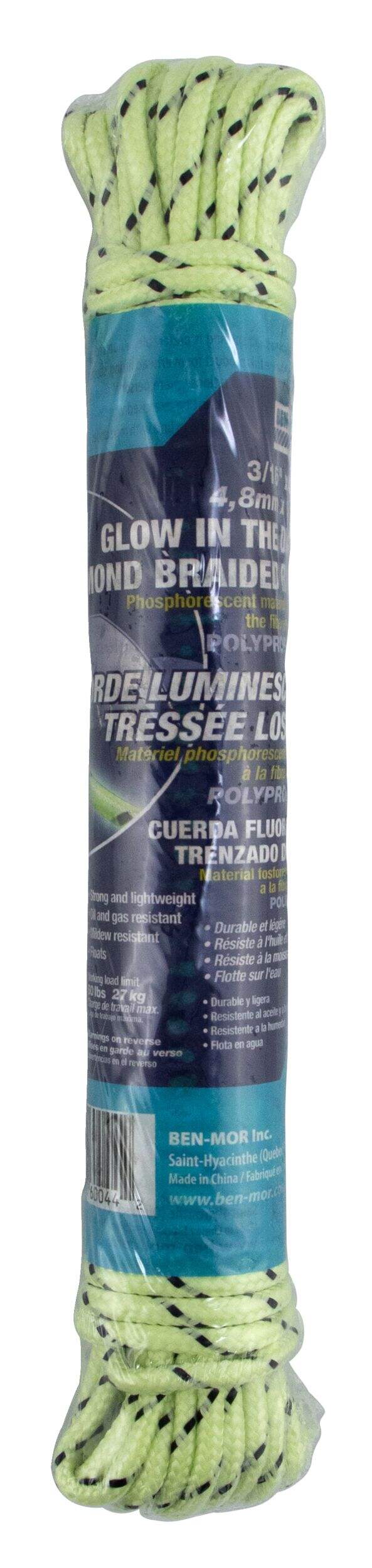 The Ben-Mor Glow-in-the-Dark Polypropylene Rope, Rechargeable offers high visibility with its radiant green glow, ideal for camping, trail-line, or marine applications. This 3/16-in x 50-ft rope is made of sturdy polypropylene and recharges with any type of light. The glow-in-the-dark feature enhances its visibility during the night, making it a practical and versatile choice for various outdoor activities. It is easy to handle and store, and its length can serve multiple uses. With Ben-Mor's innovative design, you no longer have to struggle in low light settings.