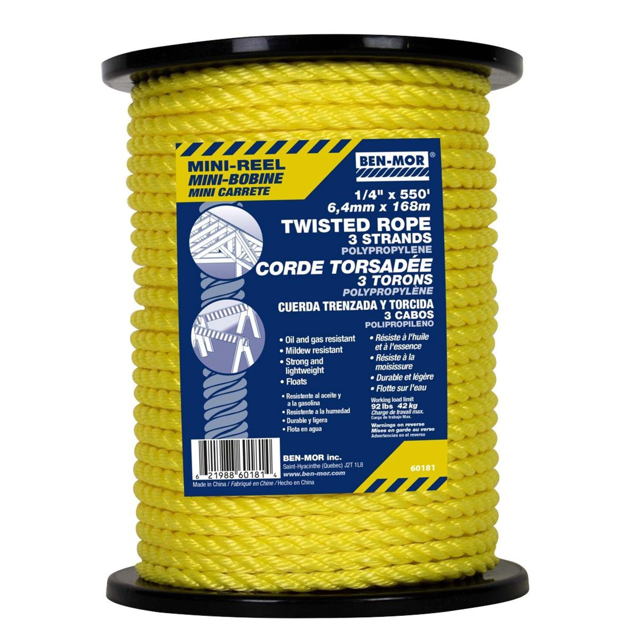 The Ben-Mor Polypropylene Twisted Rope is an ideal rope for everyday tying tasks. Made from strong yet lightweight polypropylene, this twisted 3-strand rope resists oils, gas and mildew while remaining easy to handle. Its durable twisted construction provides the strength to secure items without a lot of bulk. Use the rope for general purpose ties around the house, farm or job site.