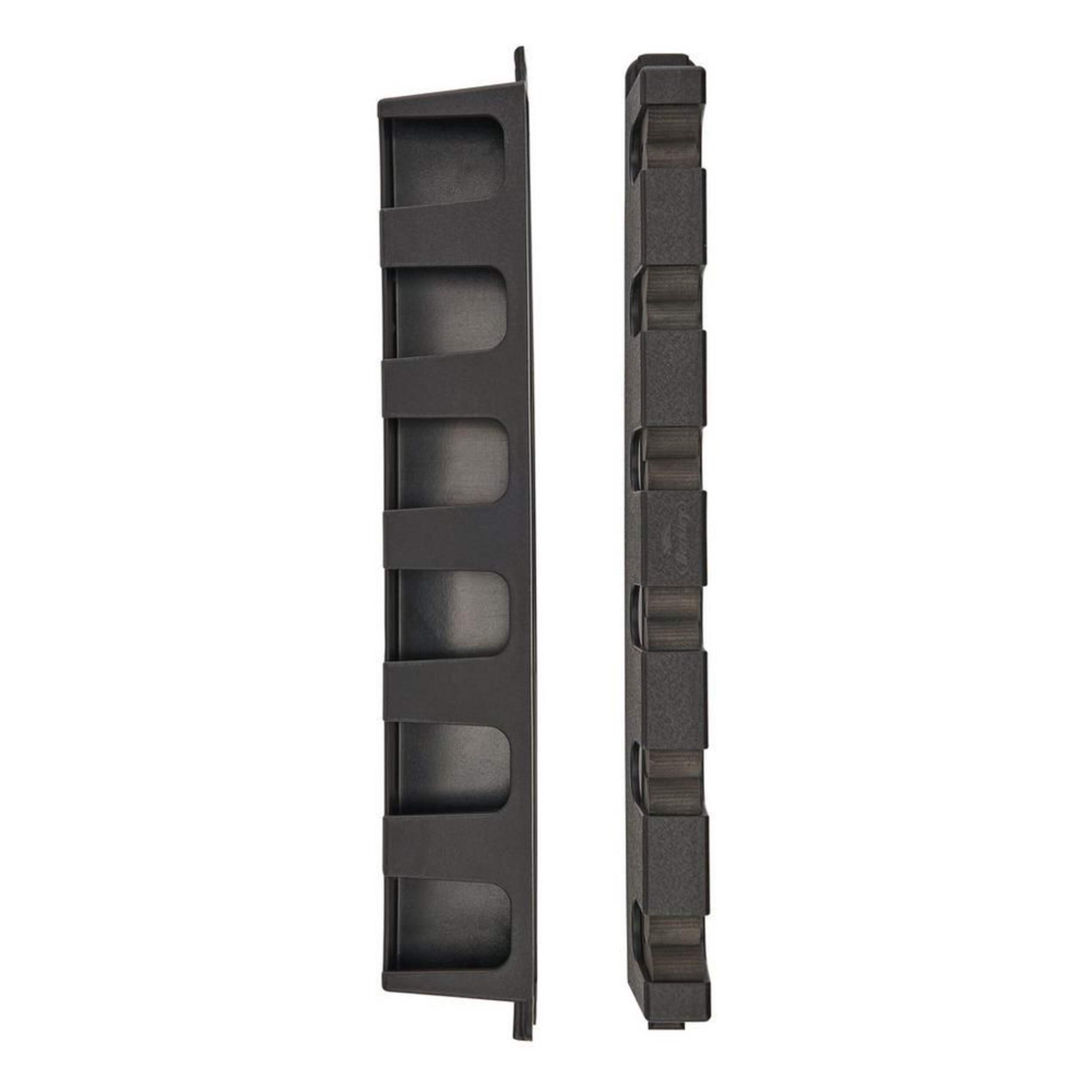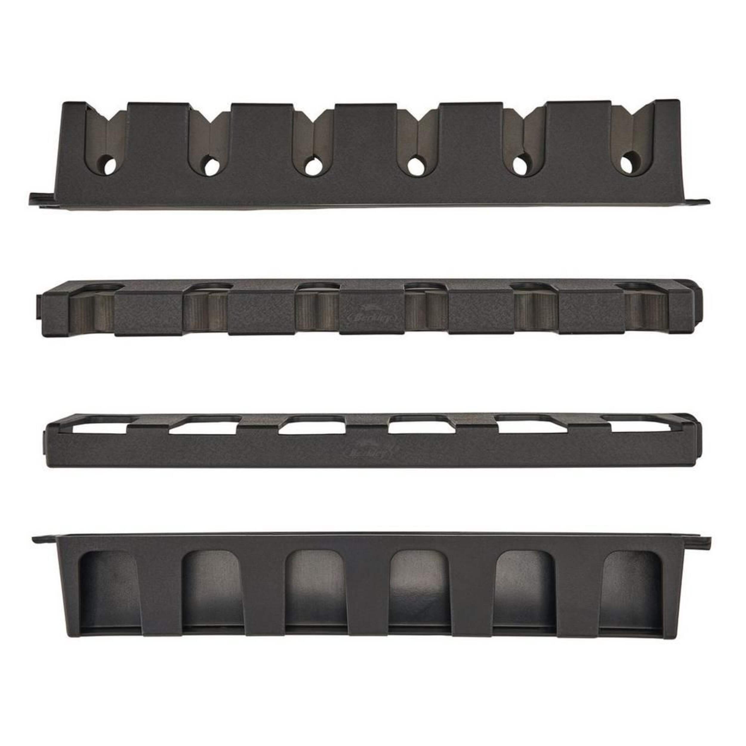 The Berkley® vertical rod rack saves space while neatly and securely storing up to 6 complete rod and reel combos. ##Use enclosed screws to attach to wood, metal, fiberglass or plastic. Use suitable wall anchor when applying to sheetrock or wallboard. Spacing between mounts vary depending on gear stored - recommended spacing between mounts is approximately 42".