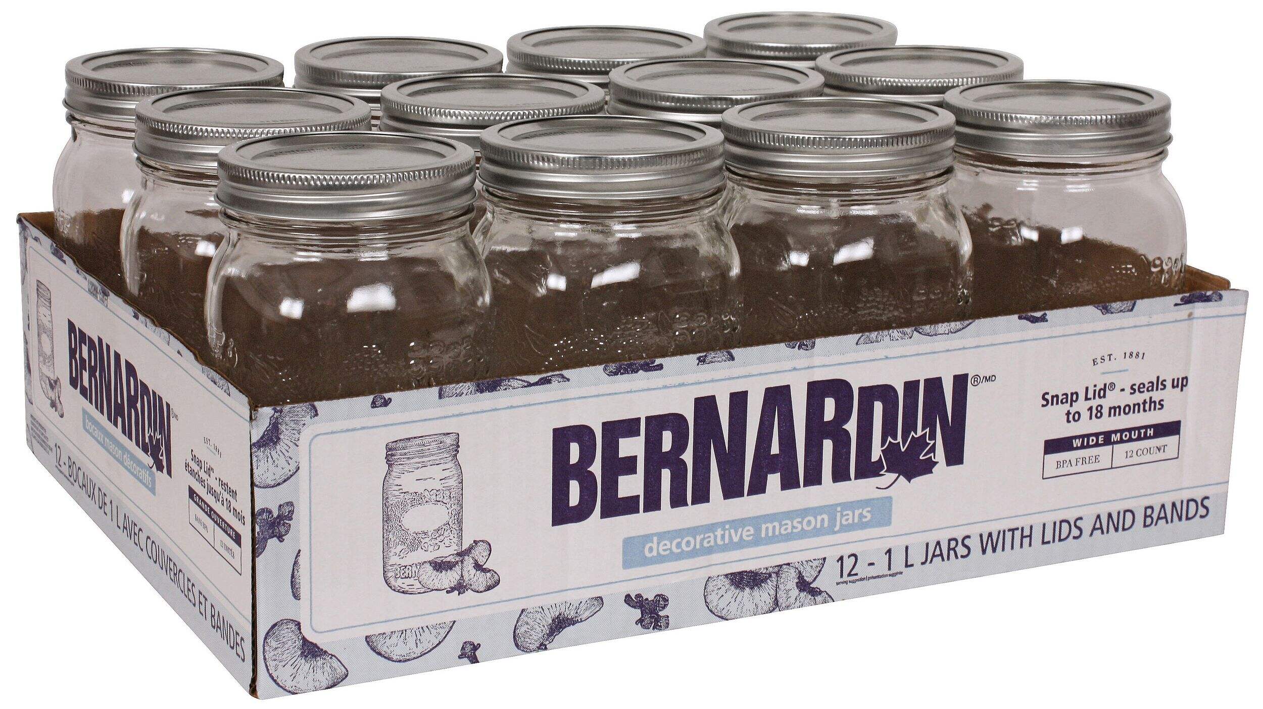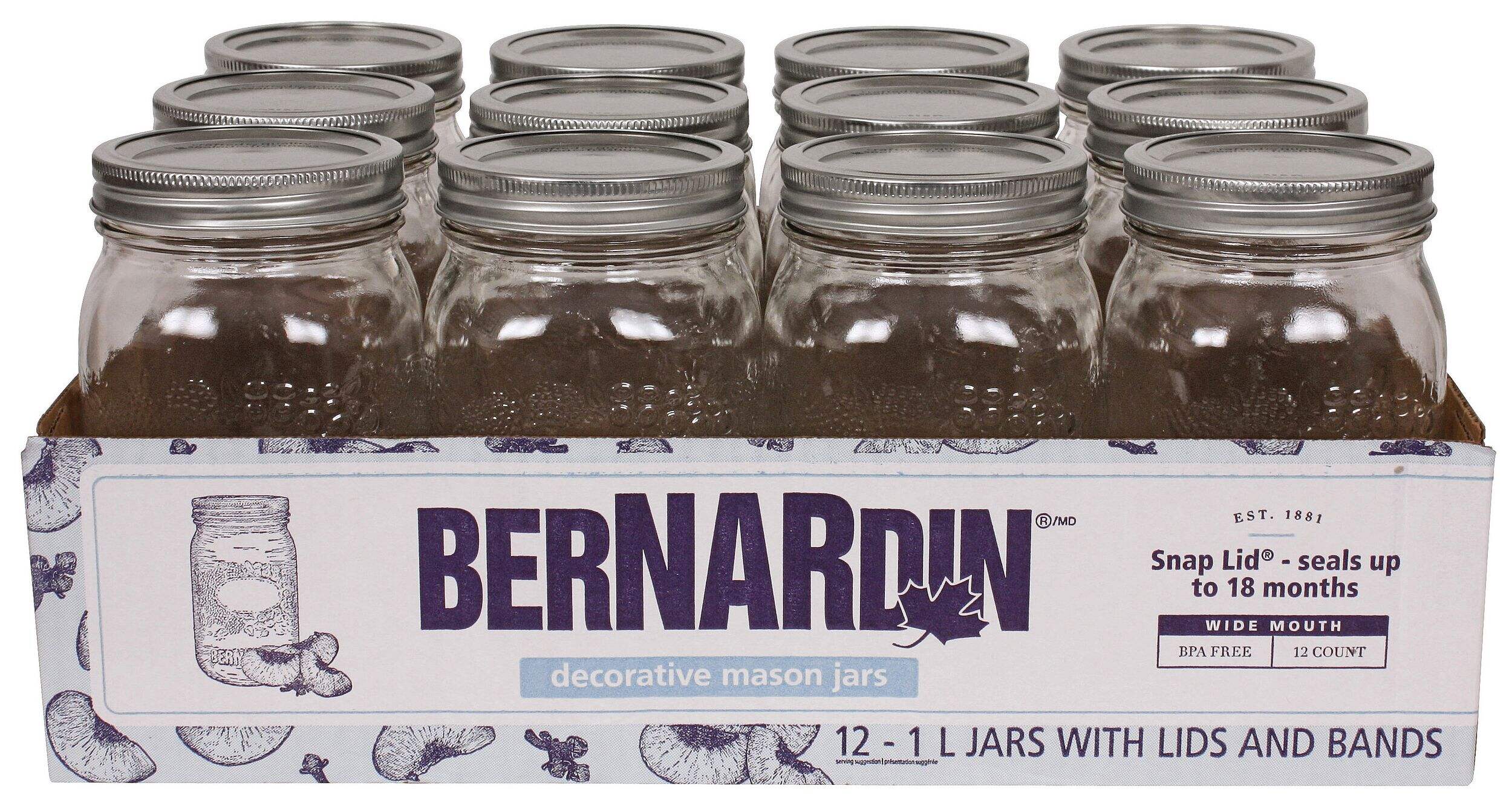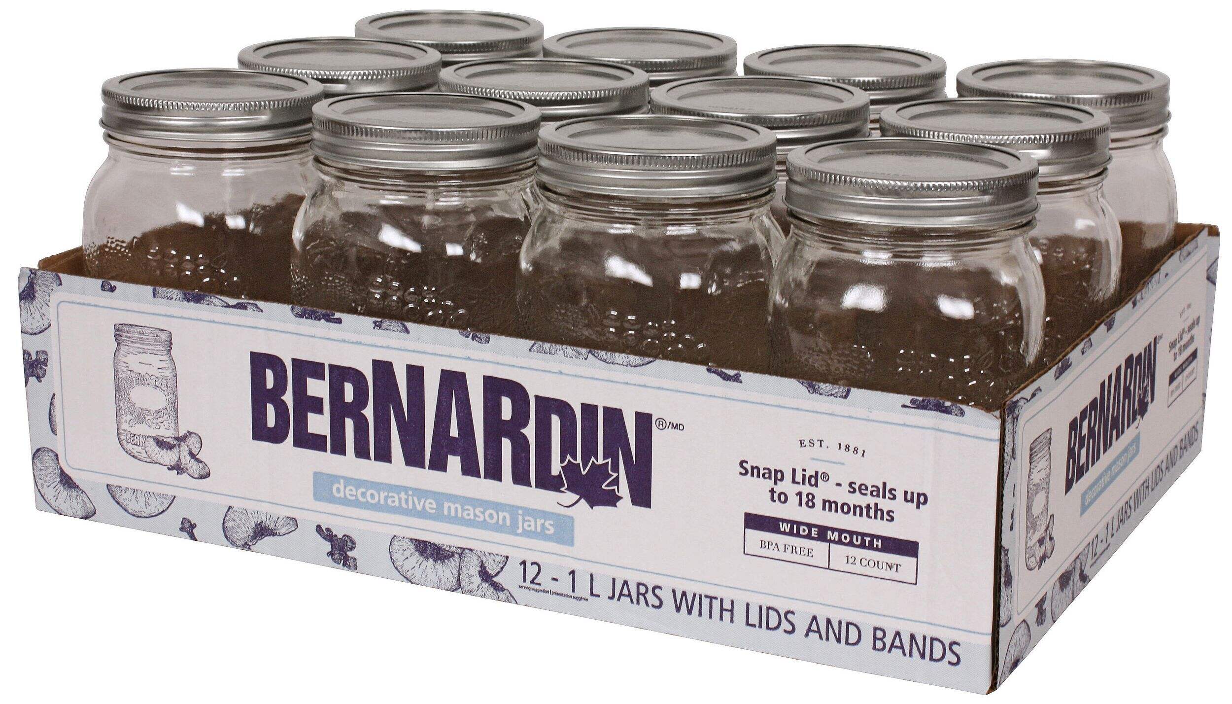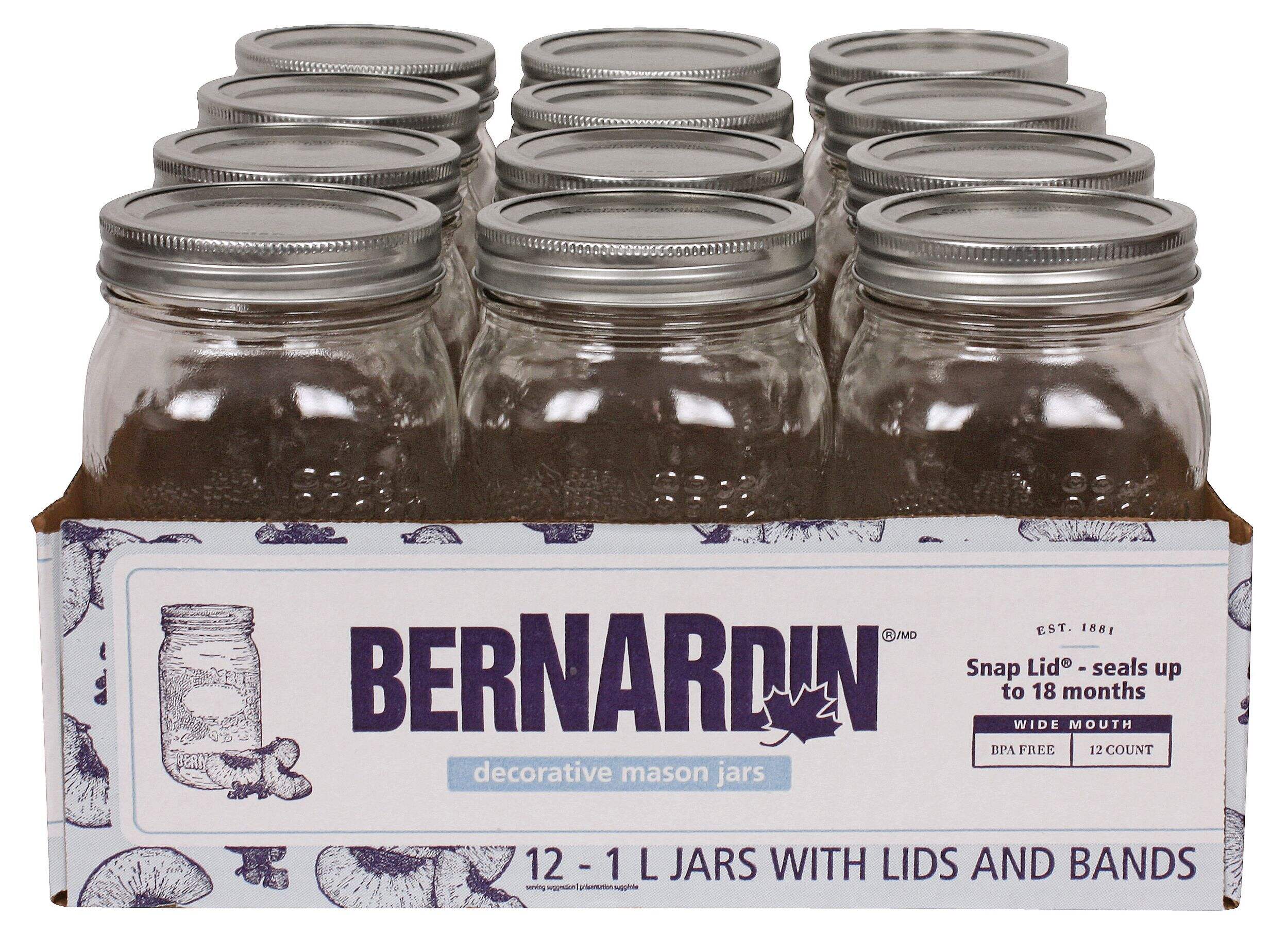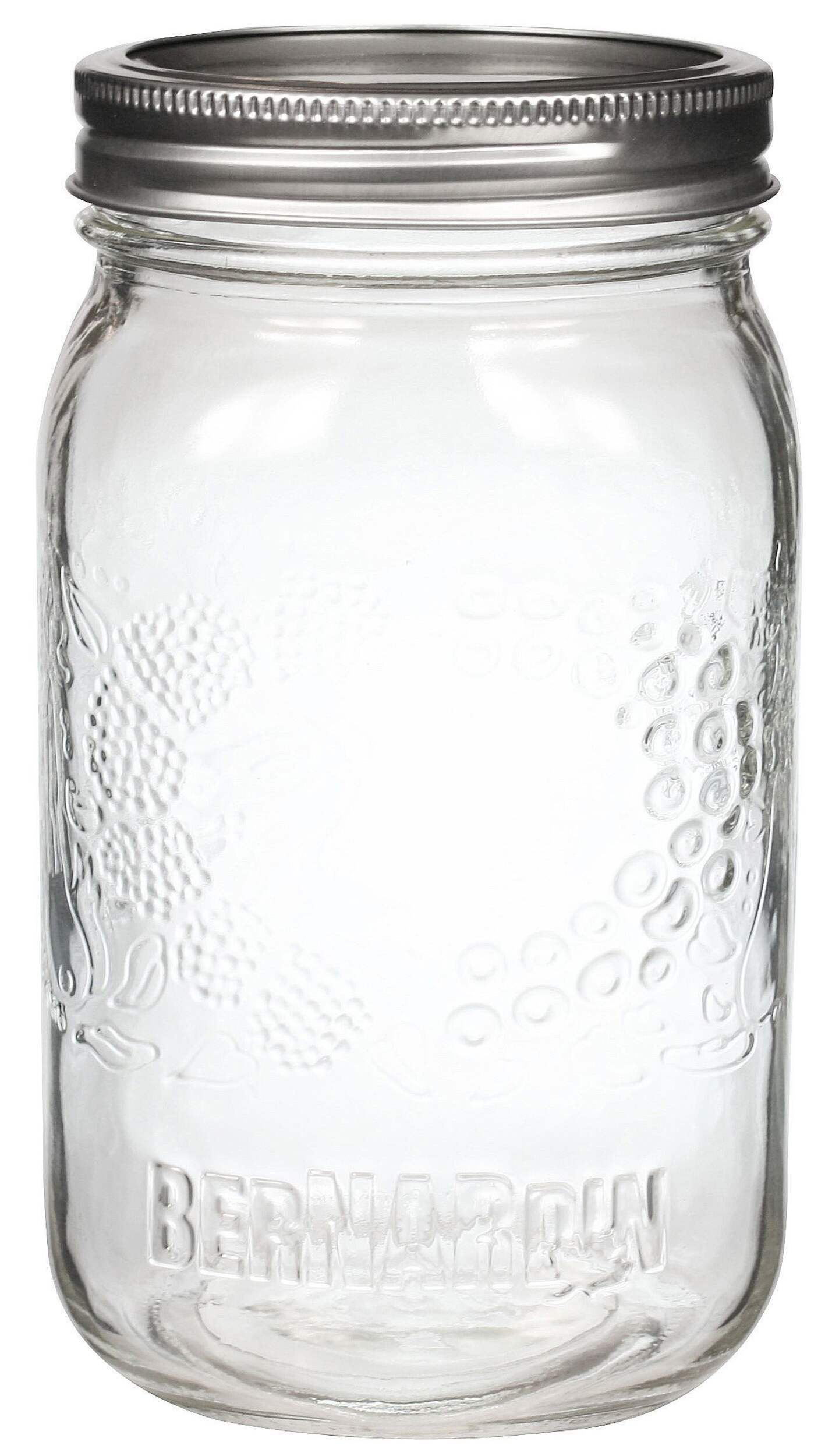 Stylish and functional, these Bernardin Decorative Glass Mason Jars are a great way to keep your pantry, fridge, or craft-room decorated and organized. Featuring a wide-mouth design for easy filling, cleaning, and scooping, these mason jars can be used to store a range of items from dry ingredients to kitchen supplies, beading, and more. With the included lids and bands that create an air-tight seal, these mason jars can also be used to store fresh ingredients and recipes like salsas, sauces, marinades, dressings, fruits, and syrups.
