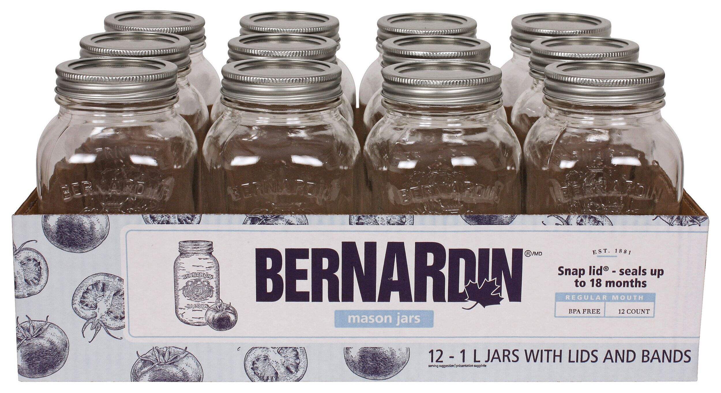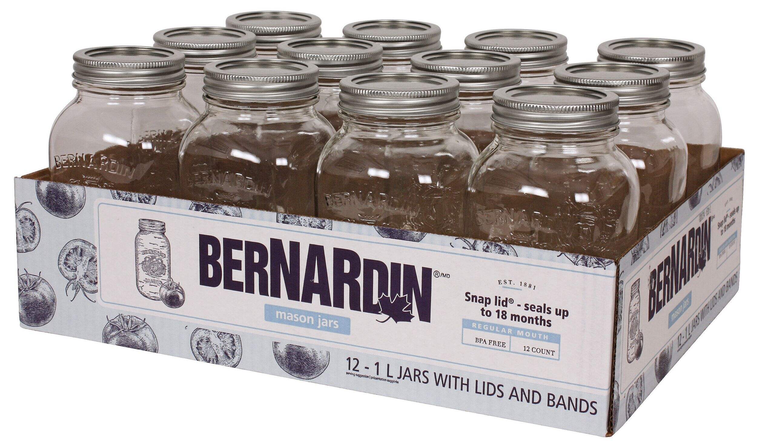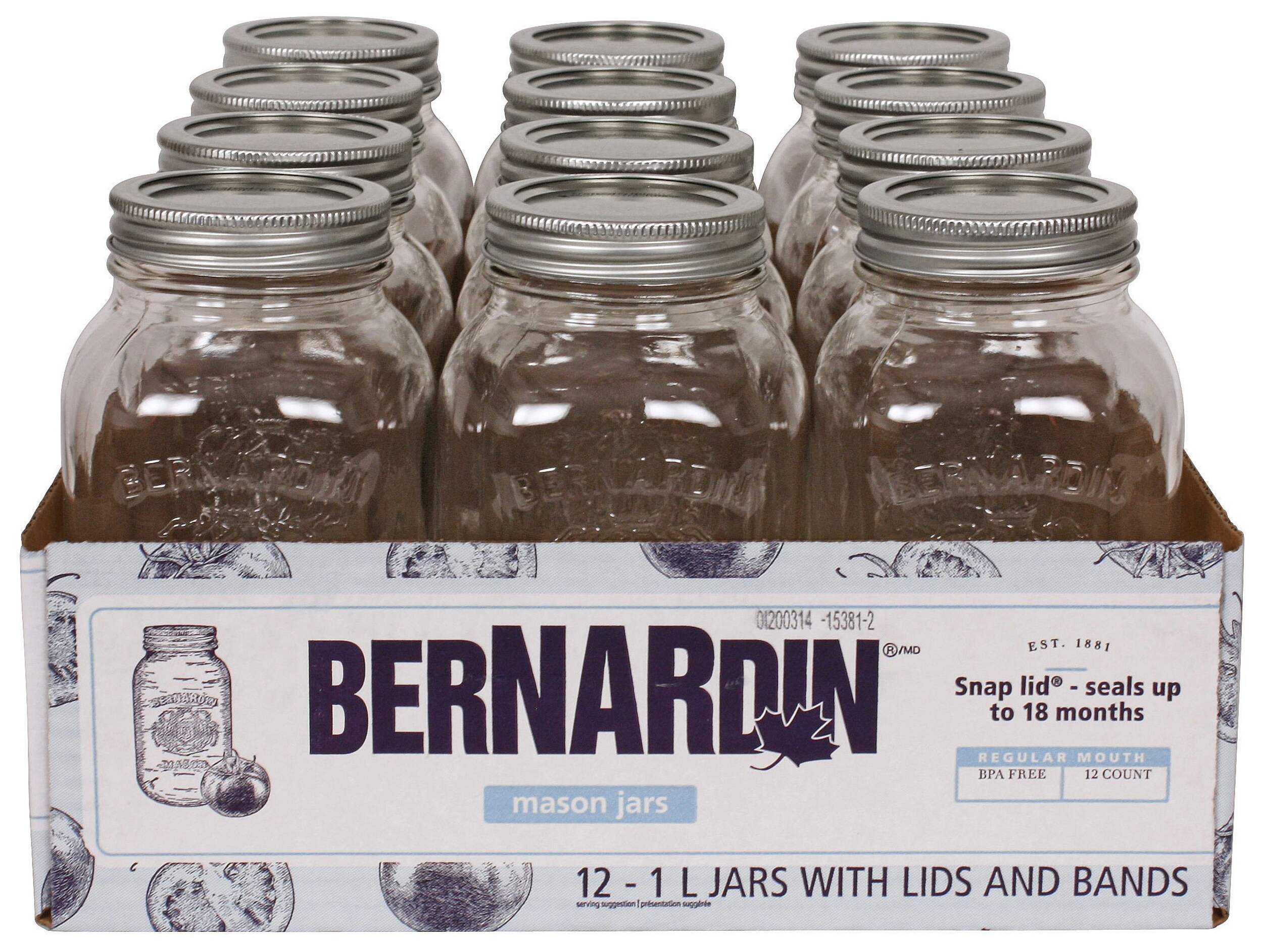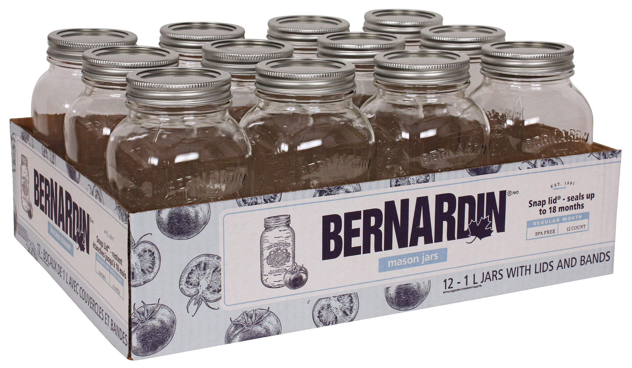 Includes 12, 1 L Regular Mouth Mason jars with lids and bands