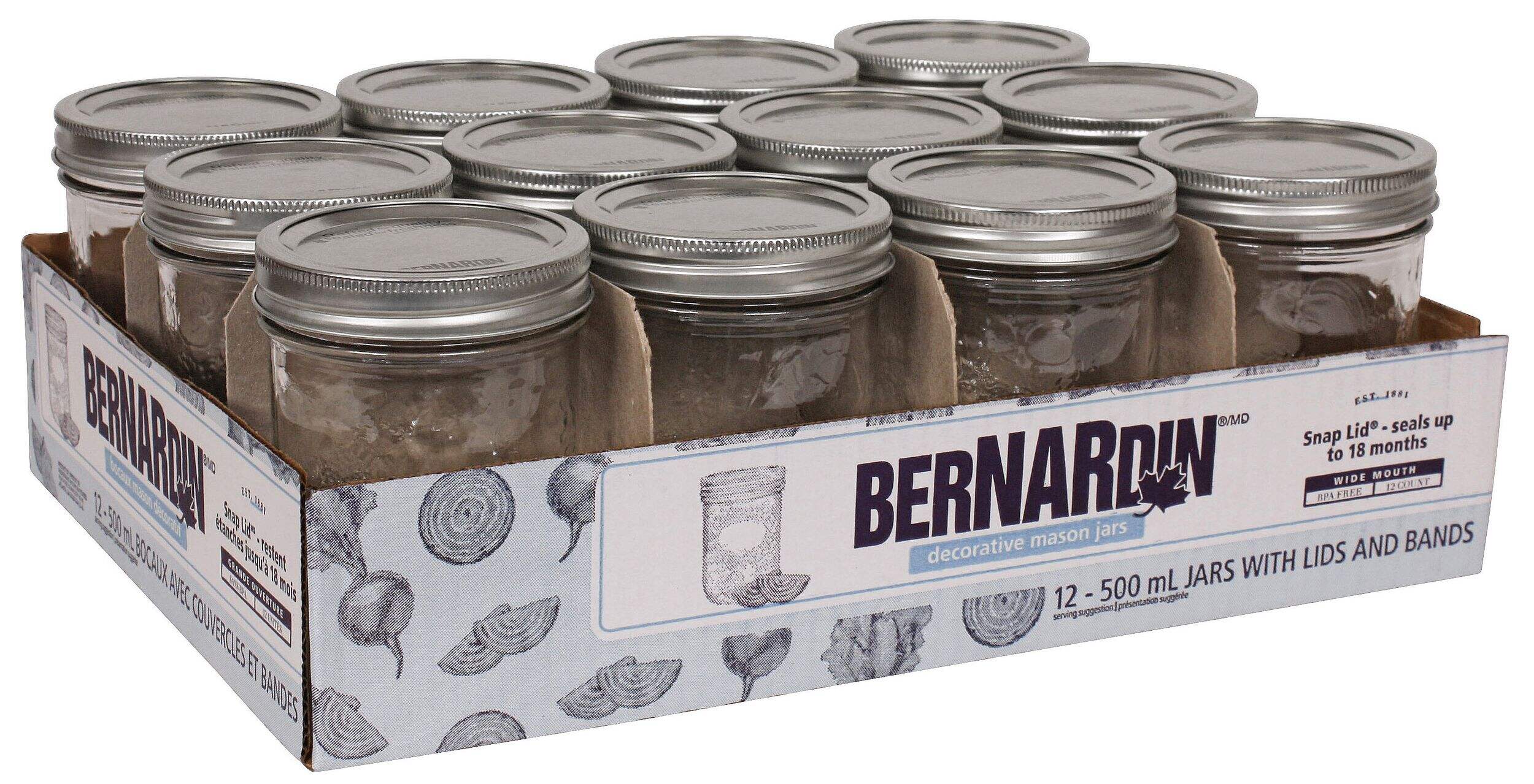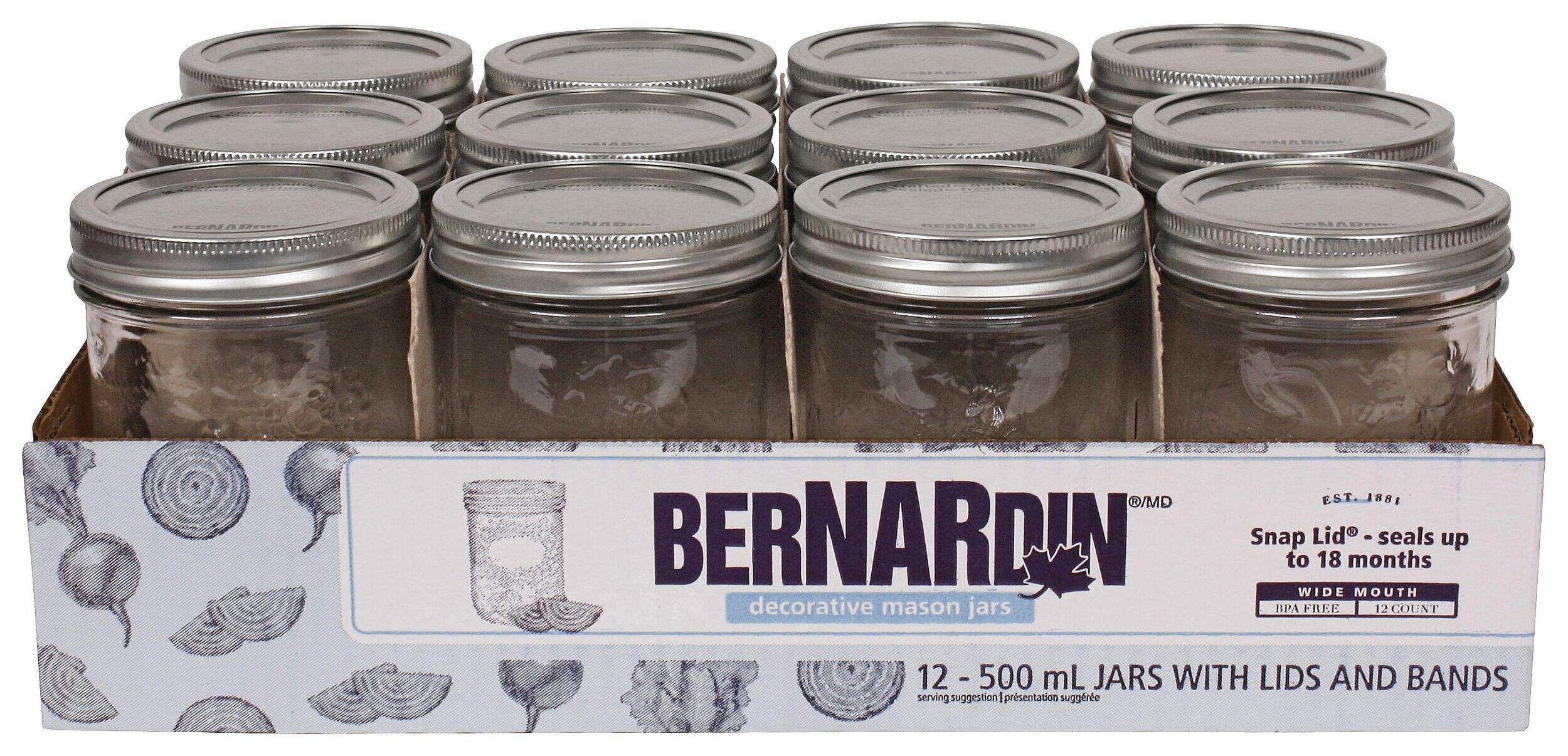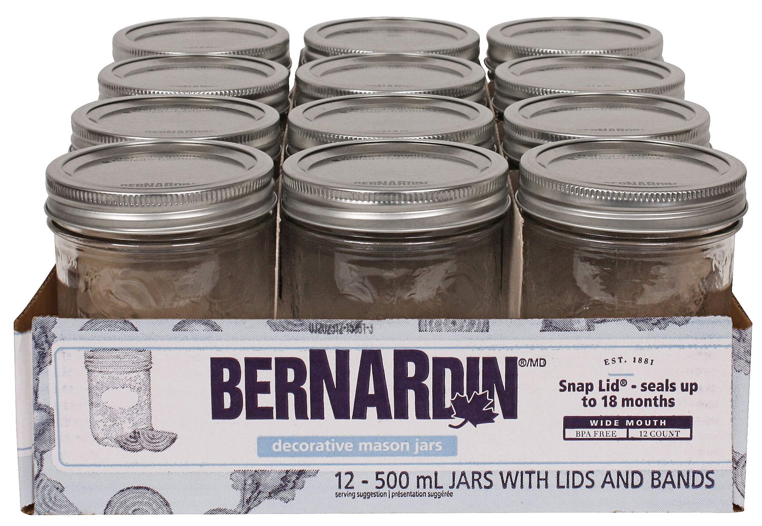 Bernardin Wide Mouth Decorative Glass Mason Jars are perfect for canning pickles, large fruit, salsas, relishes, and sauces. Featuring textured surfaces with flat oval areas for labels, these traditional mason jar-shaped jars allow for efficient shelf storage of home-canned foods. Their wide mouths make filling easy, while their snap lids ensure an airtight seal for preserved freshness. Bernardin's popular 500 ml mason jars will showcase your homemade creations while keeping them safe through the seasons.