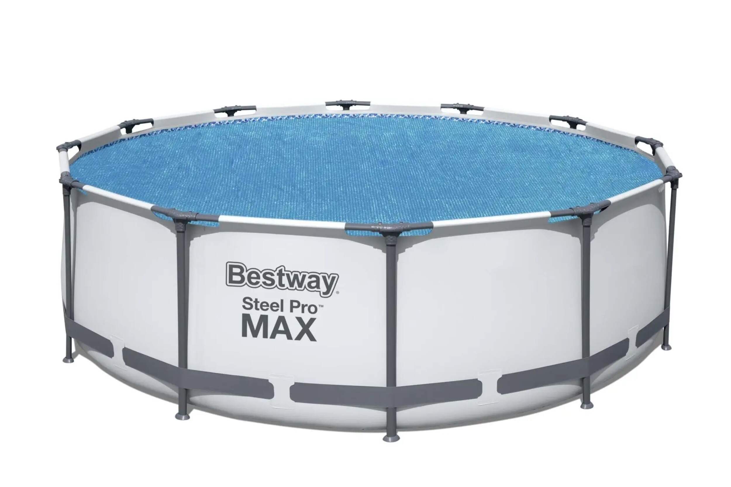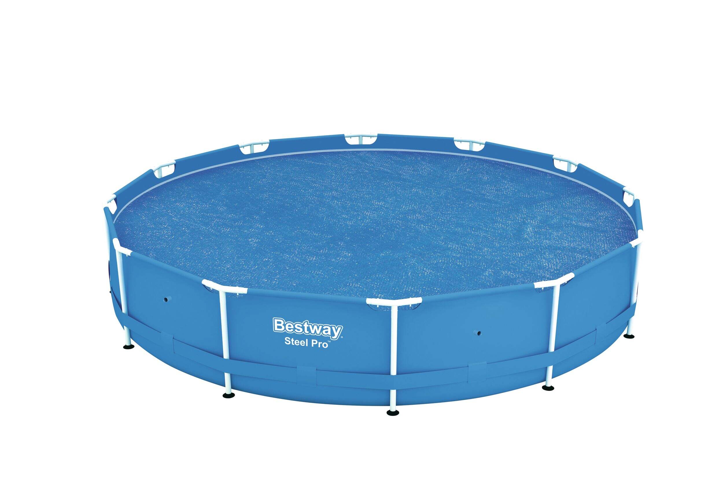 Keep water and heat in and debris, leaves, and trash out of your pool with this Flowclear™ Solar Pool Cover. Above ground swimming solar pool covers create a greenhouse effect in your pool. Solar covers also prevent water evaporation caused by dry winds, or free-chlorine loss caused by UV rays. These covers are designed to keep water and heat in, but debris out. Extend your swimming season with a Bestway® Solar Pool Cover. Fits 12'/3.66m Fast Set™ and Steel Pro™ Pools.