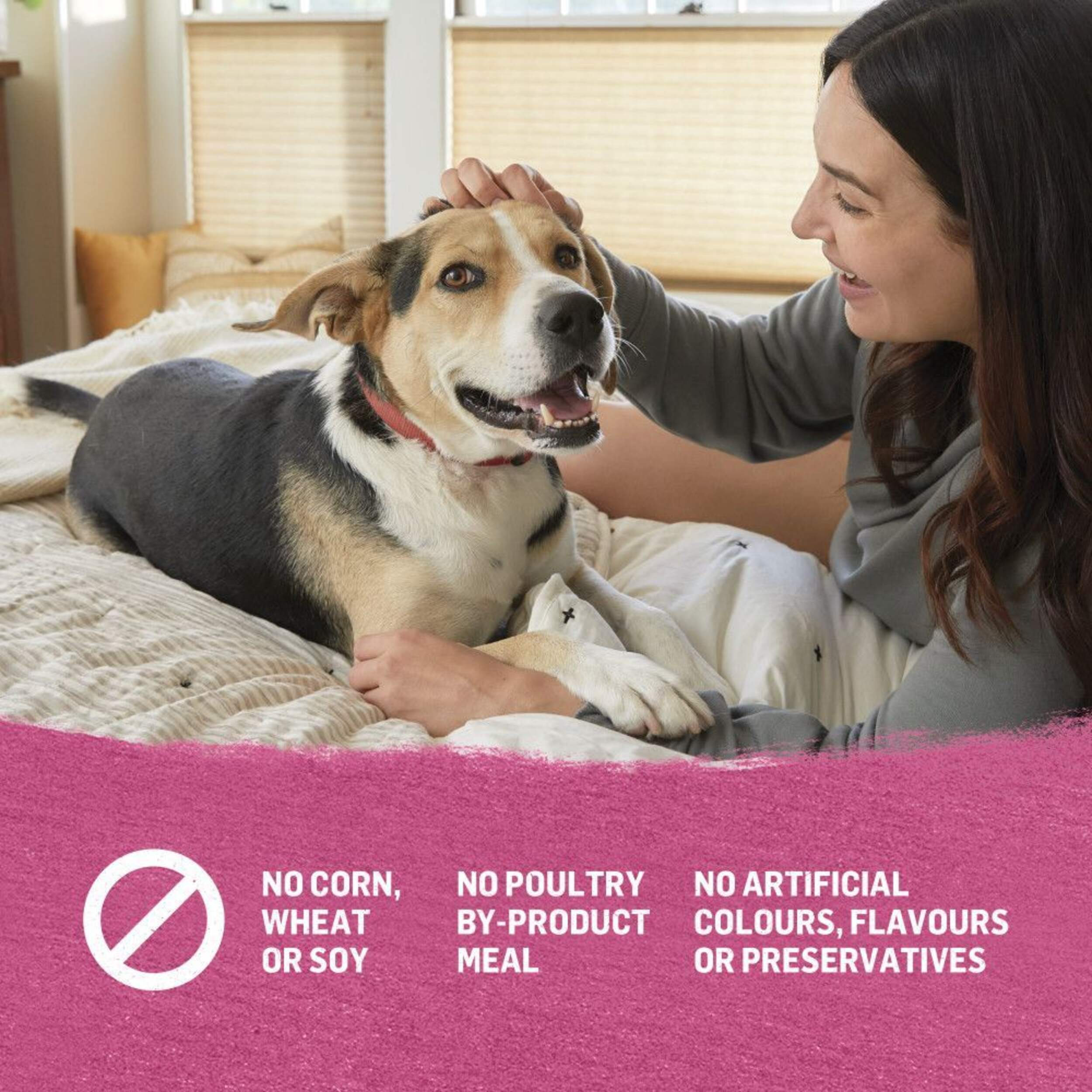 The high protein dog food recipe includes no corn, soy or poultry-by-product meal and no artificial colours, flavours or preservatives, so your dog gets the nourishment they need and nothing they don’t