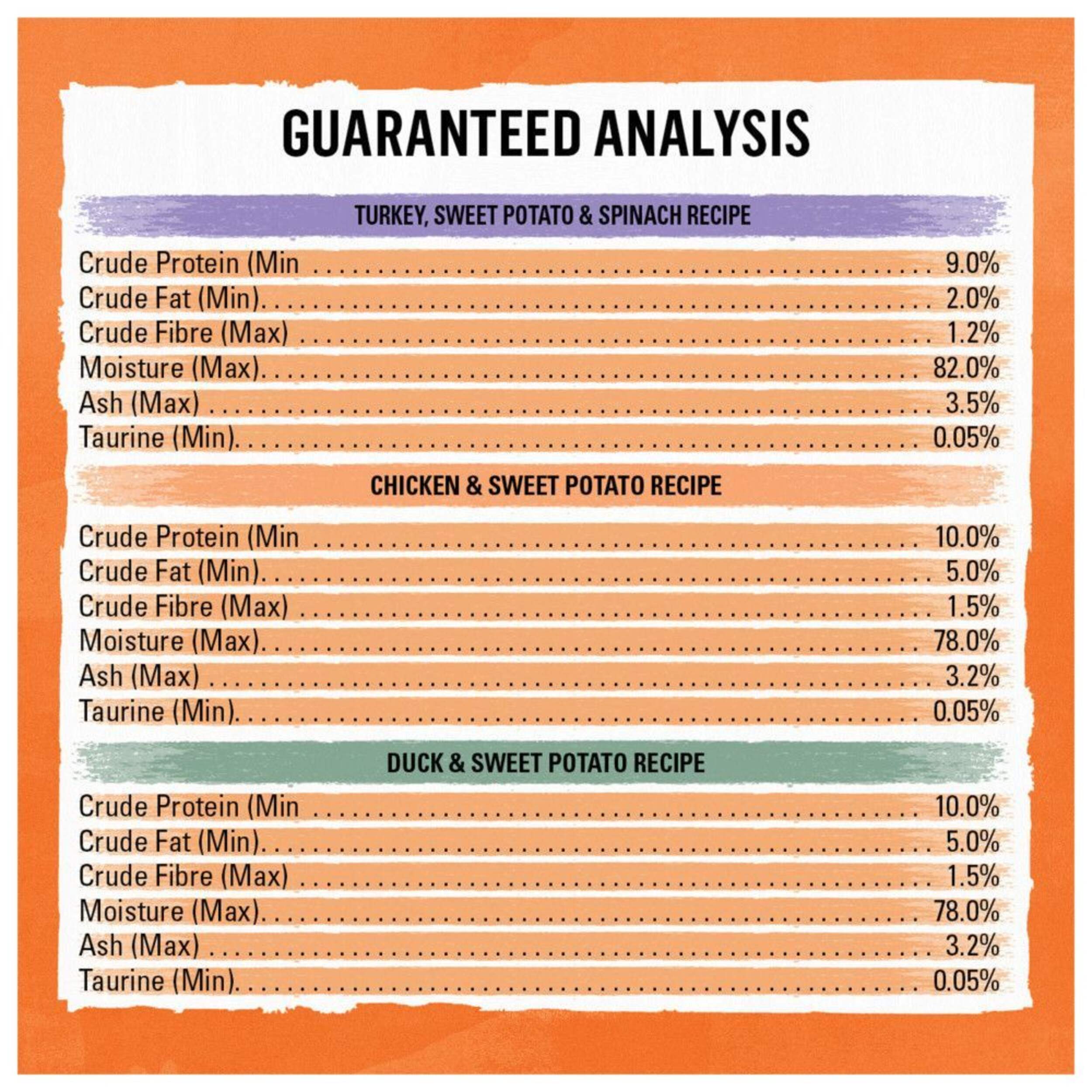 | Food Flavour | Chicken | Chicken | Chicken | Chicken, Turkey, Duck, Sweet Potato | Salmon | |