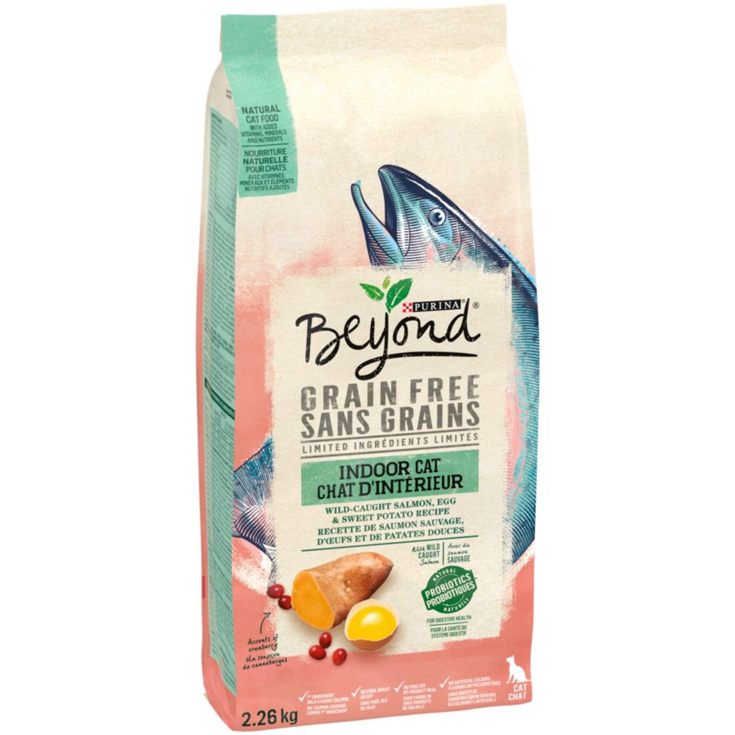 Serve your indoor cat food designed to meet their unique needs with Purina® Beyond® Simply Indoor Grain Free Salmon, Egg and Sweet Potato Recipe adult dry cat food. Every high-quality ingredient in our grain free cat food recipe comes from our trusted sources and carefully selected to help support your cat's long, healthy life with you. Our high protein cat food starts with real wild-caught salmon as the #1 ingredient and contains antioxidants to help support a healthy immune system. Plus, we include natural fibre for hairball control and probiotics to help support your cat's digestive health. With 10% less fat than our Purina Beyond Simply White Meat Chicken and Whole Oat Meal Recipe, this protein-rich, weight control cat food also helps your cat maintain a healthy weight.