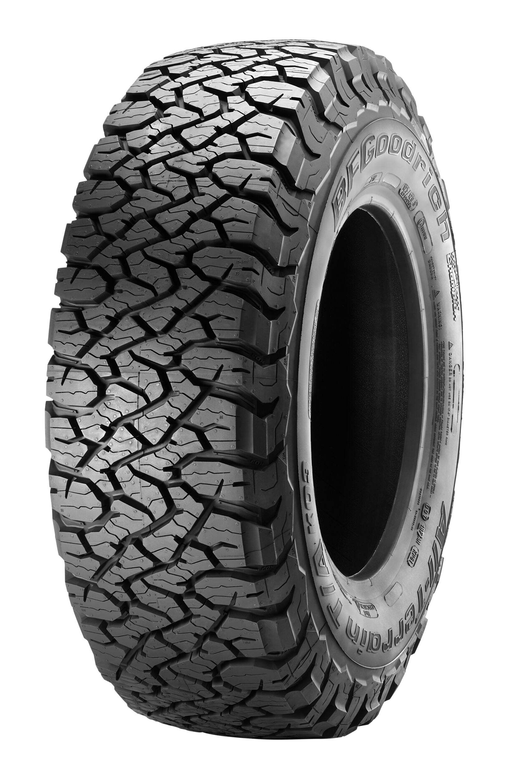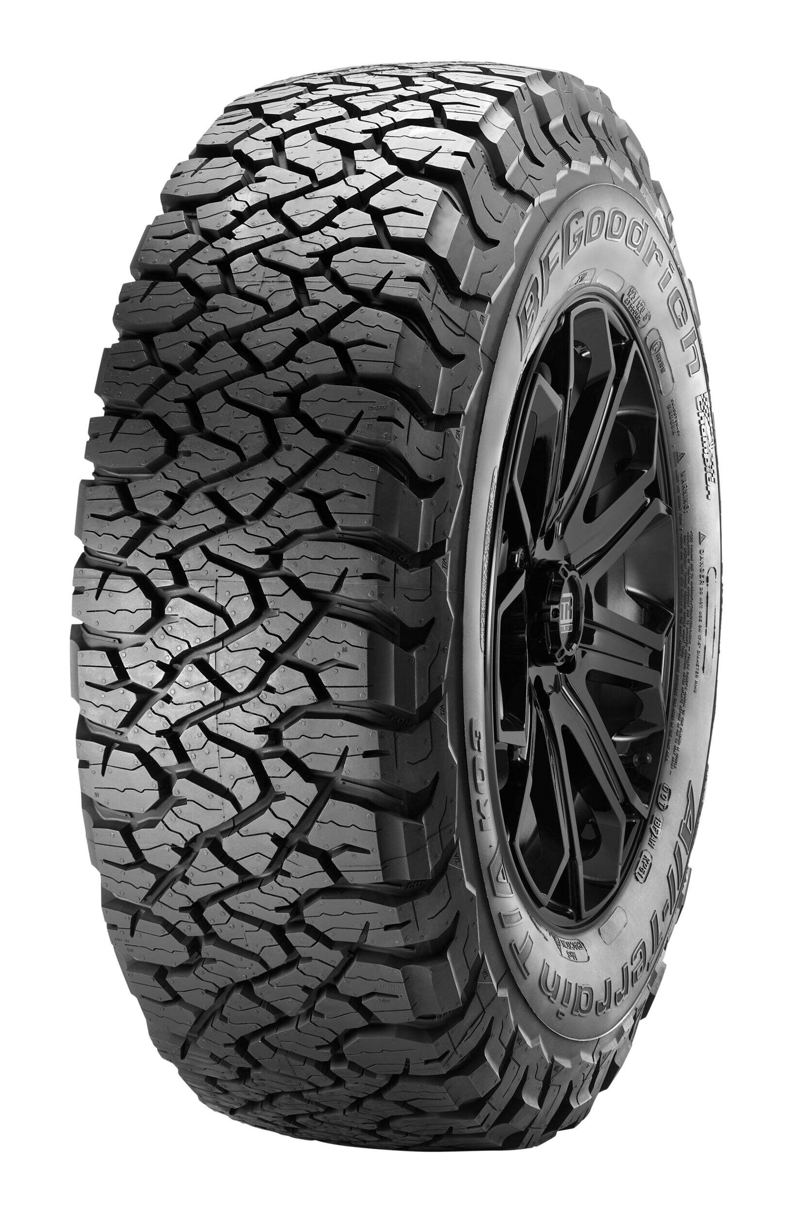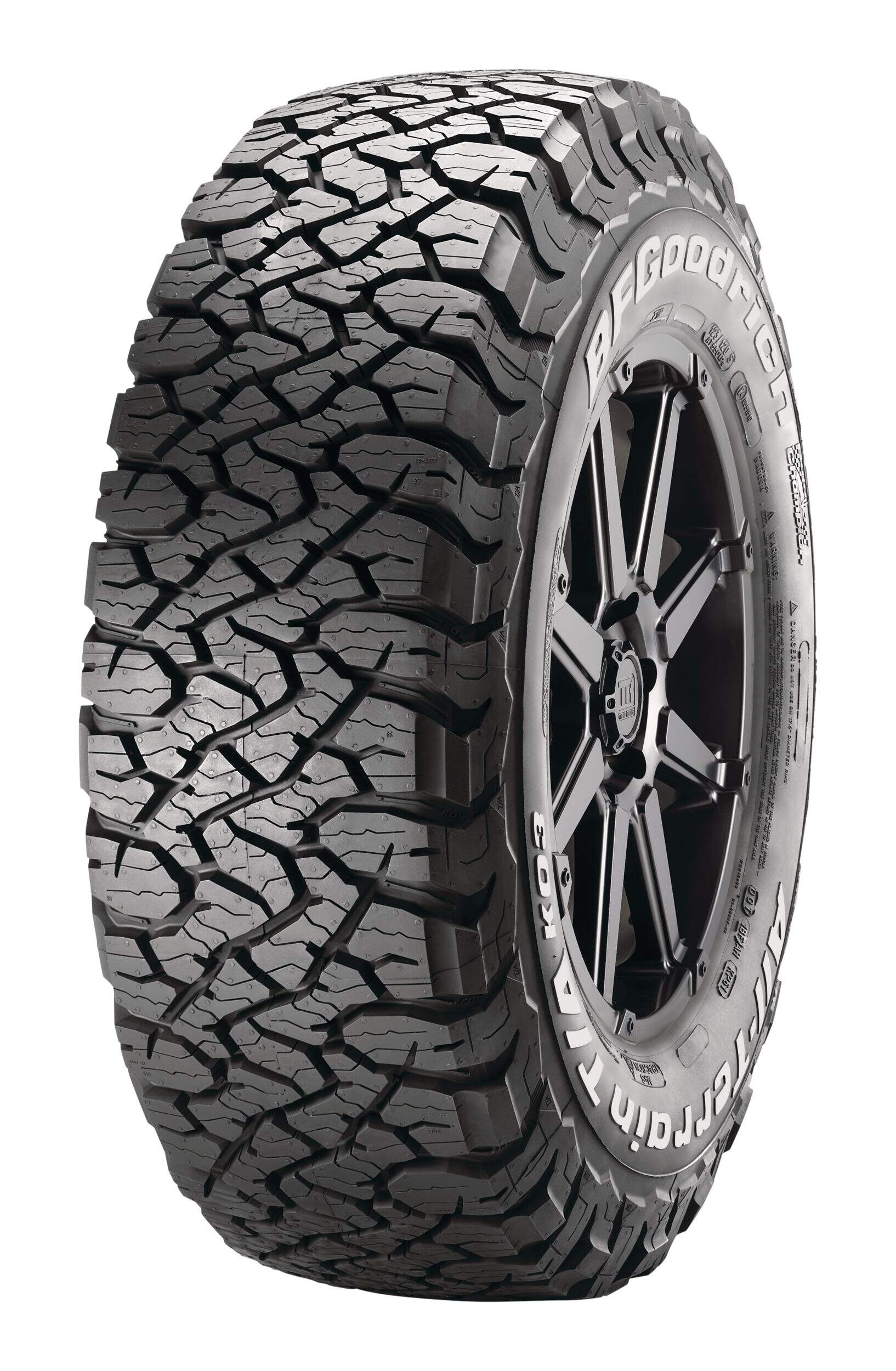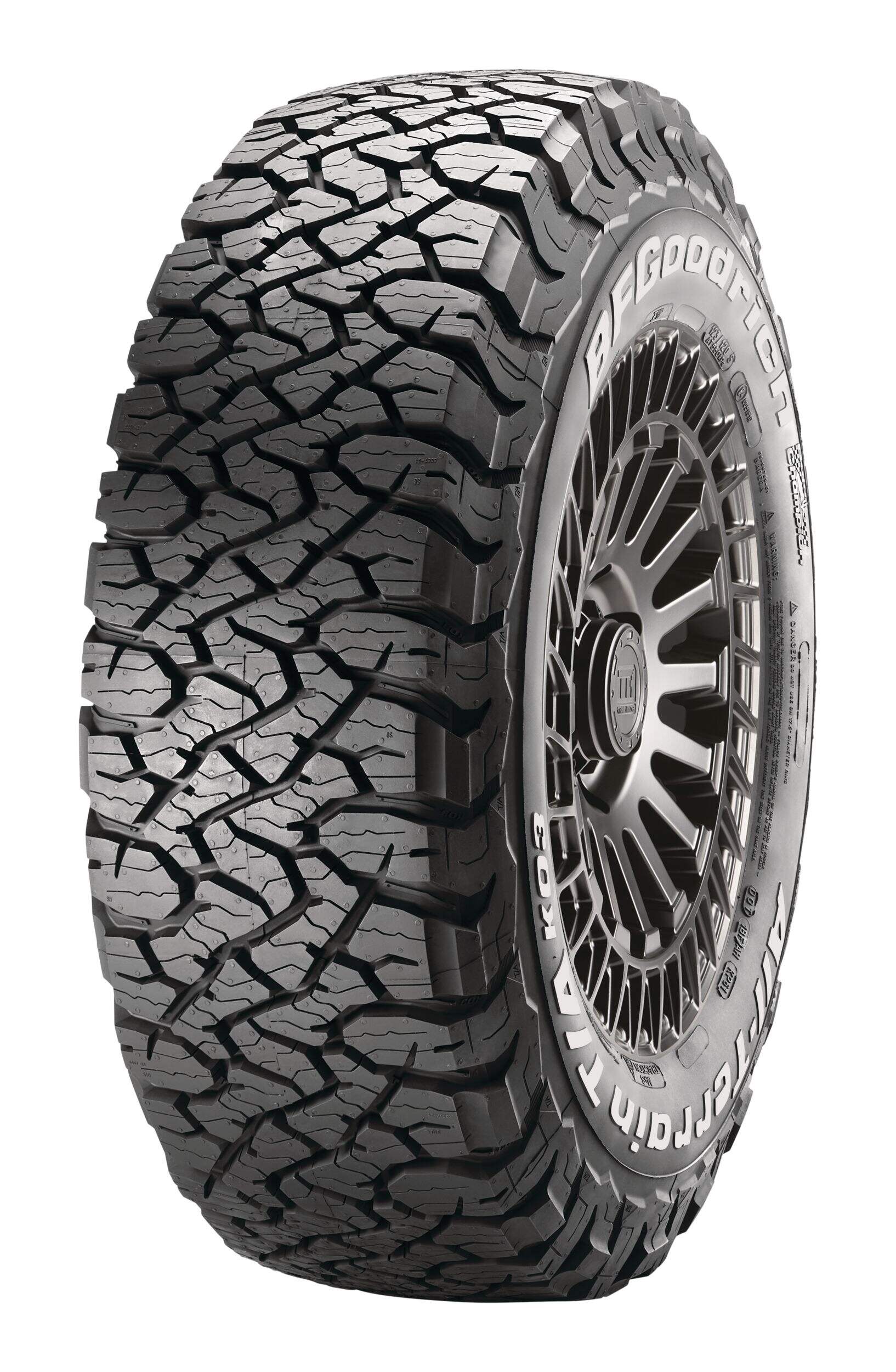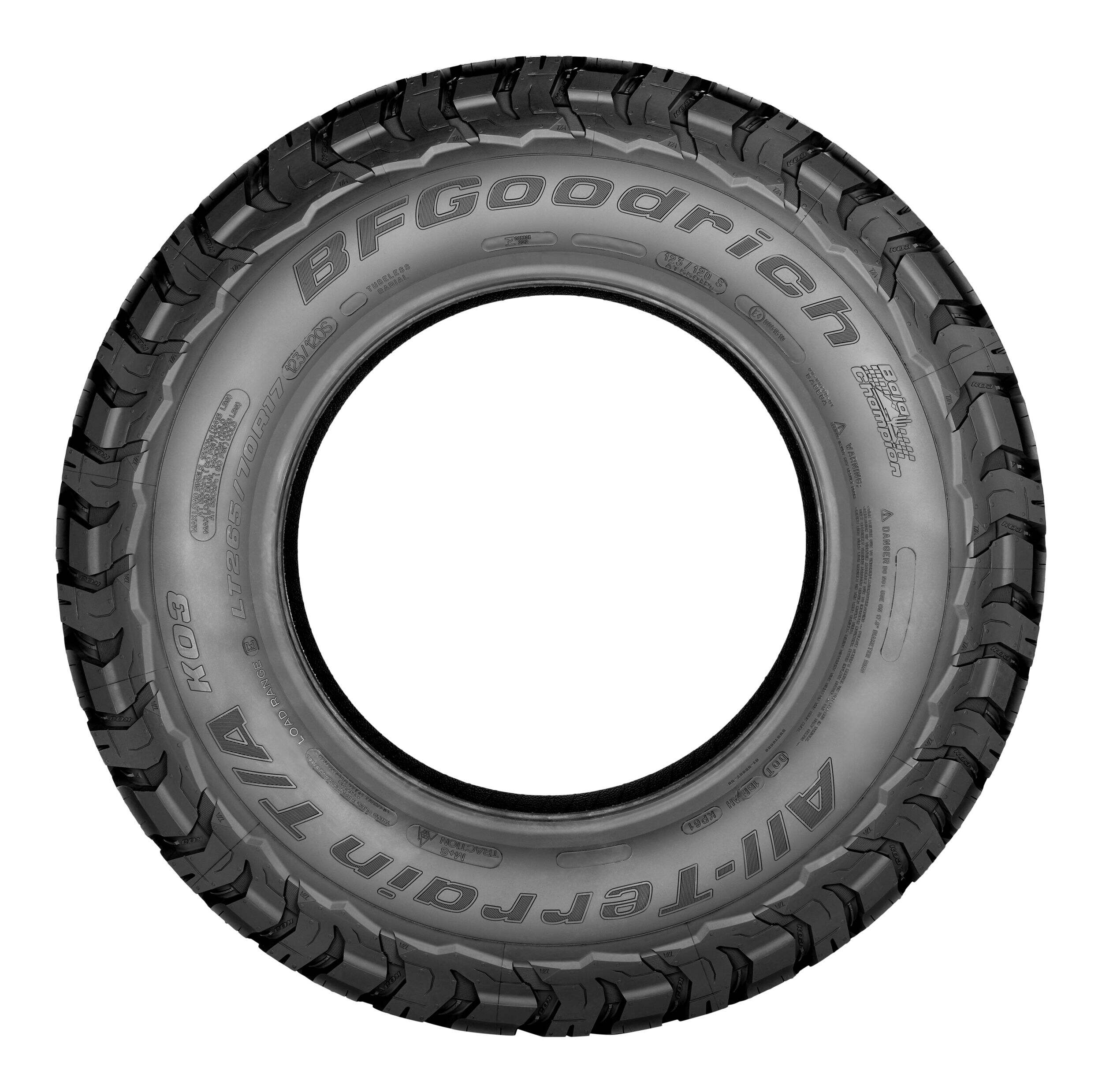 BFGoodrich KO3 tires feature a reformulated cut-, chip- and tear-resistant tread compound for delivering outstanding durability, improved wear-life and traction in all weather conditions, even light snow. The tires meet the industry's severe snow service requirements and are branded with the three-peak mountain snowflake (3PMSF) symbol.