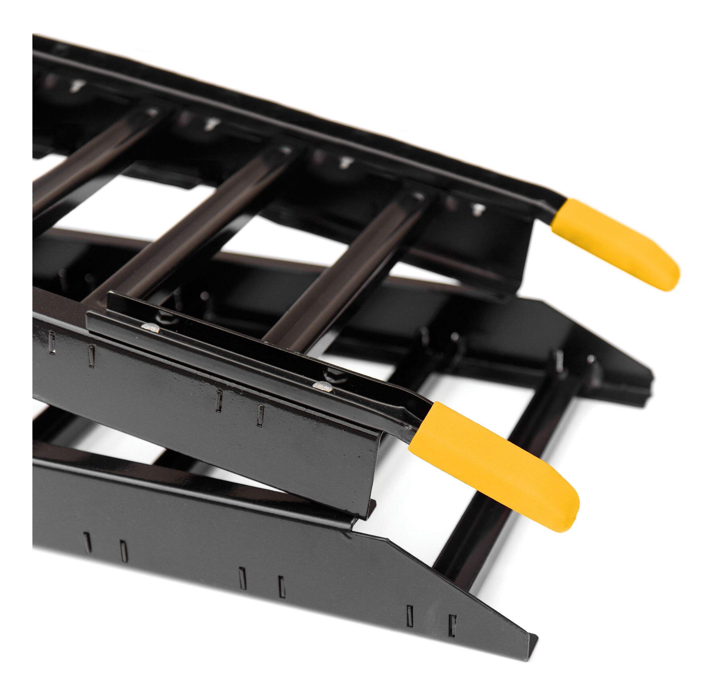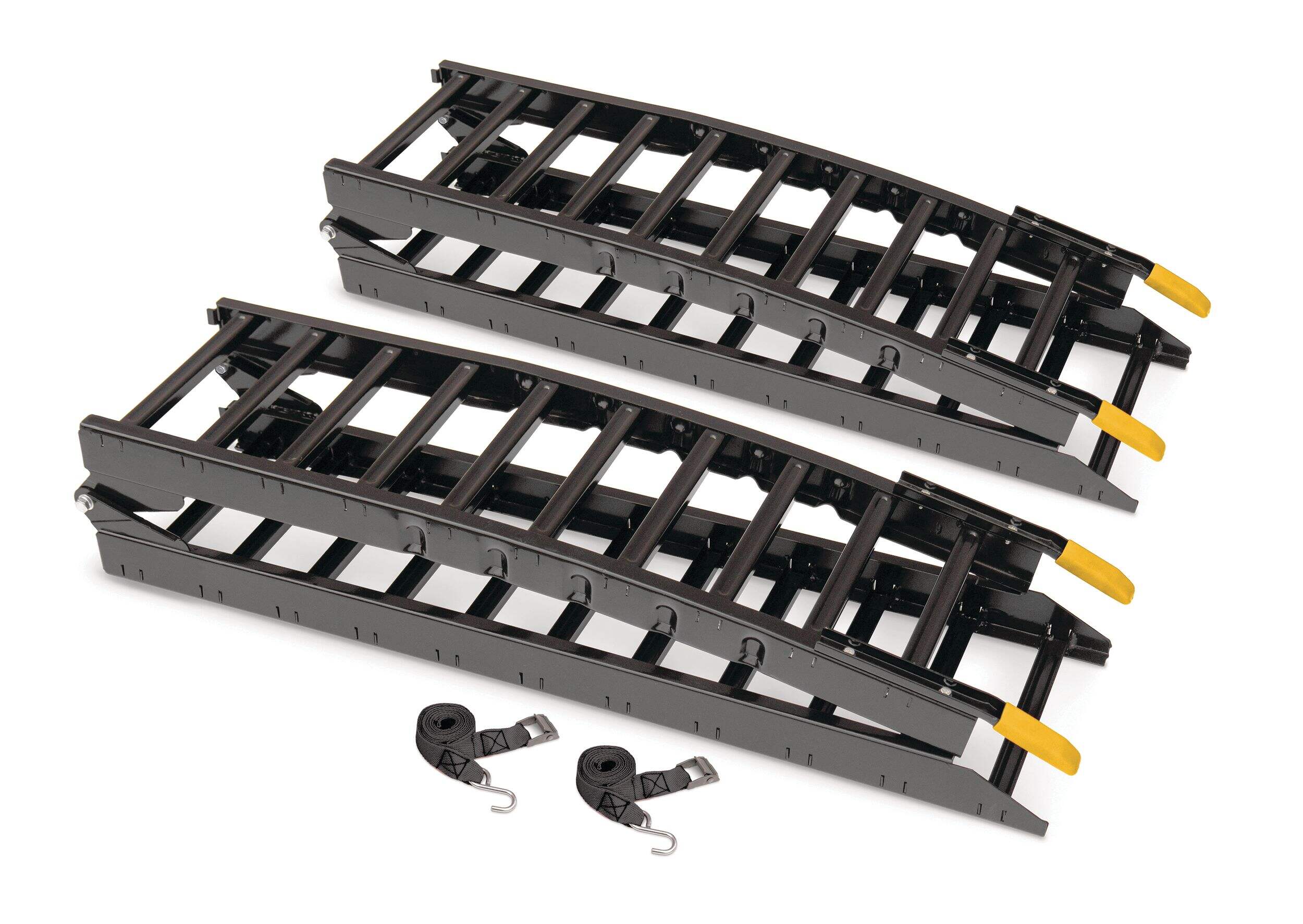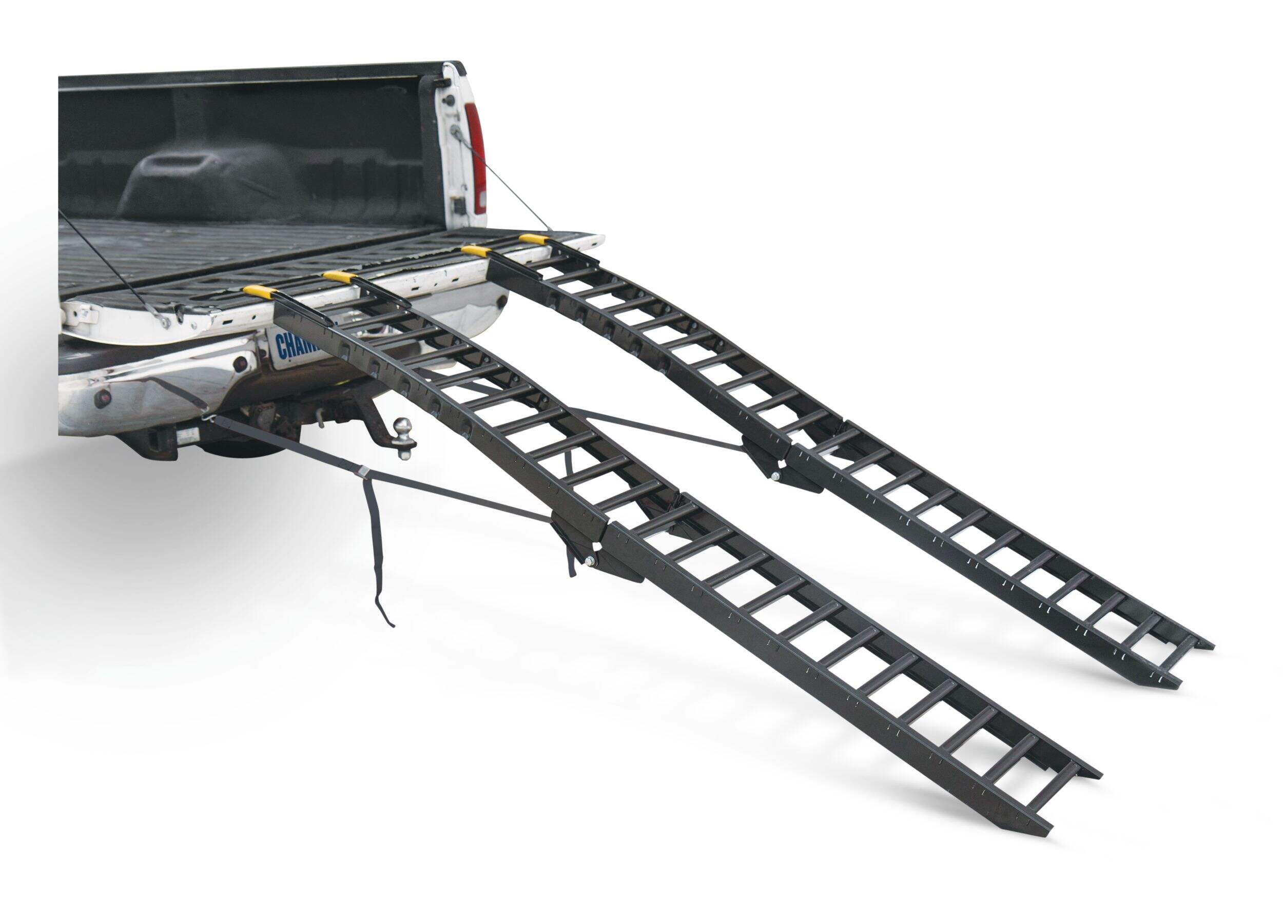 Champion’s folding steel loading ramps are the perfect solution for loading ATVs, lawn tractors, snow blowers, and other equipment onto your truck or trailer bed. Tough enough to handle up to 1500 pounds total or 750 pounds each, the 7-foot ramps fold up for convenient storage and easy portability.