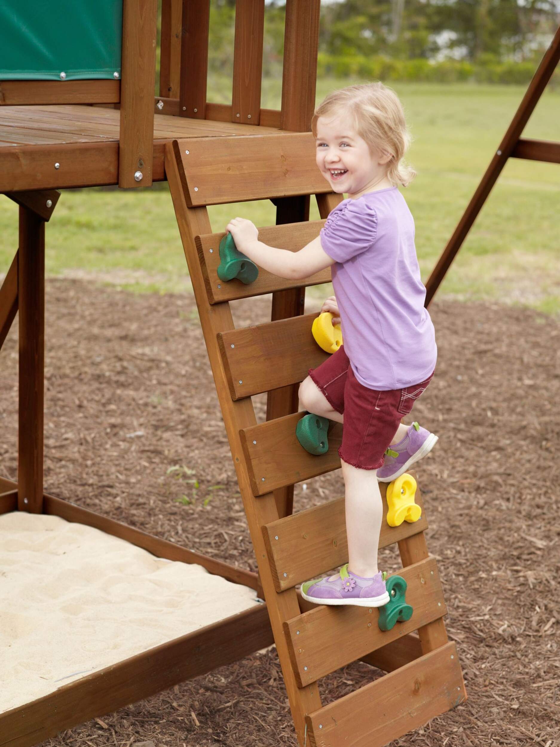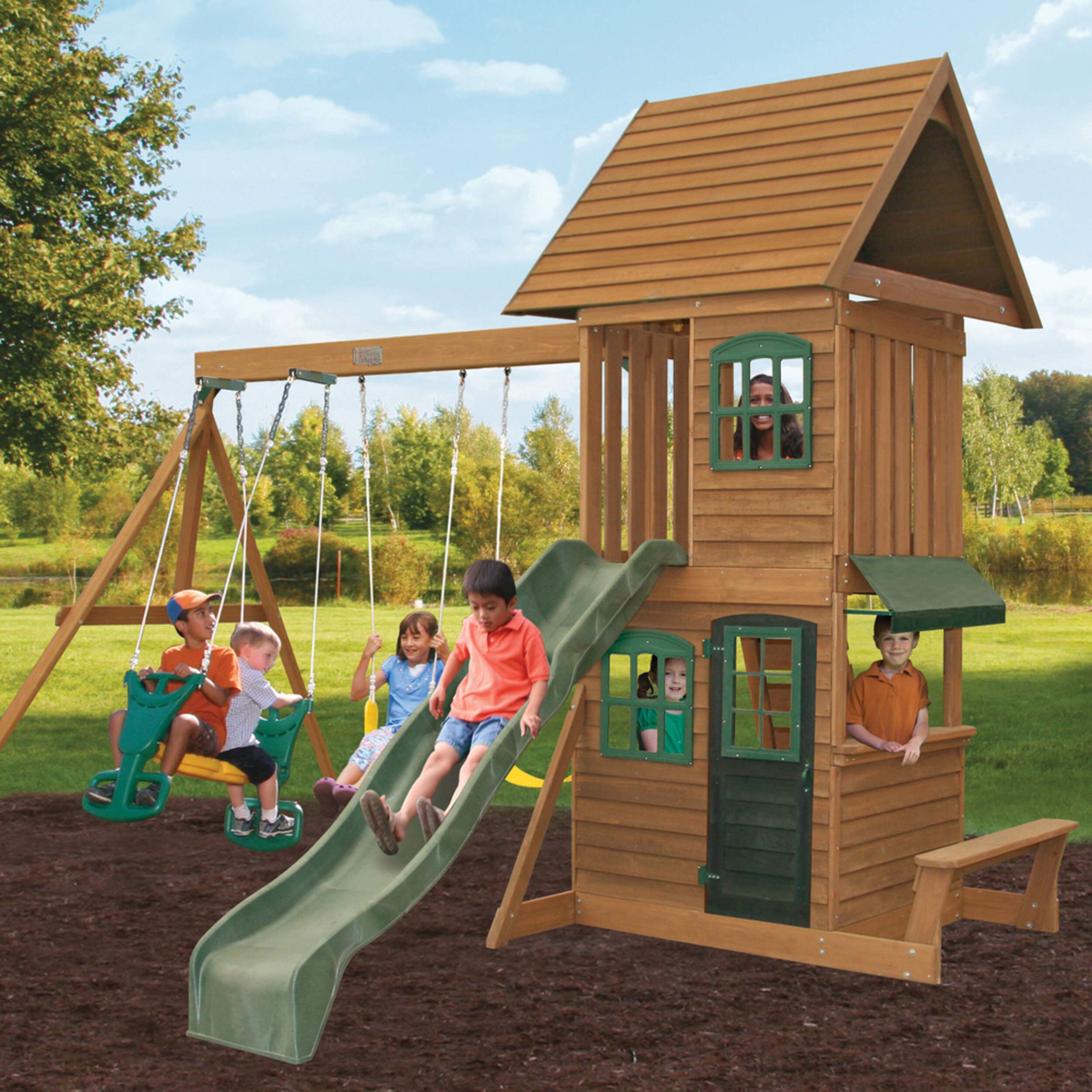 Big Backyard Windale Wooden Play Centre features a wooden roof, upper and lower clubhouse, shaded café table and bench, rockwall, 2 belt swings, 2-person premium glider, and a high rail wave slide
