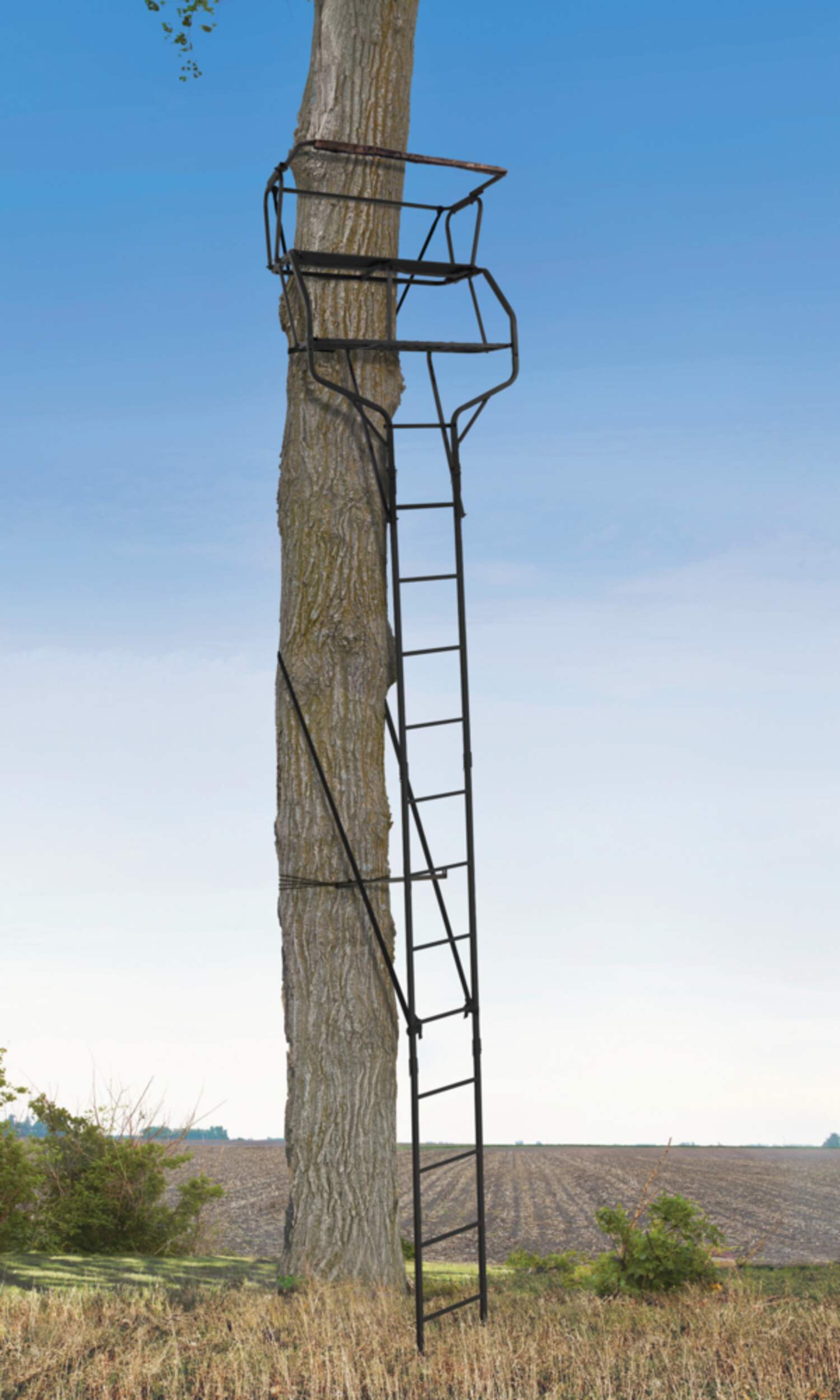 For hunters of all levels, the Big Game Guardian XLT is a spacious hunting stand. Standing 18-ft and weighing just over 50 lbs, this durable hunting essential has enough room for two. The adjustable support bar and safety harnesses keep things comfortable and safe, while the powder coated XLT steel frame is sturdy and stable. The padded shooting rail flips up when needed, while the stand’s built-in seat is uniquely contoured for added comfort.