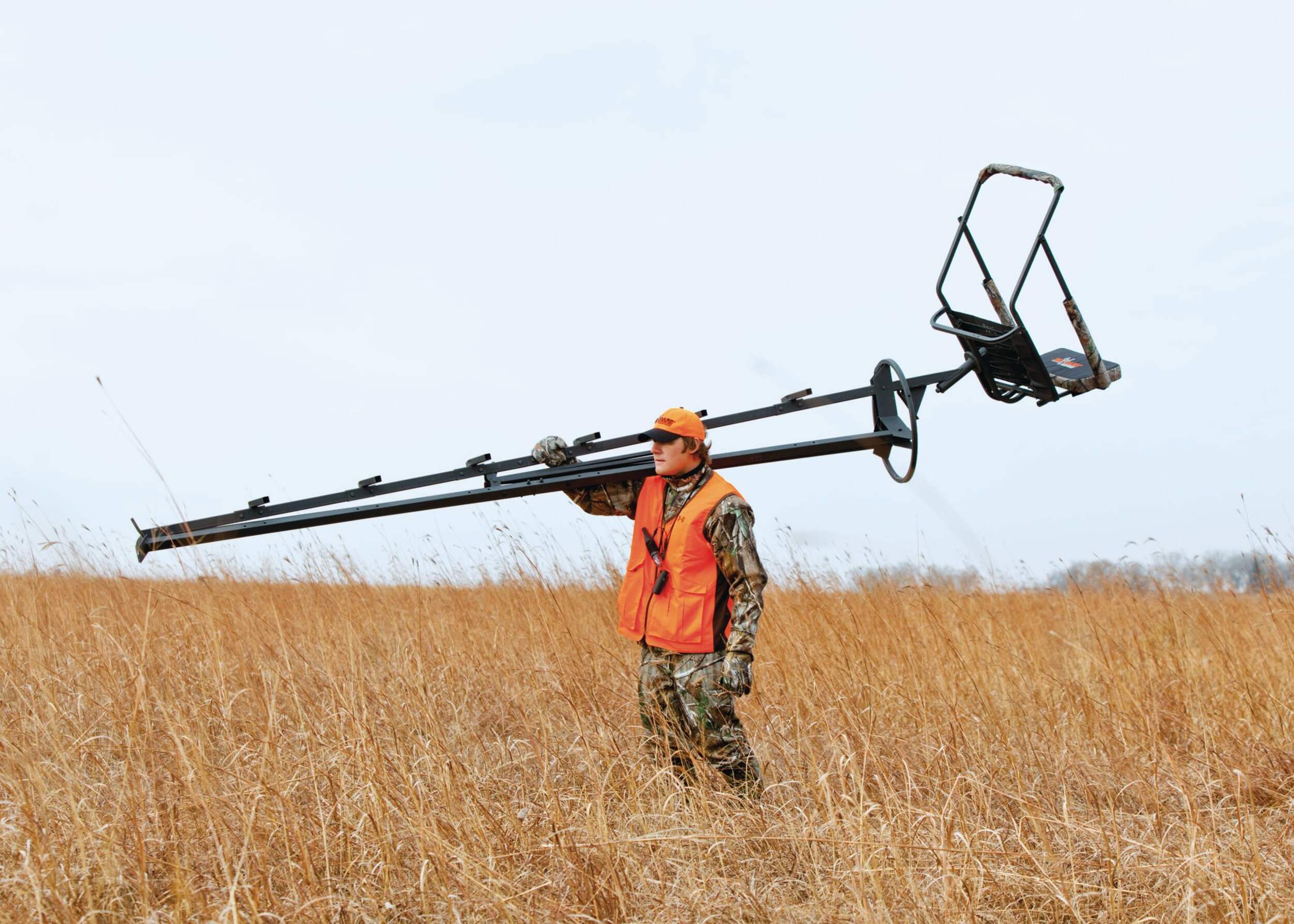 Big Game Pursuit Tripod 12 Foot Tall Platform Stand. The portable design offers ultimate mobility. The seat and rail rotate 360 degrees. The padded stationary shooting rail provides a stable rest. With an easy-to-handle weight of just 66 pounds, this tripod provides the ultimate in portability. It is easy to locate near the hottest scrapes, runways, and bedding areas. The tripod's shooting rail height of 12 feet greatly increases your field of view, and both the seat and rail rotate a full 360 degrees for ease of shooting at all angles. Fold-down legs allow for easy transport and storage. Durable steel construction provides Rock Solid™ stability. The 22-inch wide by 13-inch deep seat uses Flex Core™ technology, which provides exceptional support and comfort. The backrest cushion is 8 inches high by 14 inches wide by 2 inches thick to support and cradle your back. Weight capacity: 300 pounds. Weight: 66 pounds.
