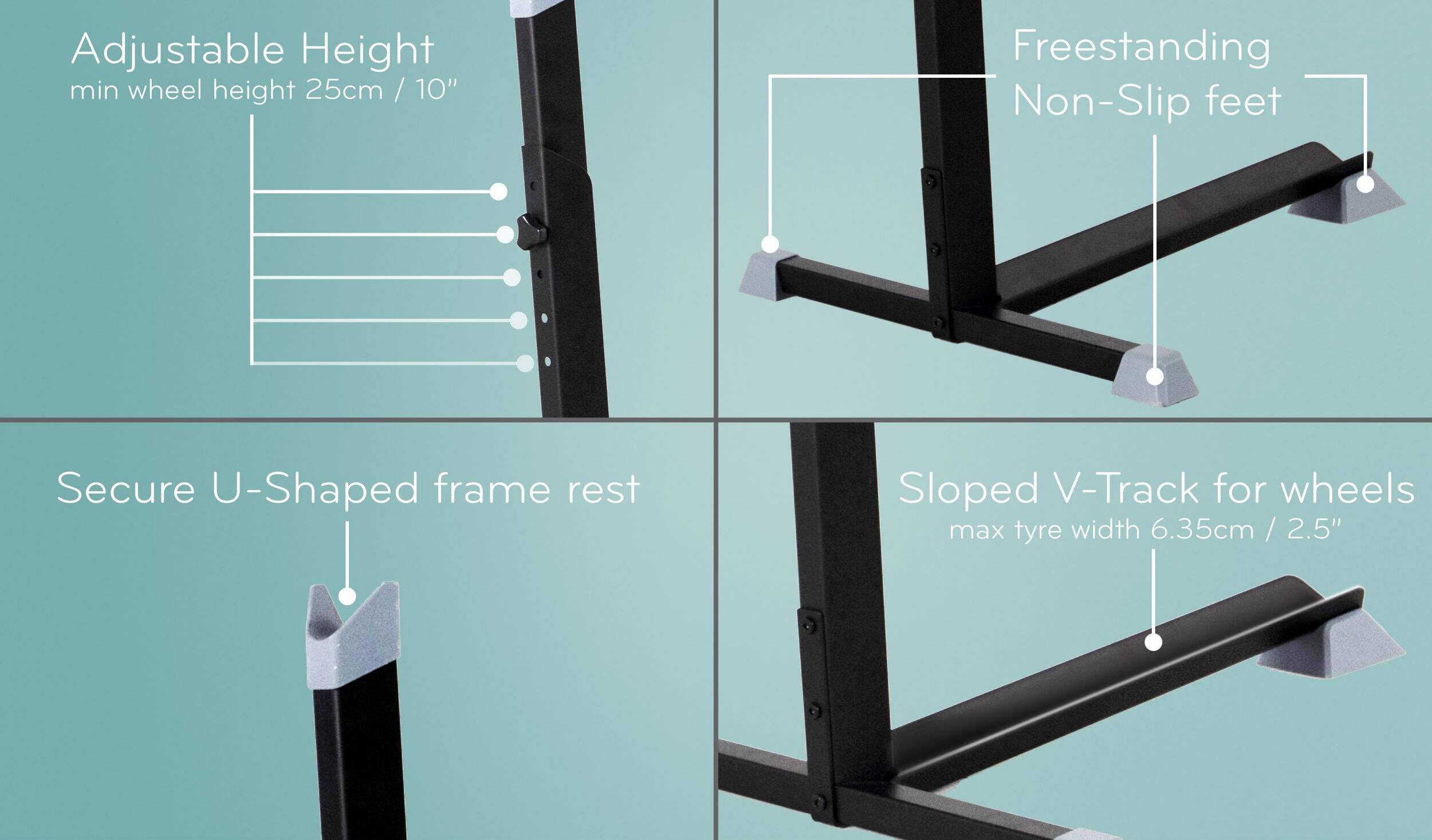 Let’s you keep your bike inside , ideal for condo’s, balconies, shed, covered porches, will not rust or leave marks