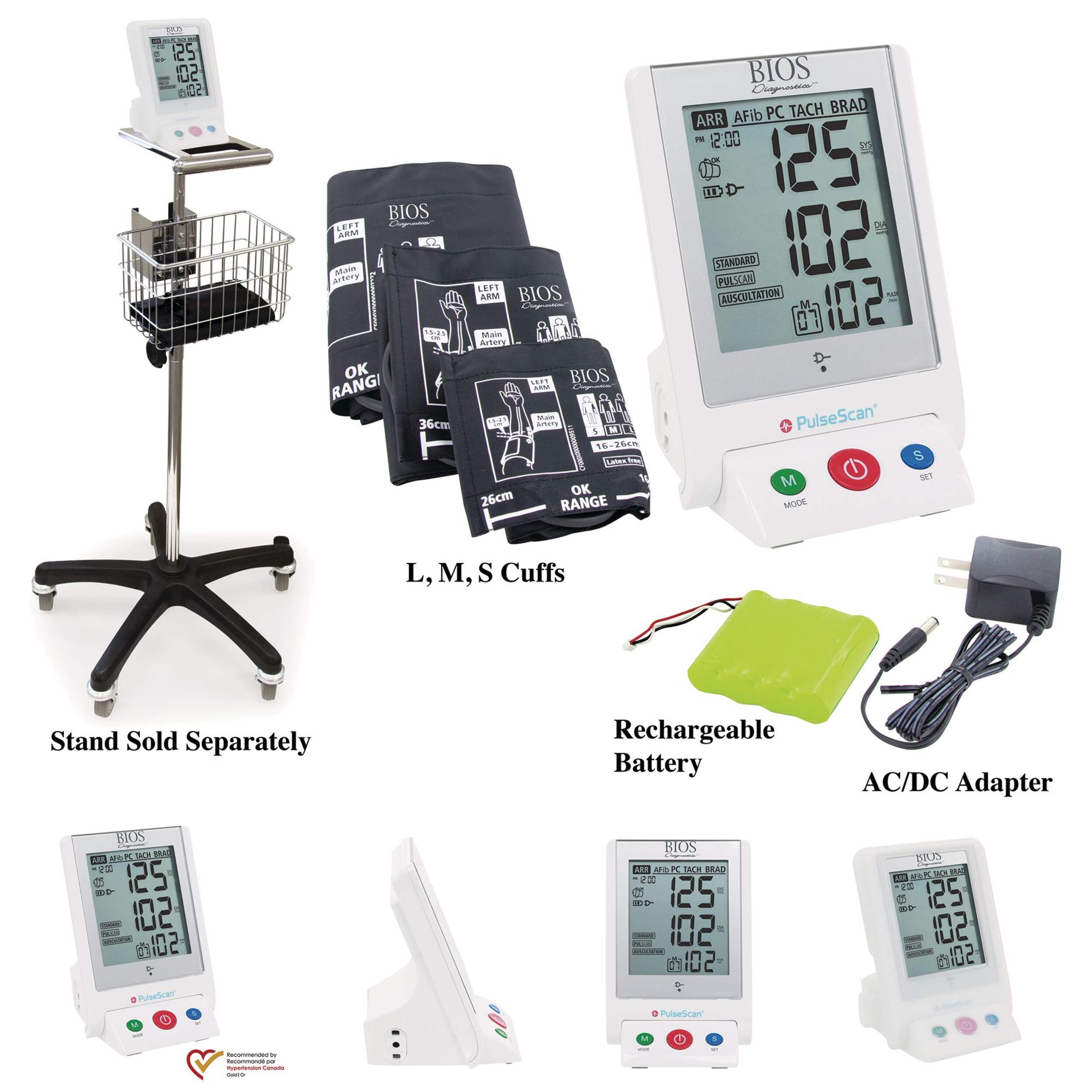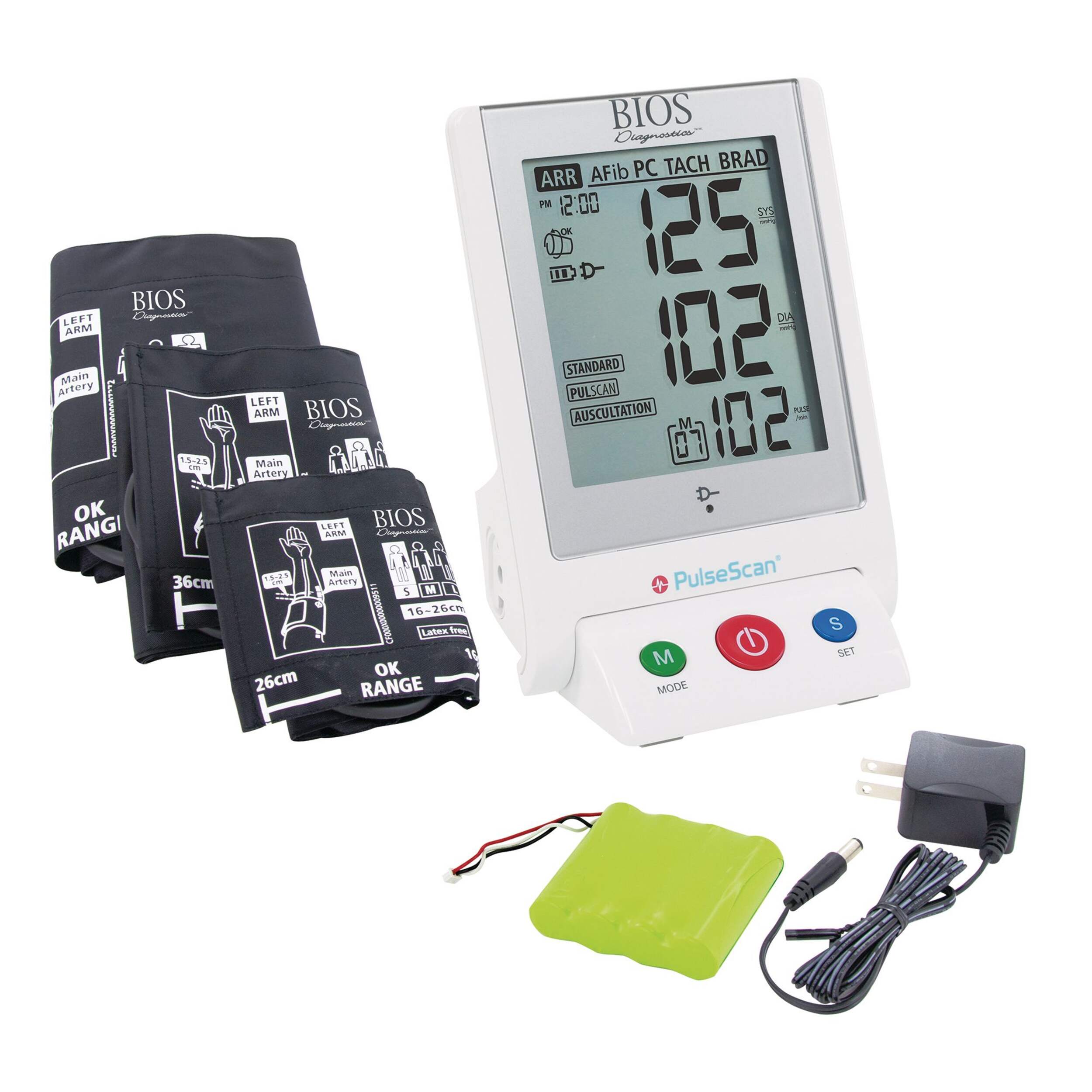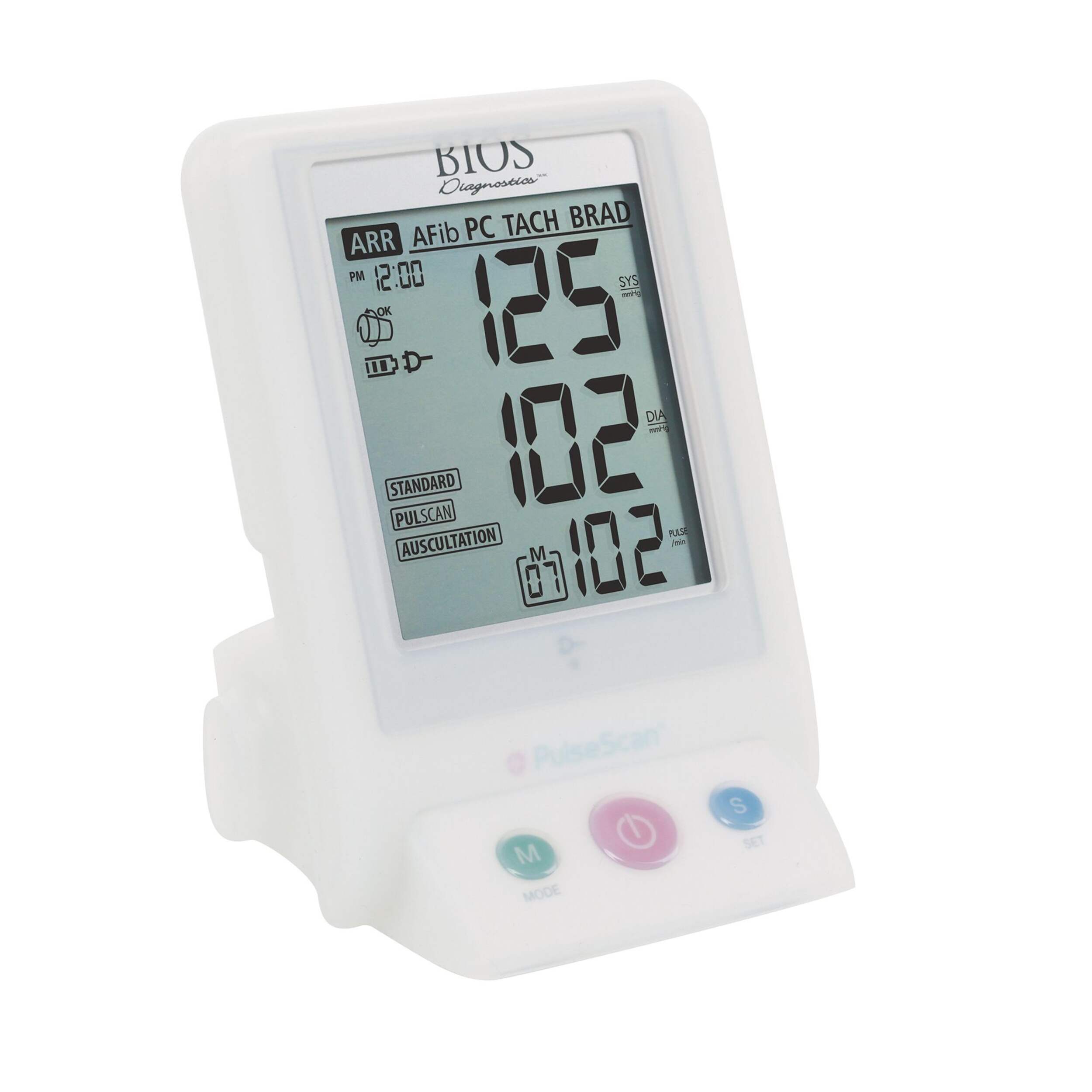 BIOS Automatic Office Blood Pressure Monitor features screens for pulse arrhythmia including afib, premature contraction, bradycardia, tachycardia, and non-specific arrhythmia