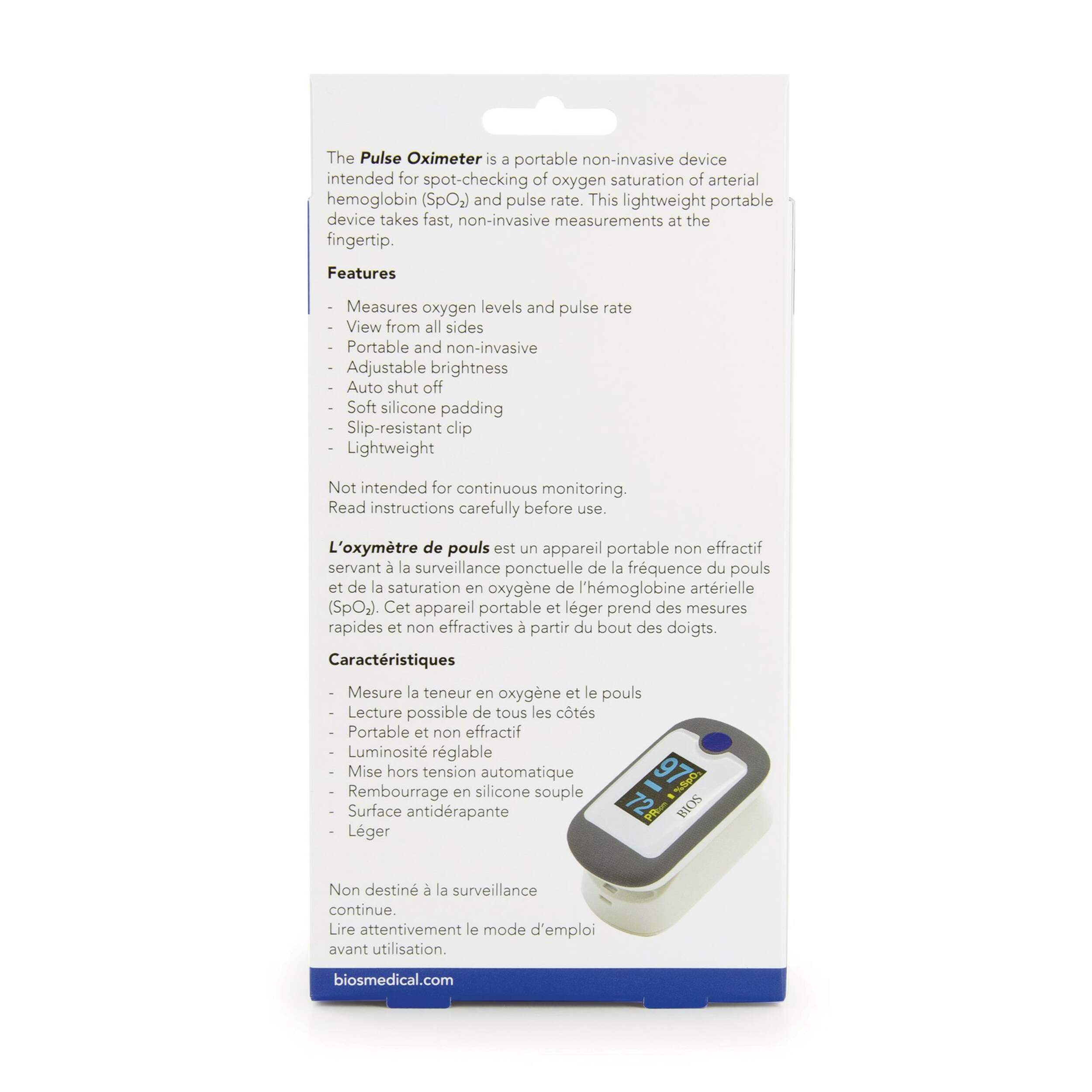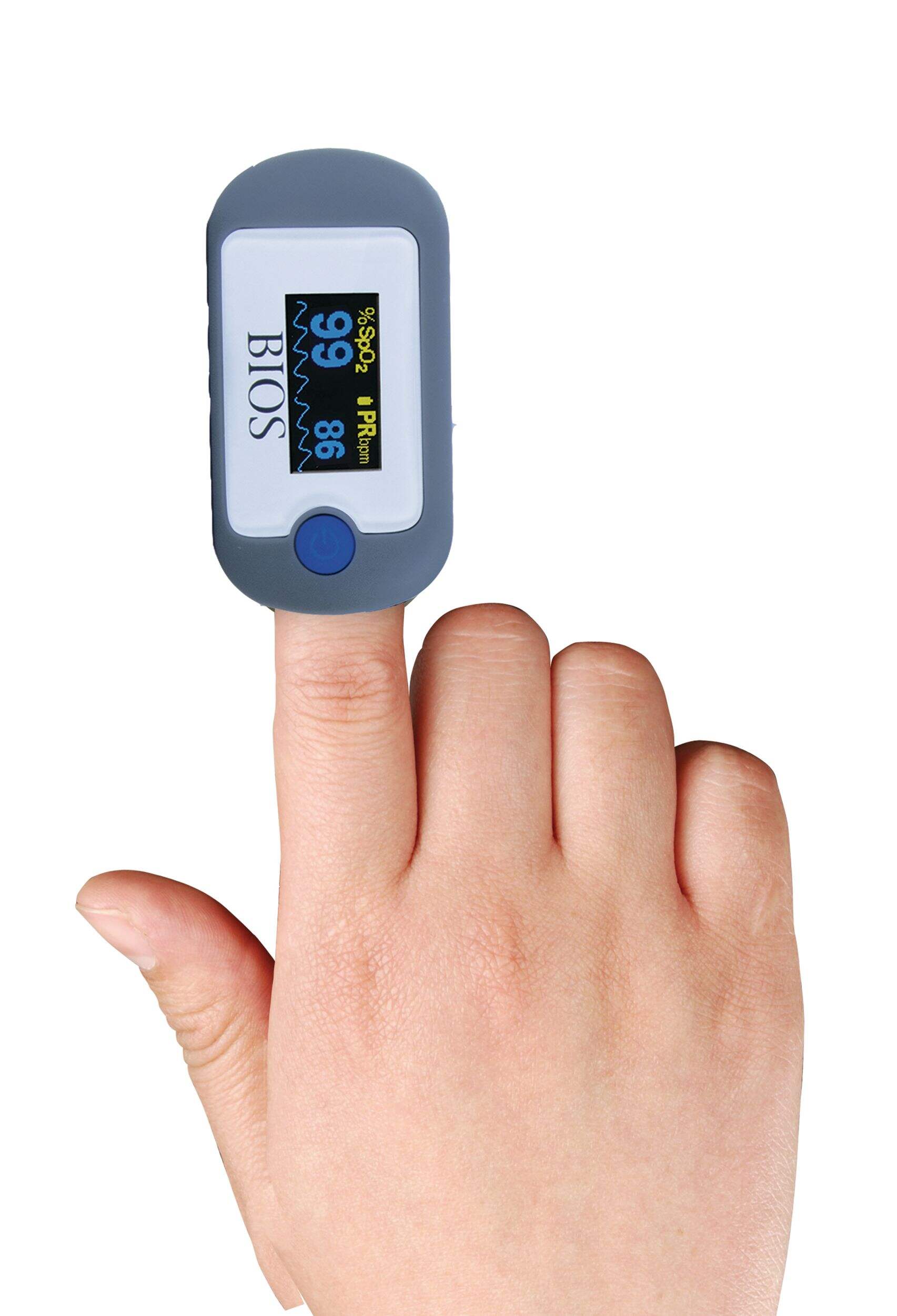 The BIOS Diagnostics Pulse Oximeter is a portable, non-invasive device intended to spot-check oxygen saturation of arterial hemoglobin (SPO2) and pulse rate. This lightweight and portable device takes fast, non-invasive measurements at the fingertip.