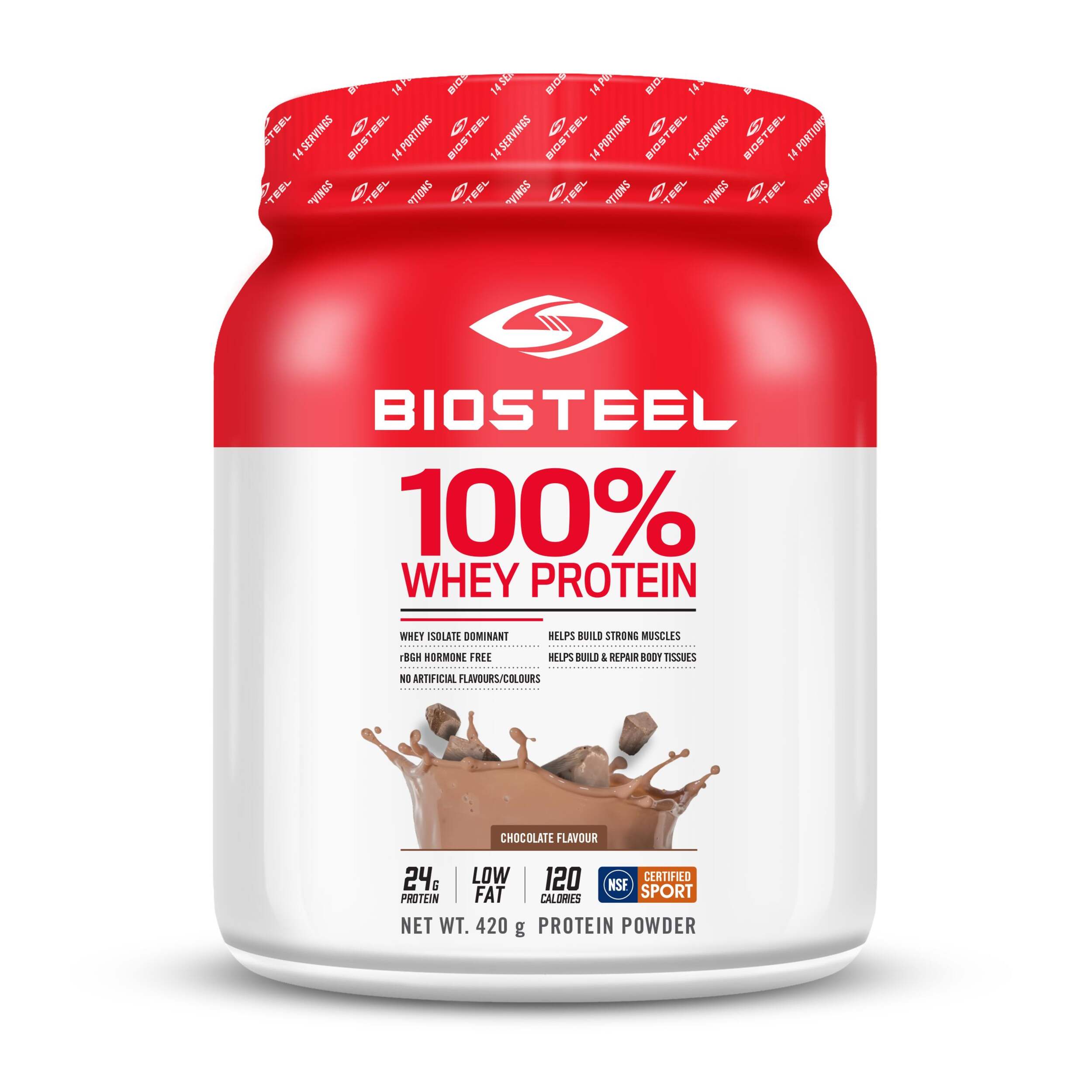 The BioSteel 100% Whey Protein Powder, No Artificial Colours or Flavours, Chocolate, 462-g, delivers essential proteins to your body after a workout