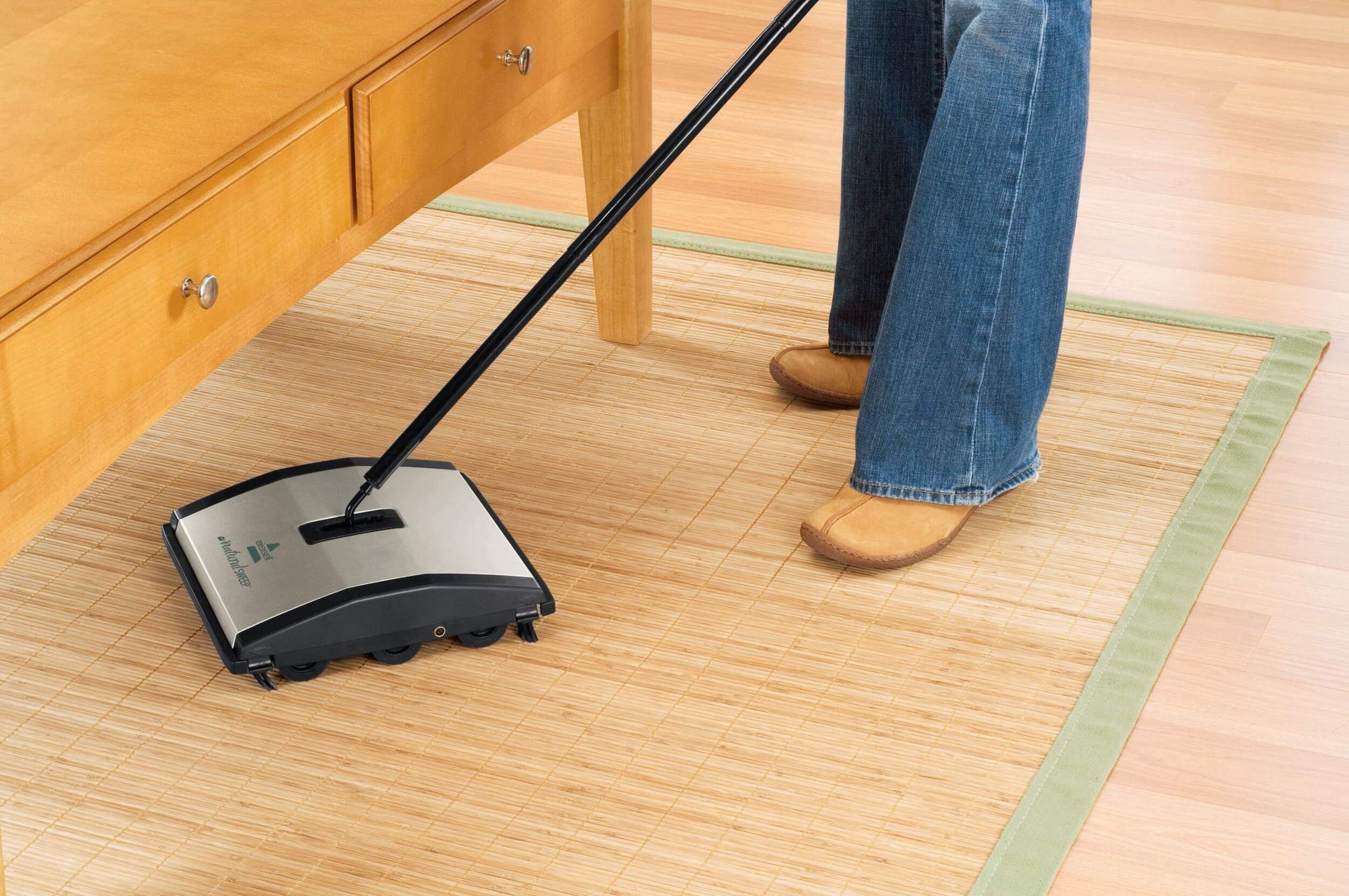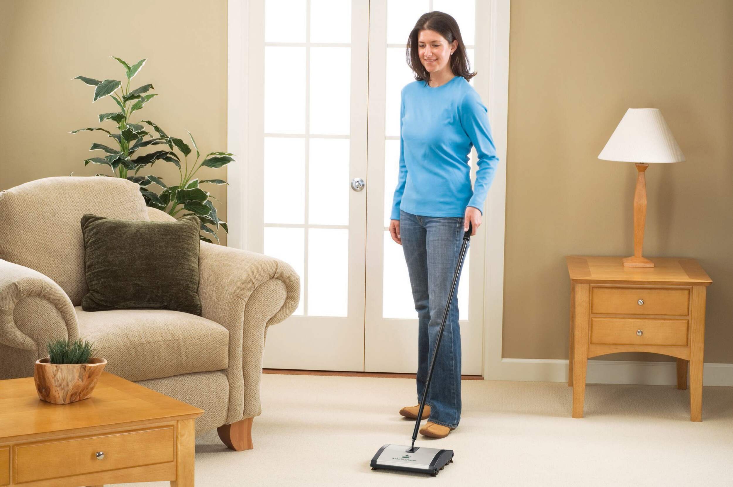 Other features: dual rotating brushes, no-slip handle that lies flat for low reach and easy to empty twin dirt pans