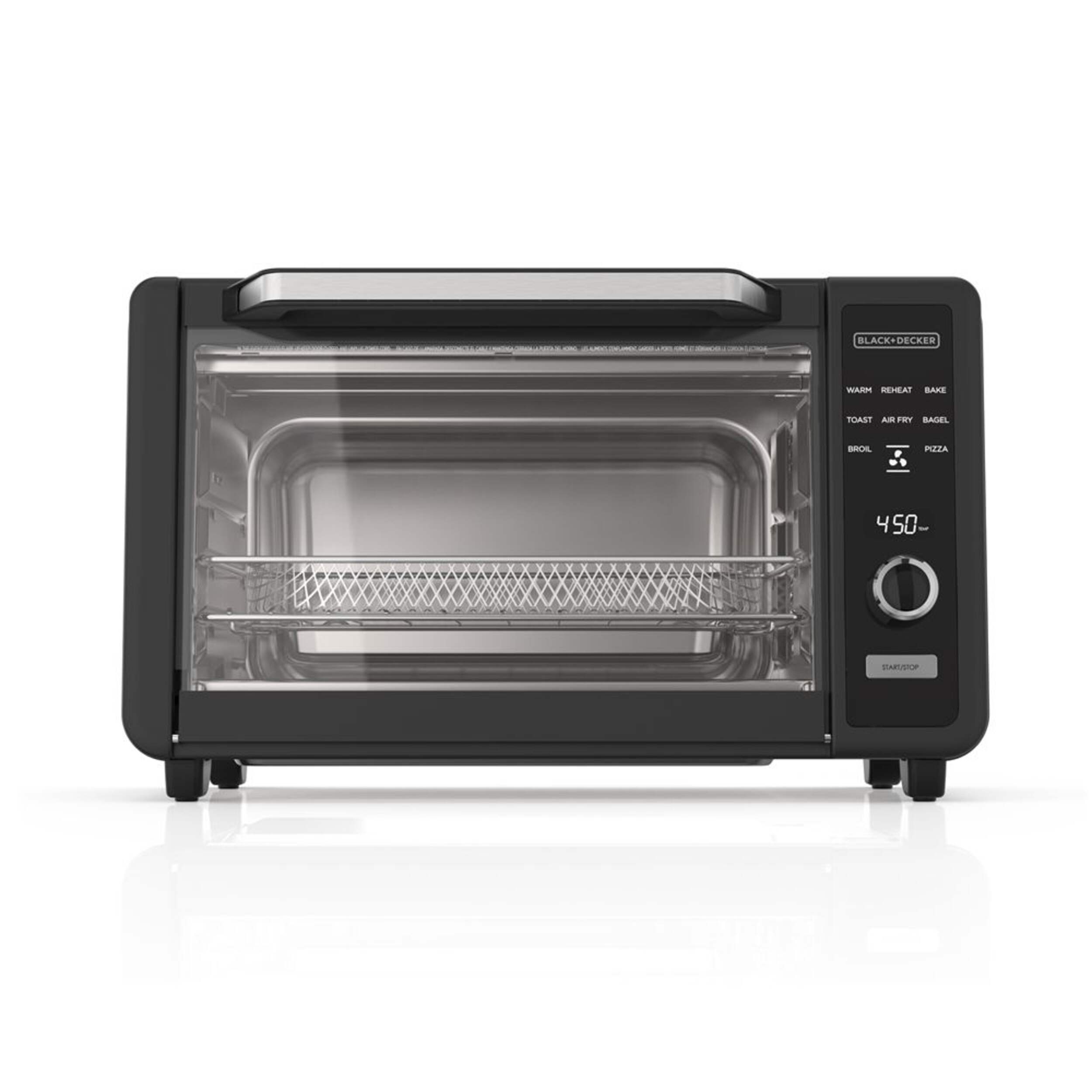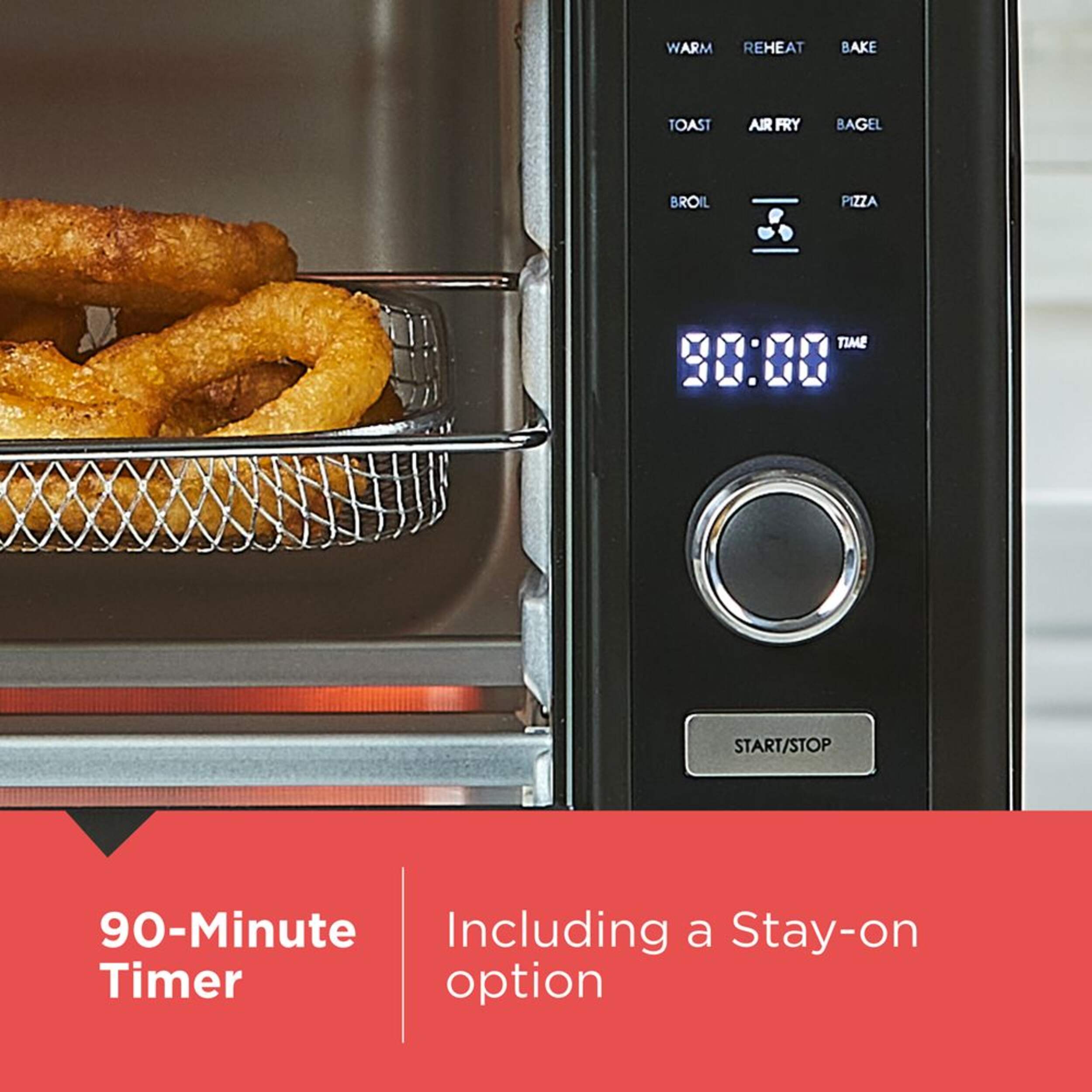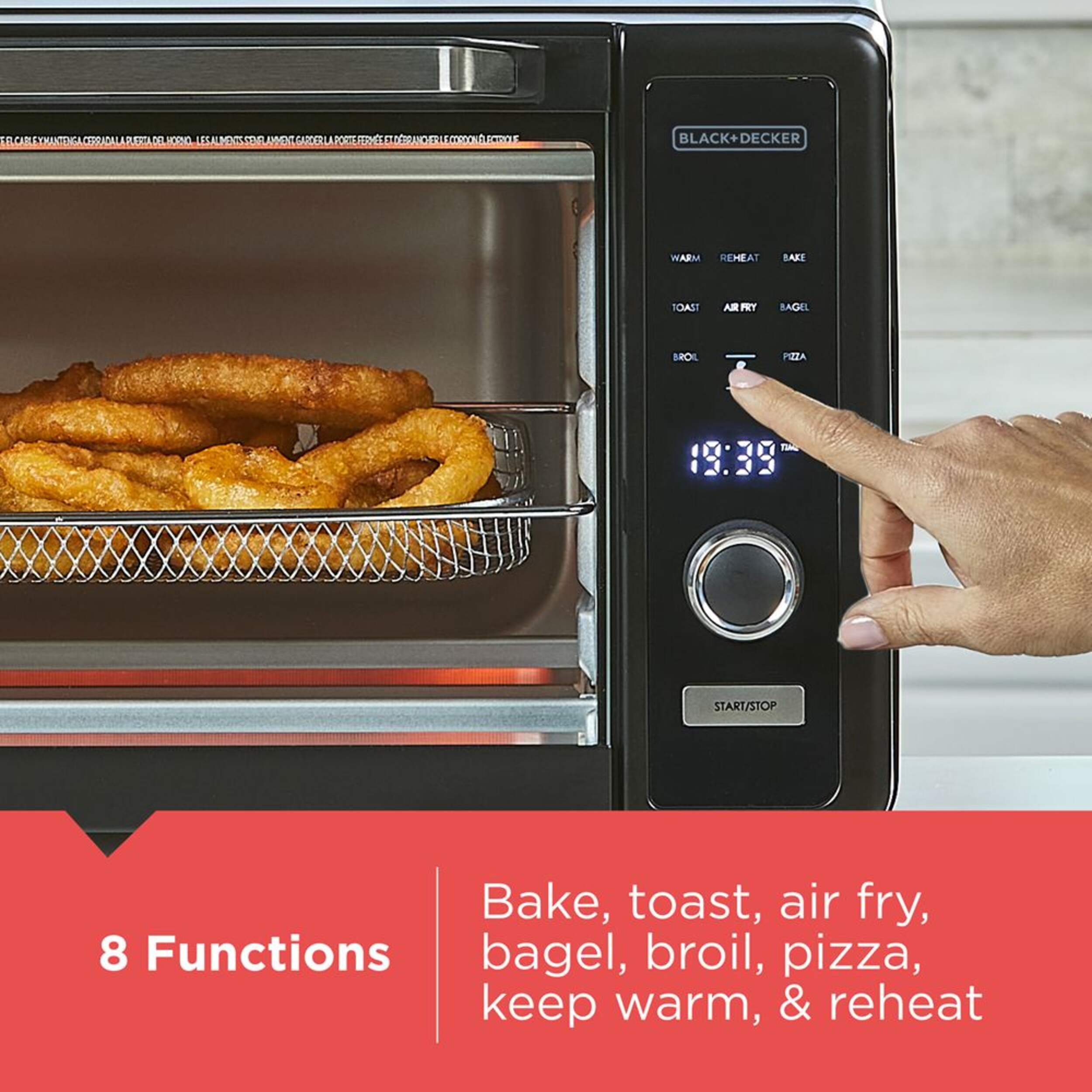 8 One-Touch cooking functions: Air fry, bake, broil, bagel, pizza, keep warm, toast, reheat
