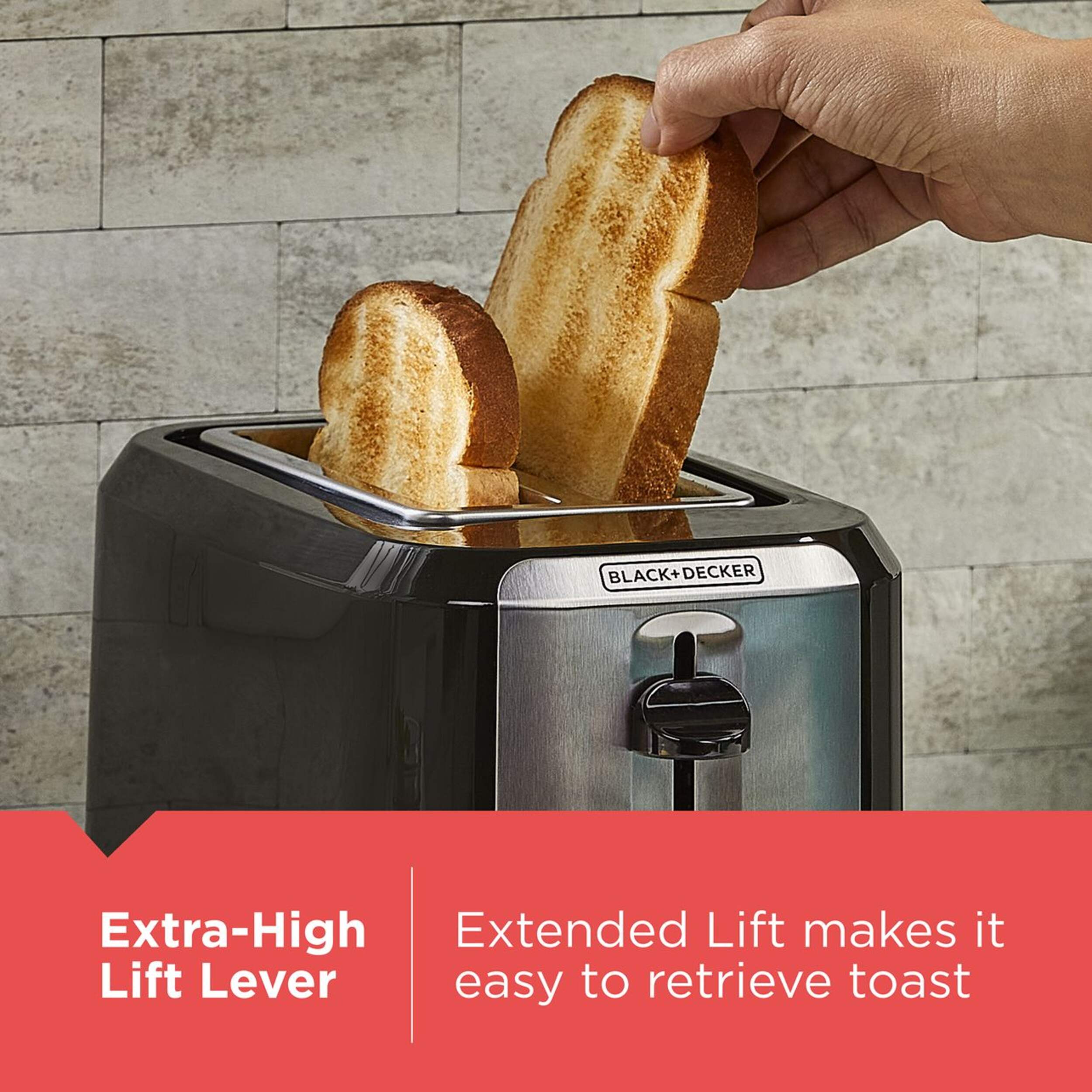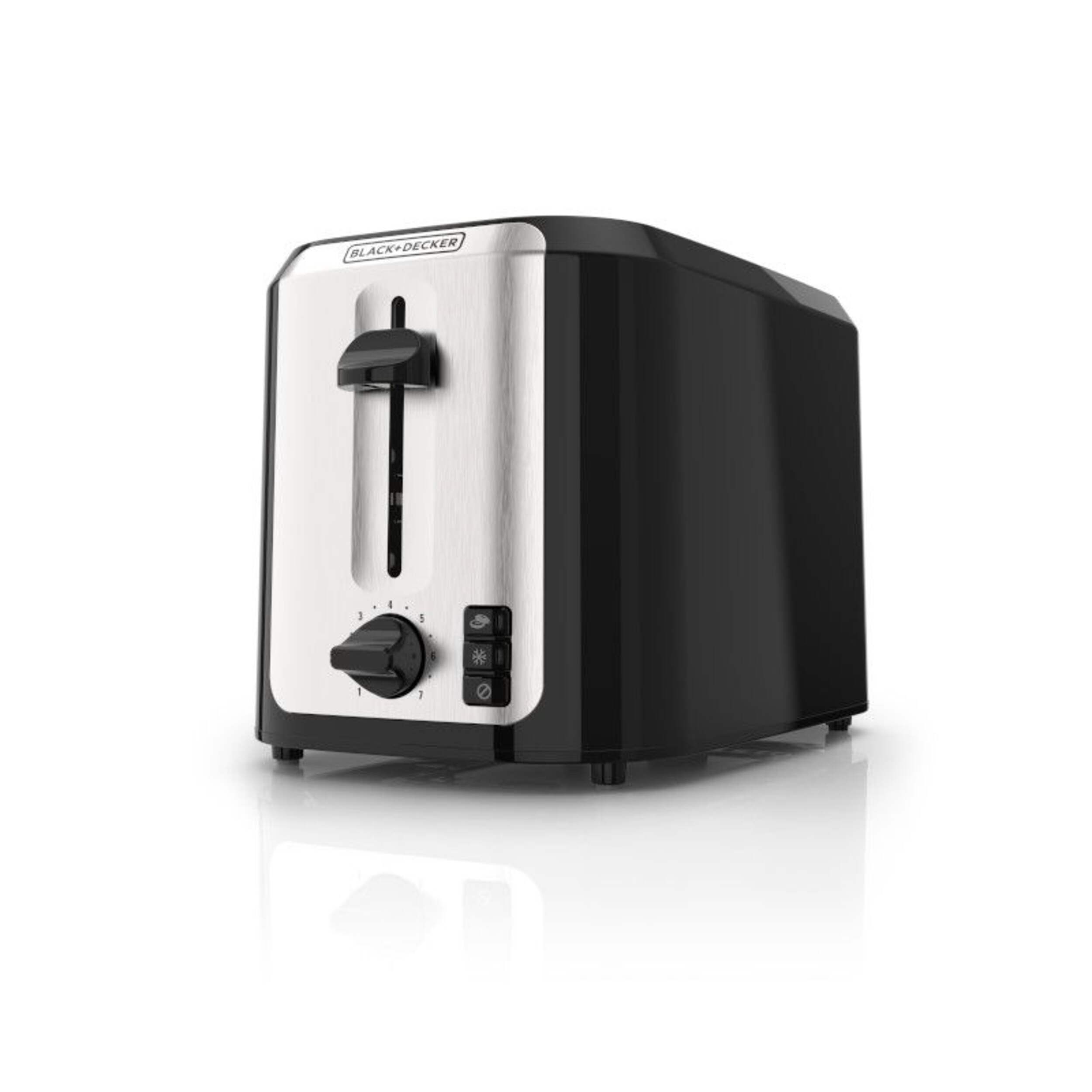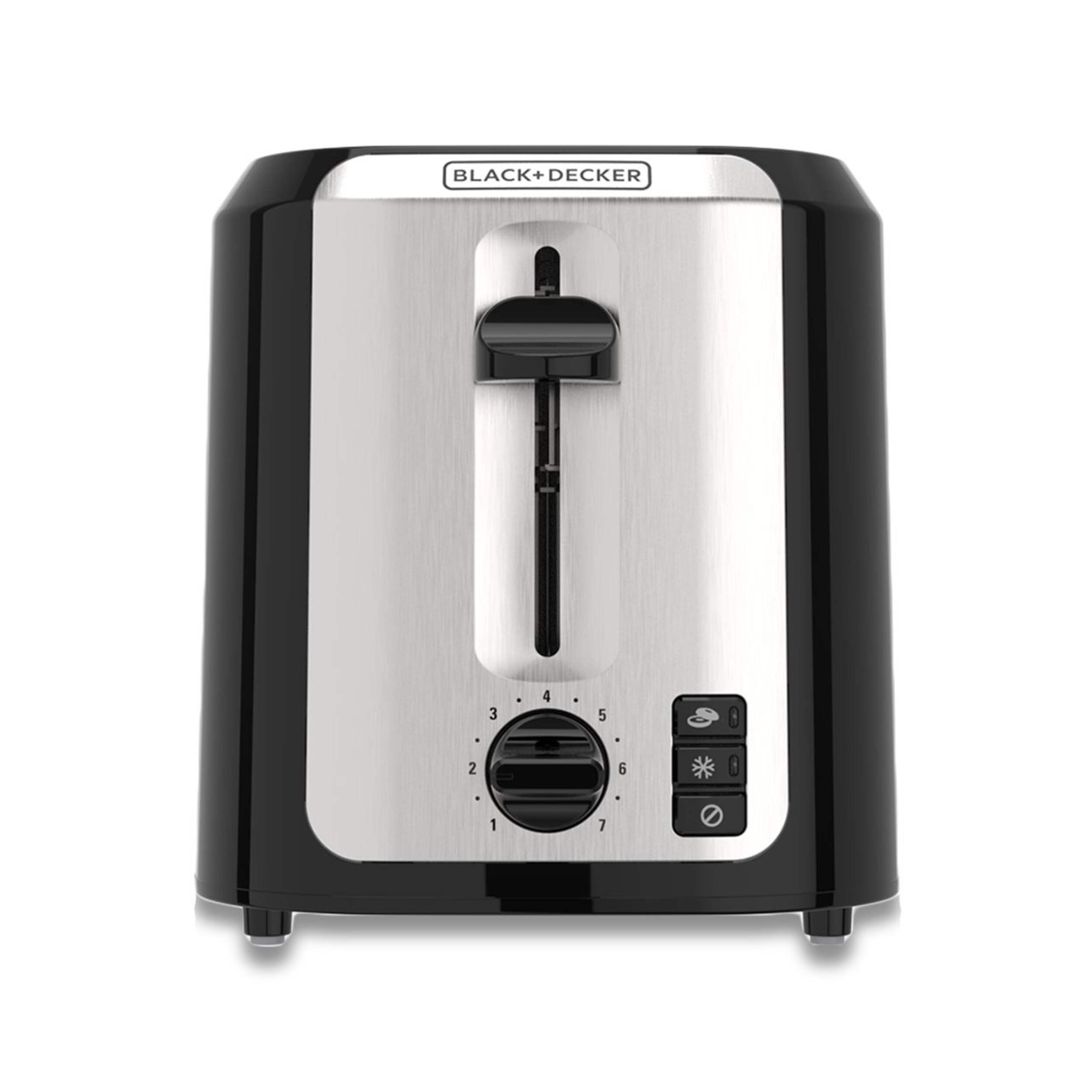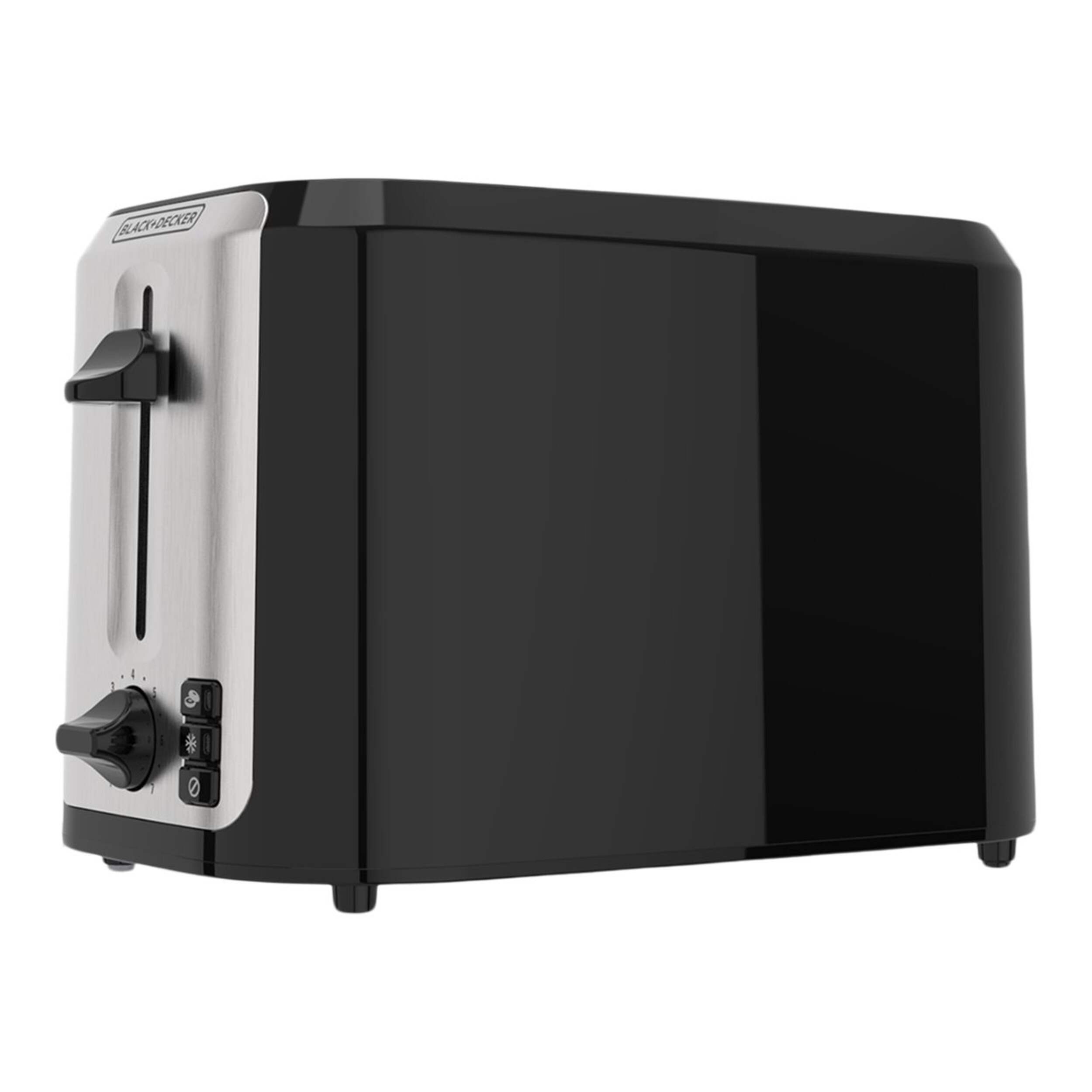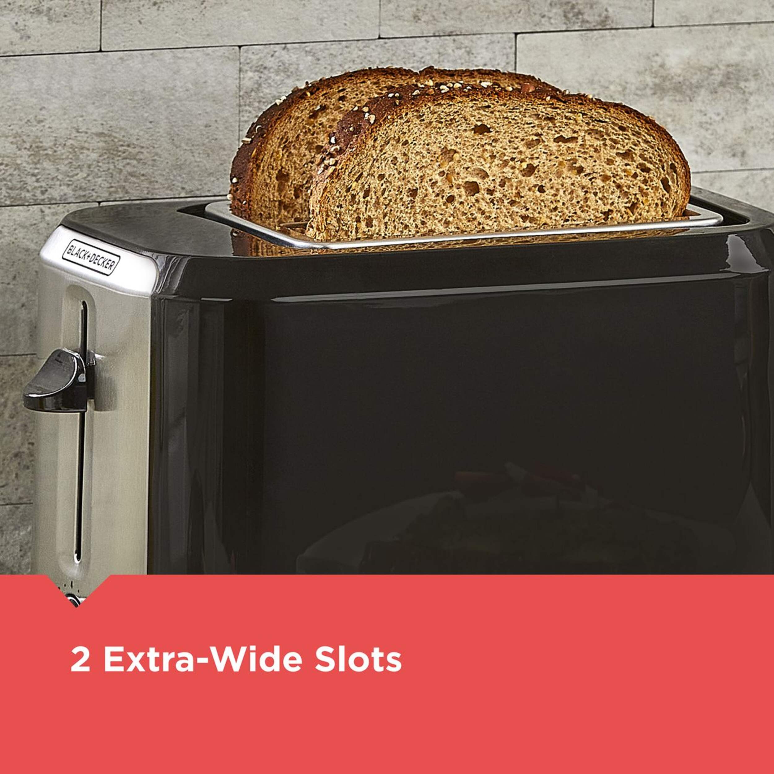 Toast your favourite breads to perfection with the Black & Decker Extra Wide Slots Toaster that features seven toast shade settings. This two-slice toaster accommodates thicker artisan breads and bagels easily for the perfect sandwich or ideal accompaniment to your breakfast. This stylish black and chrome toaster features self-adjusting toast guides and a high-lift lever for easy toast removal, so you can enjoy perfectly toasted items every time.