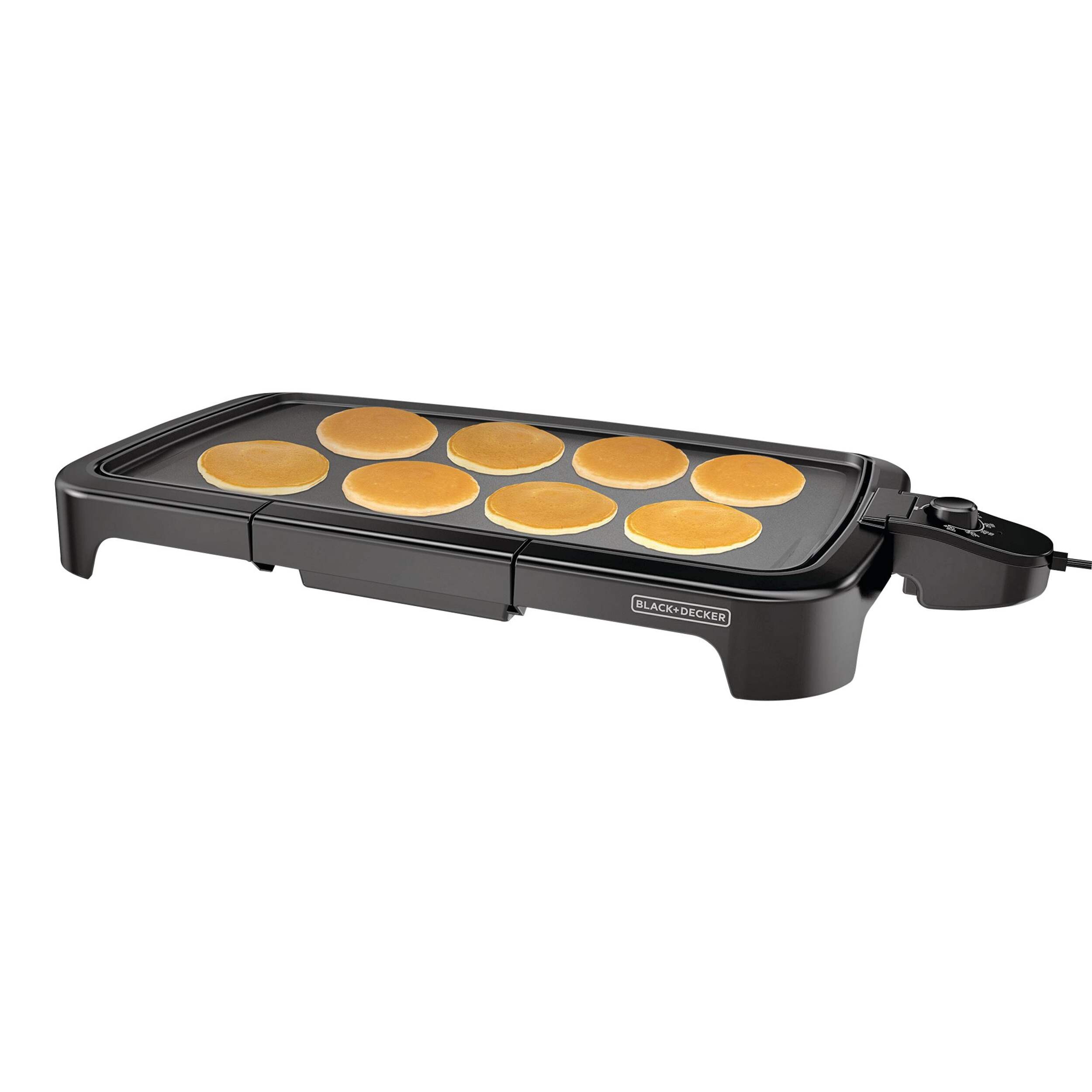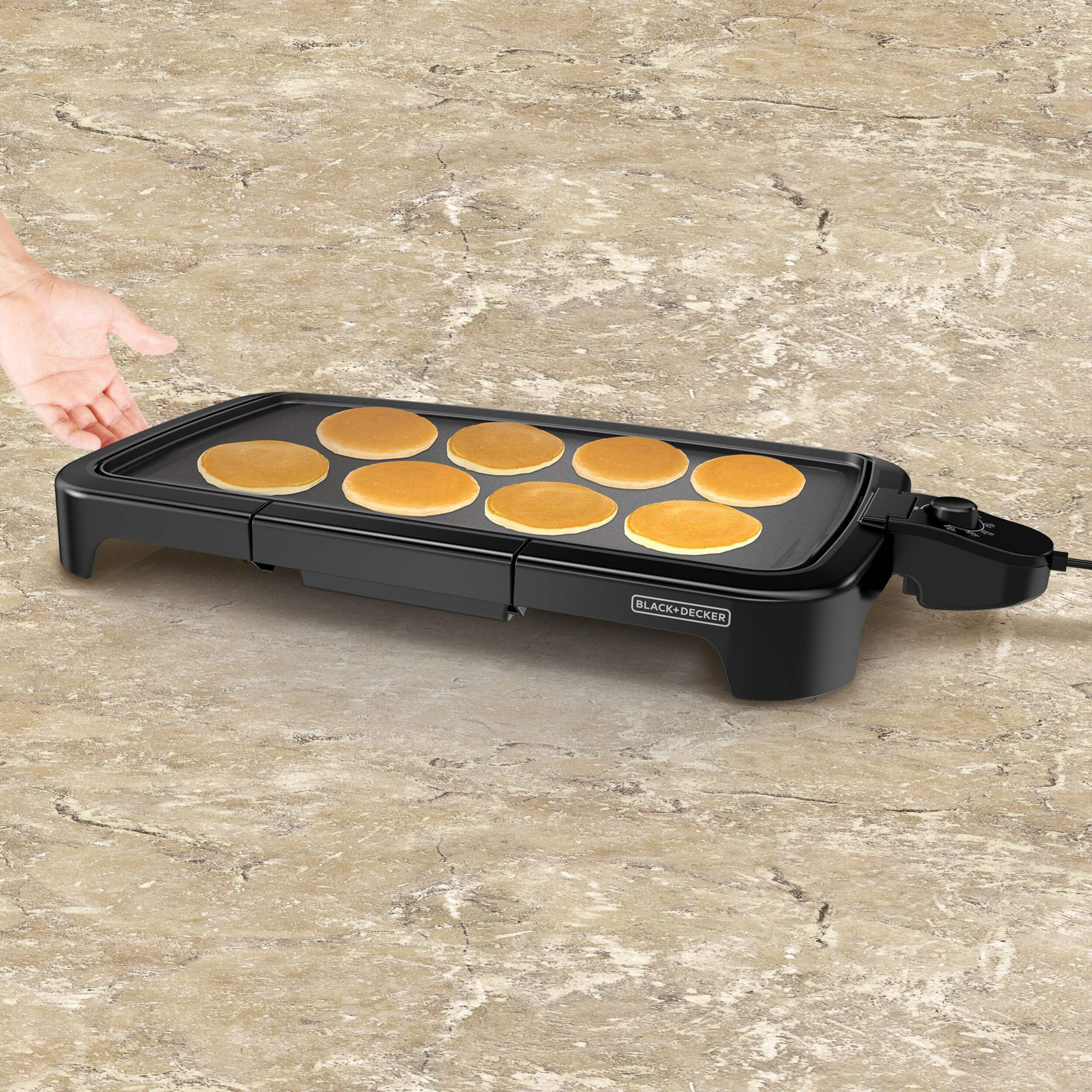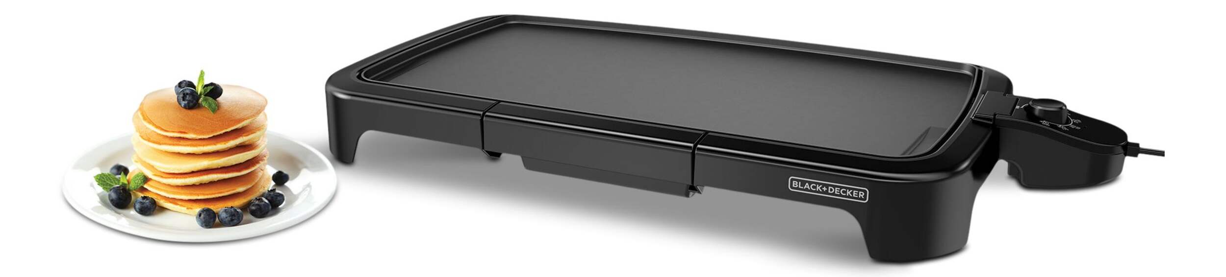 Create delicious meals easily with the Black & Decker Family Sized Electric Griddle. This large griddle combines fast and even heating with variable temperature controls, making it easy to create all your breakfast favourites, from bacon and eggs to pancakes and hash browns. Everything comes out together at the perfect temperature. Plus, the large non-stick surface and slide-out drip tray make cleanup a breeze.