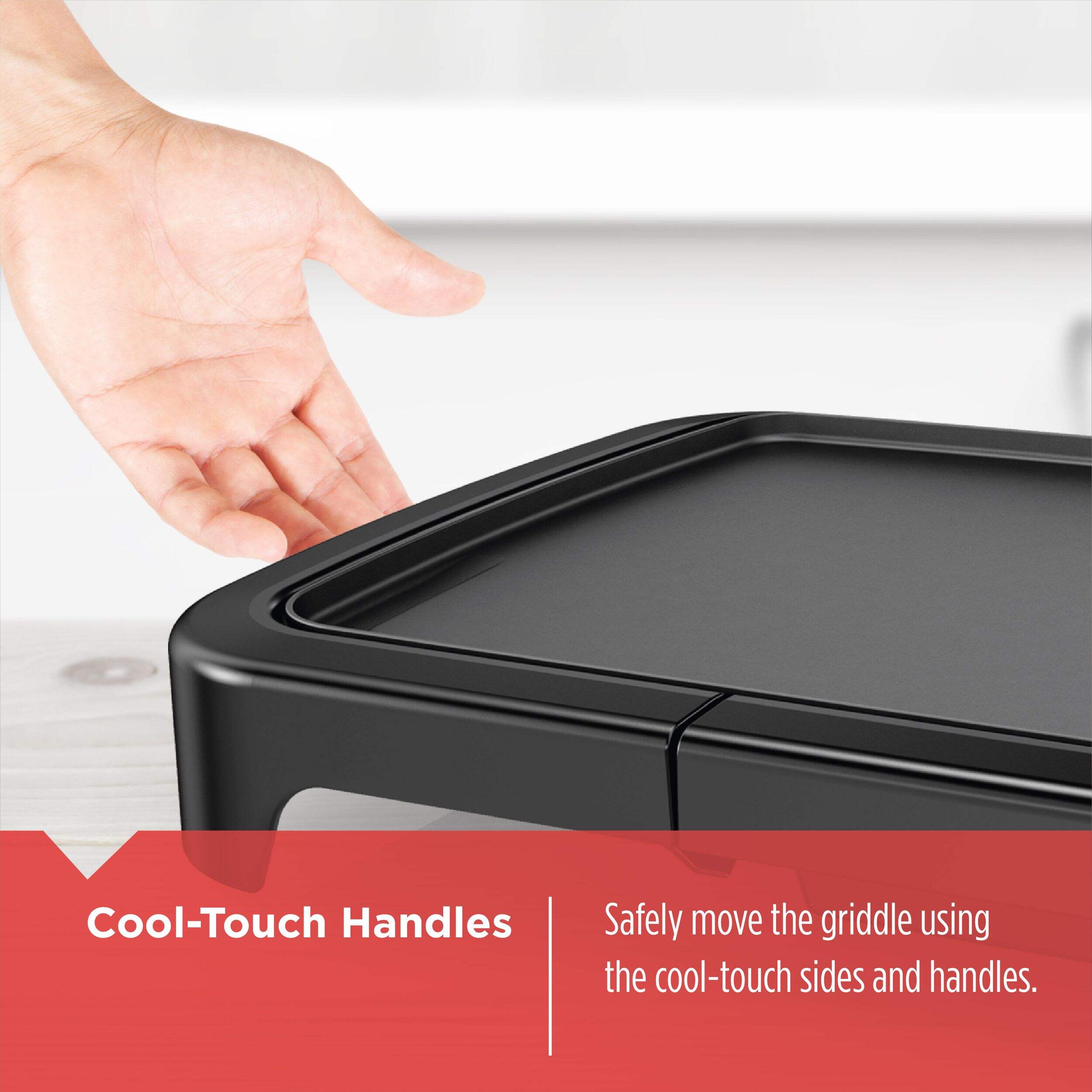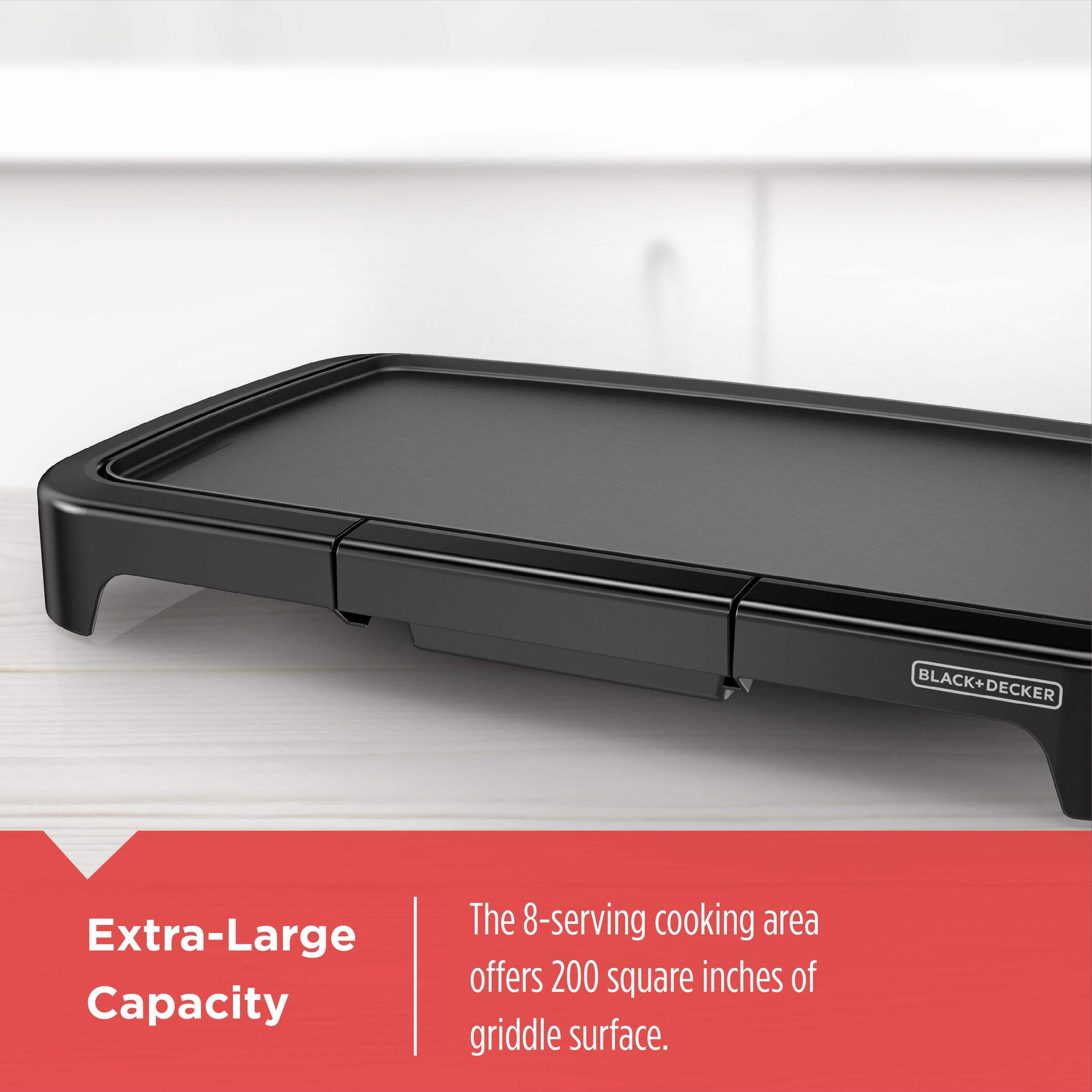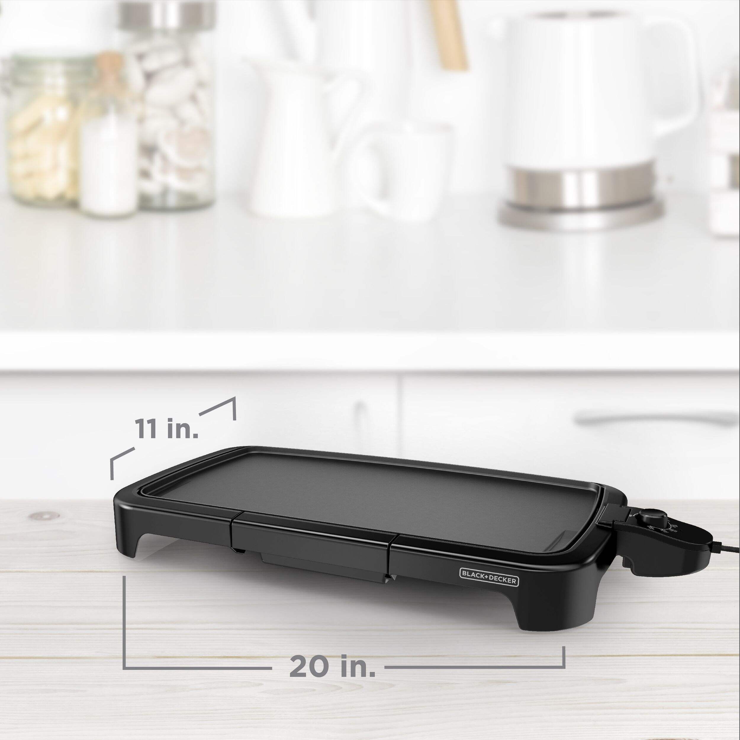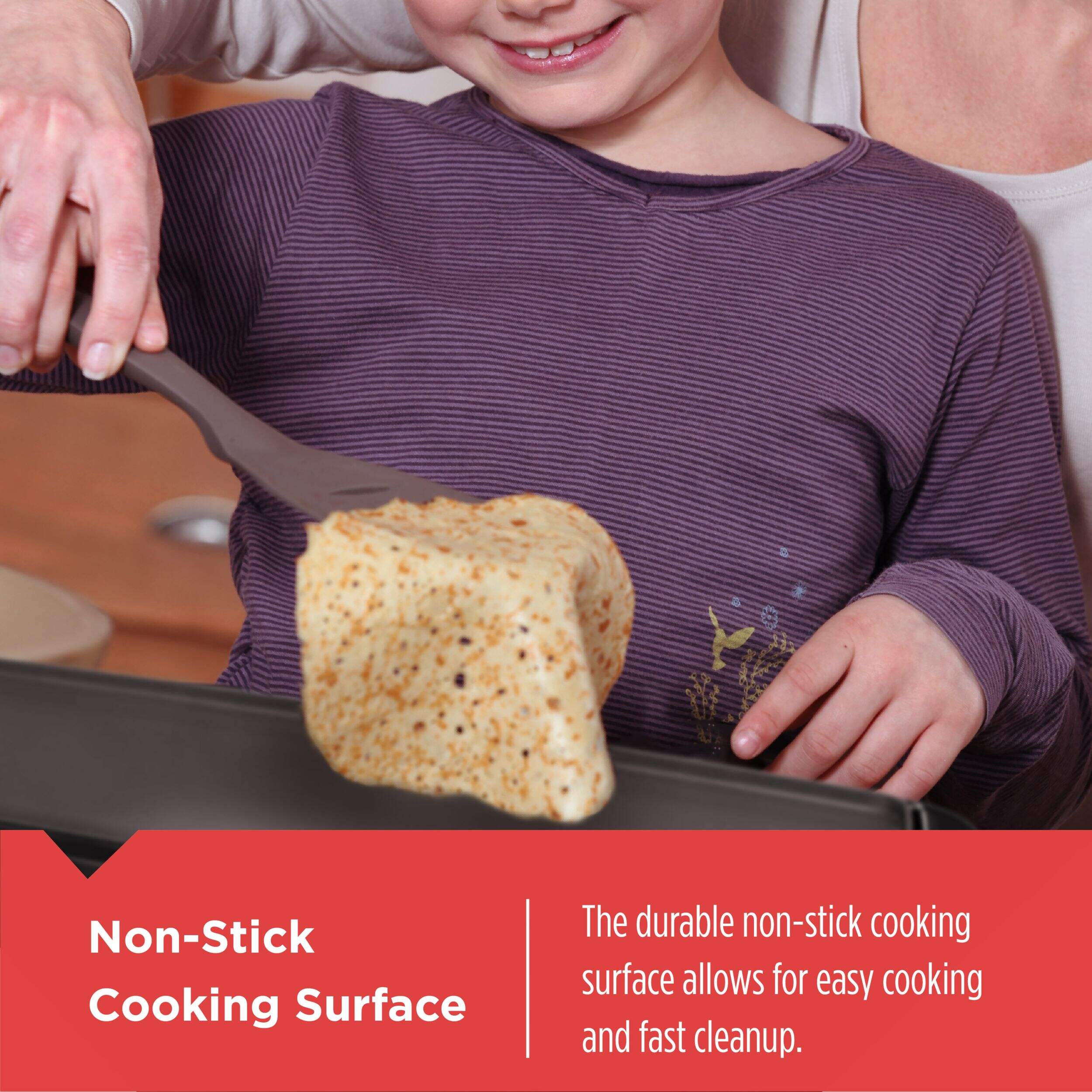 Create delicious meals easily with the Black & Decker Family Sized Electric Griddle. This large griddle combines fast and even heating with variable temperature controls, making it easy to create all your breakfast favourites, from bacon and eggs to pancakes and hash browns. Everything comes out together at the perfect temperature. Plus, the large non-stick surface and slide-out drip tray make cleanup a breeze.