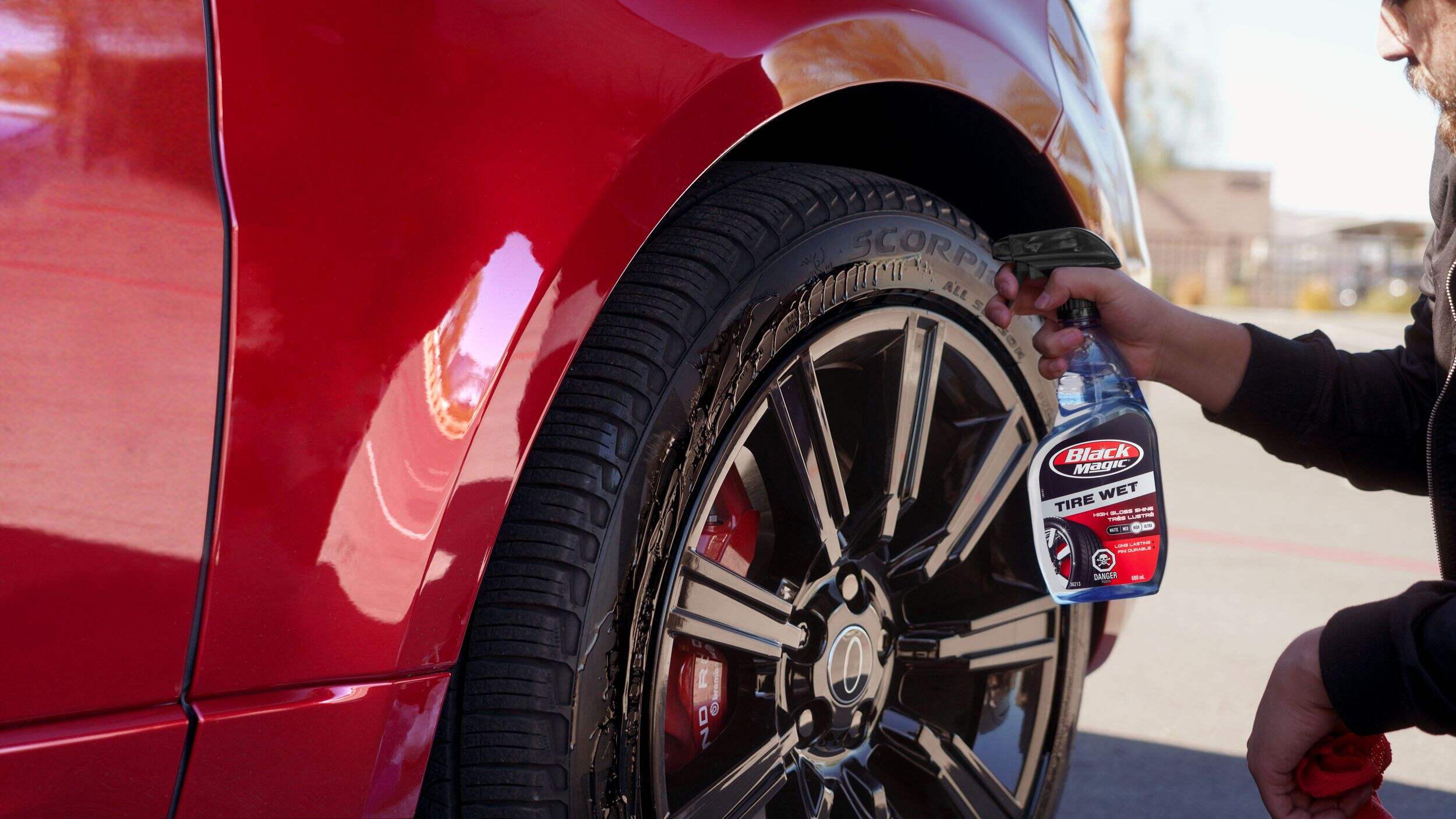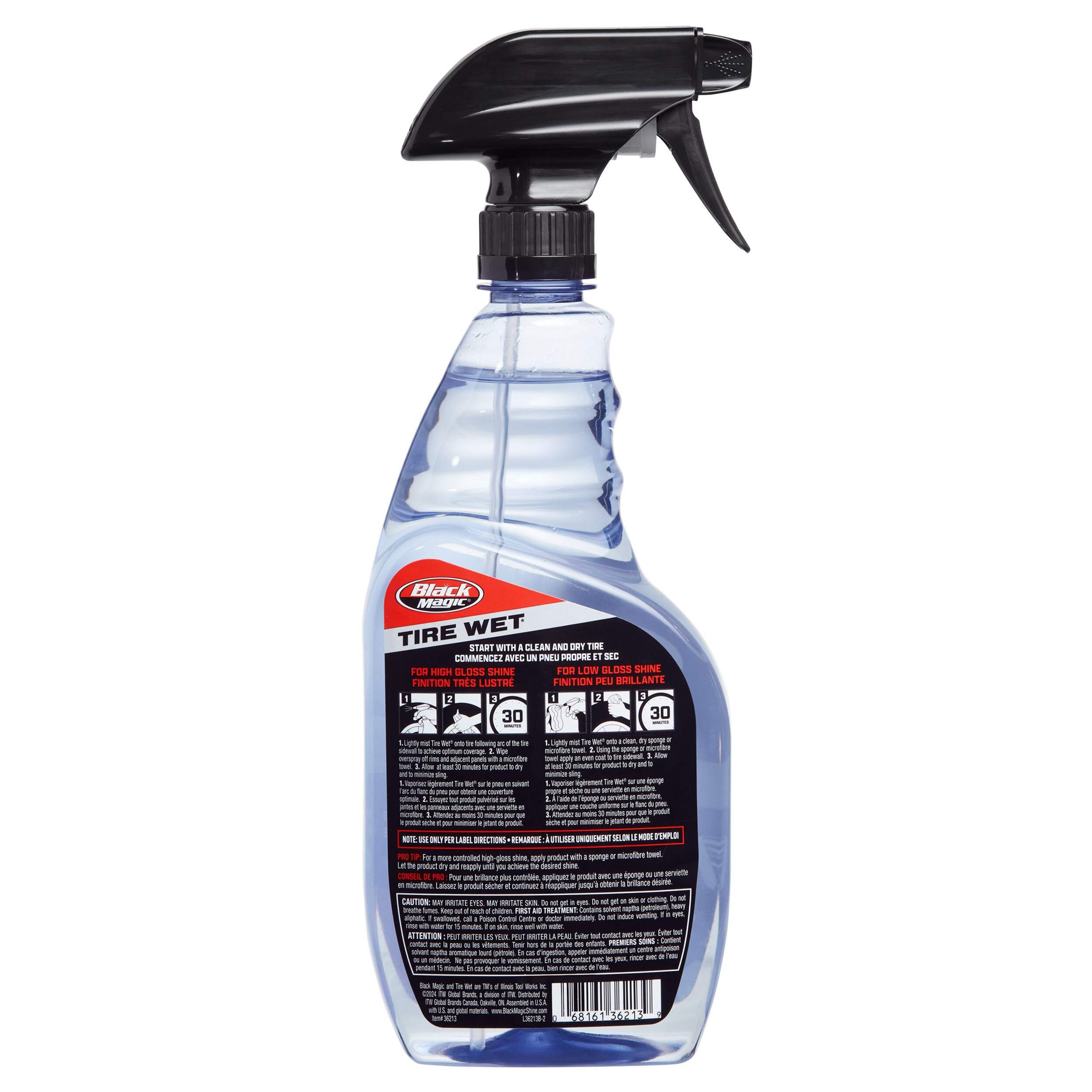 Make your tires shine with the Black Magic Long Lasting Shine Spray. This car cleaning product provides a high gloss, wet-look shine to your tires while protecting against cracking, swelling, dirt, and more. The liquid formula is specially designed to penetrate grime and leave a streak-free, durable shine. This tire spray goes on clear but turns red when activated, allowing you to see exactly where you've applied it on the wheel.