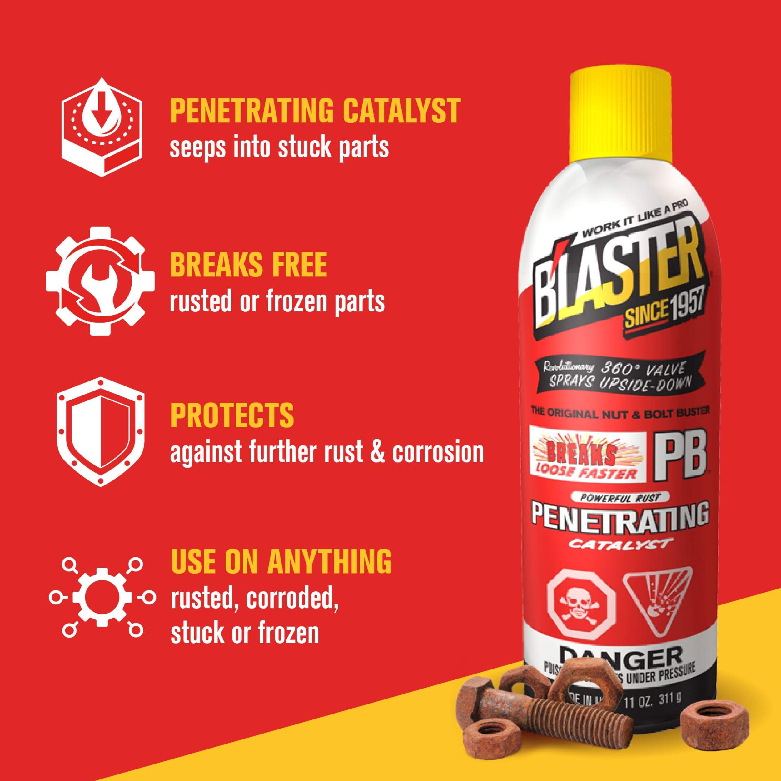 PB B'laster Rust Penetrant is a powerful penetrating catalyst that can quickly bust loose rusted or frozen parts caused by rust and corrosion. This penetrant quickly busts loose rusted or frozen parts caused by rust and corrosion. It also contains a non-evaporating lubricant that saves time and equipment and protects against further rust and corrosion.